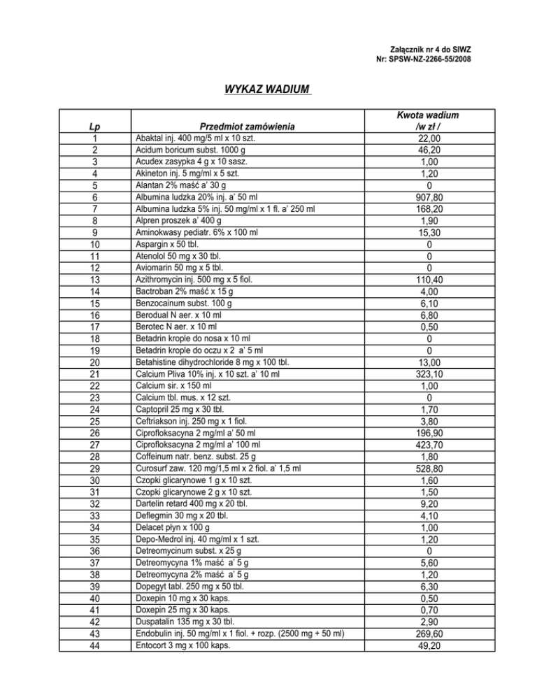 Załącznik nr 4 do SIWZ Nr: SPSW-NZ-2266-55/2008 WYKAZ WADIUM Lp 1 2 3 4 5 6 7 8 9 10 11 12 13 14 15 16 17 18 19 20 21 22 23 24 25 26 27 28 29 30 31 32 33 34 35 36 37 38 39 40 41 42 43 44 Przedmiot zamówienia Abaktal inj. 400 mg/5 ml x 10 szt. Acidum boricum subst. 1000 g Acudex zasypka 4 g x 10 sasz. Akineton inj. 5 mg/ml x 5 szt. Alantan 2% maść a’ 30 g Albumina ludzka 20% inj. a’ 50 ml Albumina ludzka 5% inj. 50 mg/ml x 1 fl. a’ 250 ml Alpren proszek a’ 400 g Aminokwasy pediatr. 6% x 100 ml Aspargin x 50 tbl. Atenolol 50 mg x 30 tbl. Aviomarin 50 mg x 5 tbl. Azithromycin inj. 500 mg x 5 fiol. Bactroban 2% maść x 15 g Benzocainum subst. 100 g Berodual N aer. x 10 ml Berotec N aer. x 10 ml Betadrin krople do nosa x 10 ml Betadrin krople do oczu x 2 a’ 5 ml Betahistine dihydrochloride 8 mg x 100 tbl. Calcium Pliva 10% inj. x 10 szt. a’ 10 ml Calcium sir. x 150 ml Calcium tbl. mus. x 12 szt. Captopril 25 mg x 30 tbl. Ceftriakson inj. 250 mg x 1 fiol. Ciprofloksacyna 2 mg/ml a’ 50 ml Ciprofloksacyna 2 mg/ml a’ 100 ml Coffeinum natr. benz. subst. 25 g Curosurf zaw. 120 mg/1,5 ml x 2 fiol. a’ 1,5 ml Czopki glicarynowe 1 g x 10 szt. Czopki glicarynowe 2 g x 10 szt. Dartelin retard 400 mg x 20 tbl. Deflegmin 30 mg x 20 tbl. Delacet płyn x 100 g Depo-Medrol inj. 40 mg/ml x 1 szt. Detreomycinum subst. x 25 g Detreomycyna 1% maść a’ 5 g Detreomycyna 2% maść a’ 5 g Dopegyt tabl. 250 mg x 50 tbl. Doxepin 10 mg x 30 kaps. Doxepin 25 mg x 30 kaps. Duspatalin 135 mg x 30 tbl. Endobulin inj. 50 mg/ml x 1 fiol. + rozp. (2500 mg + 50 ml) Entocort 3 mg x 100 kaps. Kwota wadium /w zł / 22,00 46,20 1,00 1,20 0 907,80 168,20 1,90 15,30 0 0 0 110,40 4,00 6,10 6,80 0,50 0 0 13,00 323,10 1,00 0 1,70 3,80 196,90 423,70 1,80 528,80 1,60 1,50 9,20 4,10 1,00 1,20 0 5,60 1,20 6,30 0,50 0,70 2,90 269,60 49,20 45 46 47 48 49 50 51 52 53 54 55 56 57 58 59 60 61 62 63 64 65 66 67 68 69 70 71 72 73 74 75 76 77 78 79 80 81 82 83 84 85 86 87 88 89 90 91 92 93 94 95 Esputicon krople doustne (980 mg/g) x 5 g Etoposide 100 mg x 10 szt. Fenoterol inj. 0,5 mg/10 ml x 15 szt. Ferrum inj. j.m. 100 mg/2 mg x 1 szt. Flegamina sir. 80 mg/100 ml x 120 ml Flixotide Dysk prosz. do inh. 250 µg 60 daw. Flixotide Dysk prosz. do inh. 500 µg 60 daw. Flixotide Dysk prosz. do inh. 50 µg 60 daw. Fraxiparine Multi 47500 j.m./5 ml x 10 fiol. a’ 5 ml + 10 filtrów antybakteryjnych Mini Spike + 100 strzykawek precyzyjnych a’1 ml Fulwestrant 250 mg/5 ml amp.-strz. Gasprid 10 mg x 30 tbl. Glucosum inj. 20% x 10 amp. a’ 10 ml Glucosum inj. 40% x 50 amp. a’ 10 ml Glycerolum płyn 86% x 1000 g Hemofer F prolongatum x 30 szt. Hemofer krople doustne (44 mg Fe2+/ml) x 10 ml Hemofer prolongatum x 30 szt. Hemorectal czopki x 10 szt. Ketotifen sir. 1 mg/5 ml x 100 ml Lacrimal krople do oczu x 2 but. a’ 5 ml Lactulosum 9,75 g/15 ml płyn x 500 ml Leucovorin Ca inj. 10 mg x 10 szt. Luminalum subst. X 10 g Maxitrol maść oczna x 3,5 g Methotrexate 2,5 mg x 50 tbl. Methotrexate sodium inj. 50 mg x 5 szt. Methotrexate sodium inj. 5 mg x 10 szt. Methotrexatum inj. 10 mg/ml x 10 amp. a’ 2 ml Methyleum coeruleum subst. x 5 g Mircera x amp.-strz. Mitomycin C inj. 10 mg x 1 fiol. Mitomycin C inj. 20 mg x 1 fiol. Mitomycin C inj. 2 mg x 10 fiol. Molsidomina 2 mg x 30 tbl. Molsidomina 4 mg x 30 tbl. Morphinum h/chlor. subst. x 1 g Naloxonum h/chlor. inj. 0,4 mg/ml x 10 szt. Nenatal proszek dla niemowląt x 400 g Nifuroksazyd zaw. (220 mg/5 ml) x 1 but. Nitroderm TTS 10 plast. transderm. x 10 szt. Nitroderm TTS 5 plast. transderm. x 10 szt. Nastatyna 100000 j.m. x 10 tbl. dopochwowych Nastatyna 500000 j.m. x 16 draż. Nastatyna subst. x 5 g Ovestin 0,5 mg glob. x 15 szt. Ovestin krem (0,5 mg/0,5 g) x 15 g + aplikator Oxycort 3% maść x 10 g Pantoprazolum tab. 20 mg x 28 szt. Pantoprazolum tab. 40 mg x 28 szt. Paracetamol 500 mg x 1000 tbl. Pernazinum 100 mg x 30 tbl. 2,00 34,20 7,60 0,90 0 4,60 7,70 1,50 478,30 189,40 1,20 7,50 171,70 12,00 3,90 0 0,70 0,90 0 1,30 76,30 312,40 2,10 1,60 3,60 5,70 9,60 10,50 4,60 1 190,90 23,70 22,20 5,90 0,50 1,00 2,20 1,80 2,60 5,40 4,00 6,30 1,20 0,70 5,70 1,50 1,50 0,60 0,50 1,80 141,20 0 96 97 98 99 100 101 102 103 104 105 106 107 108 109 110 111 112 113 114 115 116 117 118 119 120 121 122 123 124 125 126 127 128 129 130 131 132 133 134 135 136 137 138 139 140 Pimafucort maść x 15 g Platidiam inj. 50 mg x 10 fiol. Podkłady gumowane 170 cm x 140 Povidone jodine 10% płyn x 250 ml Preductal MR x 60 tbl. Pridinol 5 mg x 50 tbl. Promazyna 25 mg x 60 tbl. Promazyna 50 mg x 60 tbl. Promethazine 25 mg x 20 szt. Promethazine inj. 50 mg/2 ml x 10 szt. Promethazine sir. 5 mg/5 ml x 150 ml Protaminum sulfur. inj. 0,05 g/5 ml x 1 szt. Proxacin 0,3% krople do oczu Pyralgin 500 mg x 10 tbl. Pyralginum subst. x 100 g Rytmonorm inj. 70 mg/20 ml x 5 szt. Sachol żel stom. x 10 g Salbutamol inj. 0,5 mg /1 ml x 10 szt. Selegiline 5 mg x 60 szt. Serevent Dysk areozol Signopam 10 mg x 20 tbl. Solcoseryl 10% żel x 20 g Solcoseryl 5% maść x 20 g Streptokinaze inj. 1500000 j.m. x 1 szt. Sulfarinol krople do nosa x 20 ml Talcum subst. x 1000 g Tantum rosa saszetki x 10 szt. Thiocodin tbl. x 10 tbl. Tinctura menthae piperitae x 35 g Topotecanum 4 mg x 1 fiol. Tormentiol maść x 20 g Trimebutine 100 mg x 30 tbl. Trimebutine granulat do przyg. zaw. (7,87 mg/g) x 250 ml Trombina inj. 400 j.m. x 5 szt. + rozp. Vagothyl płyn x 50 g Vancomycin inj. 1000 mg x 1 fiol. Vitaminum A liquidum (50000 j.m./ml) x 1 but. a’ 10 ml Vitaminum B6 50 mg x 50 tbl. Vitaminum B6 inj. 50 mg/2 ml x 5 szt. Vitaminum C inj. 100 mg/2 ml x 10 szt. Vitaminum C inj. 500 mg/5 ml x 10 szt. Vitaminum E liquidum (300 mg/ml) x 1 but. a’ 10 ml Vratizolin 3% maść x 15 g Zentel 200 mg x 2 tbl. Zometa inj. 4 mg x 1 fiol. Kwota wadium ogółem: 1,60 183,40 16,00 2,80 13,50 0,60 1,00 2,20 0 3,70 0 7,20 1,00 33,10 1,40 3,40 0 0,70 0,80 2,50 0,50 1,20 0,50 10,70 1,20 1,20 1,00 37,60 0,80 122,00 0 6,90 1,60 11,90 0,80 957,70 1,50 0 1,10 3,9