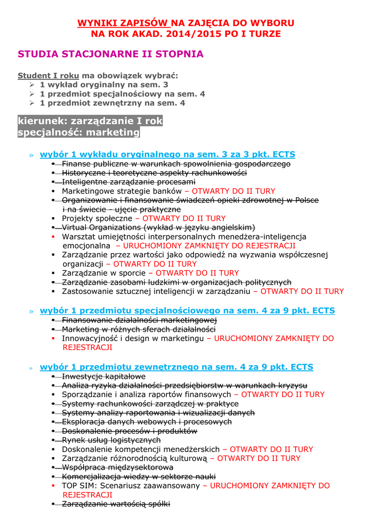 WYNIKI ZAPISÓW NA ZAJĘCIA DO WYBORU NA ROK AKAD. 2014/2015 PO I TURZE STUDIA STACJONARNE II STOPNIA Student I roku ma obowiązek wybrać: 1 wykład oryginalny na sem. 3 1 przedmiot specjalnościowy na sem. 4 1 przedmiot zewnętrzny na sem. 4 kierunek: zarządzanie I rok specjalność: marketing » wybór 1 wykładu oryginalnego na sem. 3 za 3 pkt. ECTS Finanse publiczne w warunkach spowolnienia gospodarczego Historyczne i teoretyczne aspekty rachunkowości Inteligentne zarządzanie procesami Marketingowe strategie banków – OTWARTY DO II TURY Organizowanie i finansowanie świadczeń opieki zdrowotnej w Polsce i na świecie - ujęcie praktyczne Projekty społeczne – OTWARTY DO II TURY Virtual Organizations (wykład w języku angielskim) Warsztat umiejętności interpersonalnych menedżera-inteligencja emocjonalna – URUCHOMIONY ZAMKNIĘTY DO REJESTRACJI Zarządzanie przez wartości jako odpowiedź na wyzwania współczesnej organizacji – OTWARTY DO II TURY Zarządzanie w sporcie – OTWARTY DO II TURY Zarządzanie zasobami ludzkimi w organizacjach politycznych Zastosowanie sztucznej inteligencji w zarządzaniu – OTWARTY DO II TURY » wybór 1 przedmiotu specjalnościowego na sem. 4 za 9 pkt. ECTS Finansowanie działalności marketingowej Marketing w różnych sferach działalności Innowacyjność i design w marketingu – URUCHOMIONY ZAMKNIĘTY DO REJESTRACJI » wybór 1 przedmiotu zewnętrznego na sem. 4 za 9 pkt. ECTS Inwestycje kapitałowe Analiza ryzyka działalności przedsiębiorstw w warunkach kryzysu Sporządzanie i analiza raportów finansowych – OTWARTY DO II TURY Systemy rachunkowości zarządczej w praktyce Systemy analizy raportowania i wizualizacji danych Eksploracja danych webowych i procesowych Doskonalenie procesów i produktów Rynek usług logistycznych Doskonalenie kompetencji menedżerskich – OTWARTY DO II TURY Zarządzanie różnorodnością kulturową – OTWARTY DO II TURY Współpraca międzysektorowa Komercjalizacja wiedzy w sektorze nauki TOP SIM: Scenariusz zaawansowany – URUCHOMIONY ZAMKNIĘTY DO REJESTRACJI Zarządzanie wartością spółki Psycho-społeczne problemy zarządzania zasobami ludzkim – OTWARTY DO II TURY Rozwój umiejętności zarządzania zasobami ludzkimi – URUCHOMIONY ZAMKNIĘTY DO REJESTRACJI kierunek: zarządzanie I rok specjalność: zarządzanie biznesem (studia dla nieekonomistów) » wybór 1 wykładu oryginalnego na sem. 3 za 3 pkt. ECTS Finanse publiczne w warunkach spowolnienia gospodarczego Historyczne i teoretyczne aspekty rachunkowości Inteligentne zarządzanie procesami Marketingowe strategie banków – OTWARTY DO II TURY Organizowanie i finansowanie świadczeń opieki zdrowotnej w Polsce i na świecie - ujęcie praktyczne Projekty społeczne – OTWARTY DO II TURY Virtual Organizations (wykład w języku angielskim) Warsztat umiejętności interpersonalnych menedżera-inteligencja emocjonalna – URUCHOMIONY ZAMKNIĘTY DO REJESTRACJI Zarządzanie przez wartości jako odpowiedź na wyzwania współczesnej organizacji – OTWARTY DO II TURY Zarządzanie w sporcie – OTWARTY DO II TURY Zarządzanie zasobami ludzkimi w organizacjach politycznych Zastosowanie sztucznej inteligencji w zarządzaniu – OTWARTY DO II TURY » wybór 1 przedmiotu specjalnościowego na sem. 4 za 9 pkt. ECTS Ryzyko i kryzys w organizacji – URUCHOMIONY ZAMKNIĘTY DO REJESTRACJI Zarządzanie różnorodnością kulturową – URUCHOMIONY ZAMKNIĘTY DO REJESTRACJI » wybór 1 przedmiotu zewnętrznego na sem. 4 za 9 pkt. ECTS Inwestycje kapitałowe Analiza ryzyka działalności przedsiębiorstw w warunkach kryzysu Sporządzanie i analiza raportów finansowych – OTWARTY DO II TURY Systemy rachunkowości zarządczej w praktyce Systemy analizy raportowania i wizualizacji danych Eksploracja danych webowych i procesowych Doskonalenie procesów i produktów Rynek usług logistycznych Social media i marketing mobilny – OTWARTY DO II TURY Komercjalizacja nowych technologii Współpraca międzysektorowa Komercjalizacja wiedzy w sektorze nauki TOP SIM: Scenariusz zaawansowany – URUCHOMIONY ZAMKNIĘTY DO REJESTRACJI Zarządzanie wartością spółki Psycho-społeczne problemy zarządzania zasobami ludzkim – OTWARTY DO II TURY Rozwój umiejętności zarządzania zasobami ludzkimi – URUCHOMIONY ZAMKNIĘTY DO REJESTRACJI kierunek: zarządzanie I rok specjalność: zarządzanie rozwojem przedsiębiorstwa » wybór 1 wykładu oryginalnego na sem. 3 za 3 pkt. ECTS Finanse publiczne w warunkach spowolnienia gospodarczego Historyczne i teoretyczne aspekty rachunkowości Inteligentne zarządzanie procesami Marketingowe strategie banków – OTWARTY DO II TURY Organizowanie i finansowanie świadczeń opieki zdrowotnej w Polsce i na świecie - ujęcie praktyczne Projekty społeczne – OTWARTY DO II TURY Virtual Organizations (wykład w języku angielskim) Warsztat umiejętności interpersonalnych menedżera-inteligencja emocjonalna – URUCHOMIONY ZAMKNIĘTY DO REJESTRACJI Zarządzanie przez wartości jako odpowiedź na wyzwania współczesnej organizacji – OTWARTY DO II TURY Zarządzanie w sporcie – OTWARTY DO II TURY Zarządzanie zasobami ludzkimi w organizacjach politycznych Zastosowanie sztucznej inteligencji w zarządzaniu – OTWARTY DO II TURY » wybór 1 przedmiotu specjalnościowego na sem. 4 za 9 pkt. ECTS Zarządzanie firmą rodzinną Umiejętności menedżerskie – URUCHOMIONY ZAMKNIĘTY DO REJESTRACJI Strategie innowacyjne przedsiębiorstw » wybór 1 przedmiotu zewnętrznego na sem. 4 za 9 pkt. ECTS Inwestycje kapitałowe Analiza ryzyka działalności przedsiębiorstw w warunkach kryzysu Sporządzanie i analiza raportów finansowych – OTWARTY DO II TURY Systemy rachunkowości zarządczej w praktyce Systemy analizy raportowania i wizualizacji danych Eksploracja danych webowych i procesowych Doskonalenie procesów i produktów Rynek usług logistycznych Social media i marketing mobilny – OTWARTY DO II TURY Komercjalizacja nowy