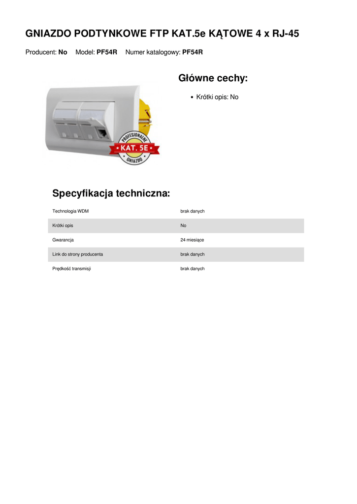 GNIAZDO PODTYNKOWE FTP KAT.5e KĄTOWE 4 x RJ-45 Producent: No Model: PF54R Numer katalogowy: PF54R Główne cechy: Krótki opis: No Specyfikacja techniczna: Technologia WDM brak danych Krótki opis No Gwarancja 24 miesiące Link do strony producenta brak danych Prędkość transmisji brak danych