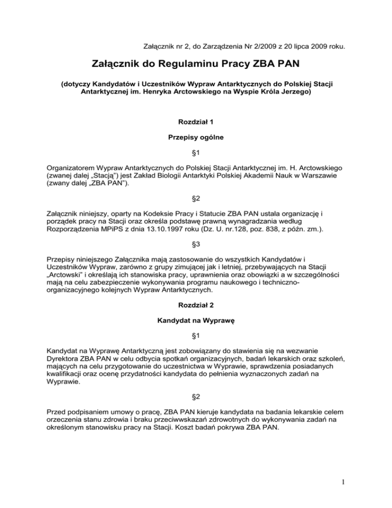 Załącznik nr 2, do Zarządzenia Nr 2/2009 z 20 lipca 2009 roku. Załącznik do Regulaminu Pracy ZBA PAN (dotyczy Kandydatów i Uczestników Wypraw Antarktycznych do Polskiej Stacji Antarktycznej im. Henryka Arctowskiego na Wyspie Króla Jerzego) Rozdział 1 Przepisy ogólne §1 Organizatorem Wypraw Antarktycznych do Polskiej Stacji Antarktycznej im. H. Arctowskiego (zwanej dalej „Stacją”) jest Zakład Biologii Antarktyki Polskiej Akademii Nauk w Warszawie (zwany dalej „ZBA PAN”). §2 Załącznik niniejszy, oparty na Kodeksie Pracy i Statucie ZBA PAN ustala organizację i porządek pracy na Stacji oraz określa podstawę prawną wynagradzania według Rozporządzenia MPiPS z dnia 13.10.1997 roku (Dz. U. nr.128, poz. 838, z późn. zm.). §3 Przepisy niniejszego Załącznika mają zastosowanie do wszystkich Kandydatów i Uczestników Wypraw, zarówno z grupy zimującej jak i letniej, przebywających na Stacji „Arctowski” i określają ich stanowiska pracy, uprawnienia oraz obowiązki a w szczególności mają na celu zabezpieczenie wykonywania programu naukowego i technicznoorganizacyjnego kolejnych Wypraw Antarktycznych. Rozdział 2 Kandydat na Wyprawę §1 Kandydat na Wyprawę Antarktyczną jest zobowiązany do stawienia się na wezwanie Dyrektora ZBA PAN w celu odbycia spotkań organizacyjnych, badań lekarskich oraz szkoleń, mających na celu przygotowanie do uczestnictwa w Wyprawie, sprawdzenia posiadanych kwalifikacji oraz ocenę przydatności kandydata do pełnienia wyznaczonych zadań na Wyprawie. §2 Przed podpisaniem umowy o pracę, ZBA PAN kieruje kandydata na badania lekarskie celem orzeczenia stanu zdrowia i braku przeciwwskazań zdrowotnych do wykonywania zadań na określonym stanowisku pracy na Stacji. Koszt badań pokrywa ZBA PAN. 1 §3 Kandydat zamieszkały poza granicami Warszawy, przyjeŜdŜa na wezwanie Dyrektora ZBA PAN najtańszym środkiem lokomocji. Koszt podróŜy pokrywa ZBA PAN. §4 Kandydat zakwalifikowany na Wyprawę jest zatrudniany w ZBA PAN na podstawie umowy o pracę na czas określony. Po podpisaniu umowy o pracę kandydat staje się Uczestnikiem Wyprawy grupy zimującej (przebywający na Stacji przez rok, w sezonie letnim i zimowym) lub Uczestnikiem Wyprawy grupy letniej (przebywający na Stacji tylko w sezonie letnim). Rozdział 3 Pracownik - Uczestnik Wyprawy §1 Bezpośrednim zwierzchnikiem Uczestnika Wyprawy jest Kierownik Wyprawy, wyznaczony przez Dyrektora ZBA PAN. §2 Uczestnikowi Wyprawy przysługuje wynagrodzenie określone w umowie o pracę: 1. Wynagrodzenie zasadnicze, 2. Dodatek za staŜ pracy, 3. Premia uznaniowa, kwartalna – pracodawca kaŜdorazowo podejmuje decyzję o jej przyznaniu. 4. Premia dodatkowa miesięczna, wypłacana włącznie od dnia przekroczenia granicy polskiej w drodze na Stację aŜ do dnia powrotu ze Stacji do Polski w wysokości ustalonej umową o pracę. 5. Premia stała miesięczna za ekstremalne warunki, wypłacana włącznie od dnia przybycia na Stację do dnia jej opuszczenia. 6. Kierownik Wyprawy i jego zastępca otrzymują dodatek funkcyjny Dla pracowników stale zatrudnionych w ZBA PAN a wyjeŜdŜających na Wyprawę w okresie letnim przysługuje tylko premia dodatkowa. §3 Wynagrodzenie za pracę przekazywane jest „z dołu”, do ostatniego dnia kaŜdego miesiąca, na rachunek bankowy wskazany przez Uczestnika Wyprawy. §4 Do obowiązków Uczestnika Wyprawy naleŜy: 1. Aktywny udział w pracach przygotowawczych do Wyprawy. 2. Rzetelne i aktywne wykonywanie pracy powierzonej, zleconej przez Kierownictwo Wyprawy. 3. Godne reprezentowanie za granicą Naszego Kraju, Polskiej Akademii Nauk i Polskiej Wyprawy Antarktycznej. 4. Przestrzeganie przepisów porządkowych, bezpieczeństwa i higieny pracy, przepisów przeciwpoŜarowych oraz przepisów dotyczących ochrony środowiska przyrodniczego. 2 5. Przestrzeganie obowiązujących zasad porządkujących Ŝycie codzienne na Stacji, ustalonych przez Kierownika Wyprawy. 6. Dbanie o koleŜeński stosunek do współpracowników i kształtowanie właściwej atmosfery współŜycia i współdziałania na Stacji. 7. Dbanie o mienie i wyposaŜenie oraz utrzymanie w gotowości do uŜytkowania sprzętu i urządzeń znajdujących się na Stacji. 8. Aktywny udział w pracach związanych z załadunkiem i wyładunkiem statku. W okresie tym zawieszone zostają wszelkie prace naukowe i techniczne, wszyscy Uczestnicy Wyprawy podlegają bezpośrednio Kierownikowi Technicznemu. 9. Czynny udział przy likwidacji skutków klęsk Ŝywiołowych. 10. Przestrzeganie tajemnicy państwowej i słuŜbowej. §5 1. KaŜdy z Uczestników Wyprawy jest zobowiązany do udzielania innym Uczestnikom niezbędnej pomocy i dbania o właściwą atmosferę pracy. 2. W szczególności kaŜdorazowo jest ustalany grafik wykonywania czynności gospodarczych w zakresie pomocy w kuchni i sprzątania wspólnych pomieszczeń oraz w zakresie dozoru agregatów prądotwórczych. 3. Czas wykonywania czynności opisanych w pkt. 2 (powyŜej) nie jest czasem pracy. §6 Podczas Wyprawy, miejscem pracy Uczestników Wyprawy jest Polska Stacja Antarktyczna Im. H. Arctowskiego. §7 1. Czas pracy na Stacji liczy się włącznie od dnia przypłynięcia Uczestnika Wyprawy na Stację do dnia jej opuszczenia. 2. Czas pracy uczestników Wyprawy ze względu na szczególne miejsce i ekstremalne warunki pobytowe określa się „zadaniowym czasem pracy”. Decydującym czynnikiem, który utrudnia określenie czasu rozpoczynania i kończenia pracy są warunki atmosferyczne. Od sprawności wykonywania zadań przez grupę techniczną zaleŜy bezpieczeństwo zarówno uczestników Wyprawy jak i bezpieczeństwo Stacji. 3. Pracownicy zatrudnieni w zadaniowym systemie czasu pracy są rozliczani z realizacji wymienionym systemem pracy, nie przysługuje wynagrodzenie za pracę w godzinach powierzonych im zadań a nie z czasu pracy. Pracownikowi objętemu wyŜej nadliczbowych, gdyŜ zwiększona ilość pracy w jednym dniu jest rekom
