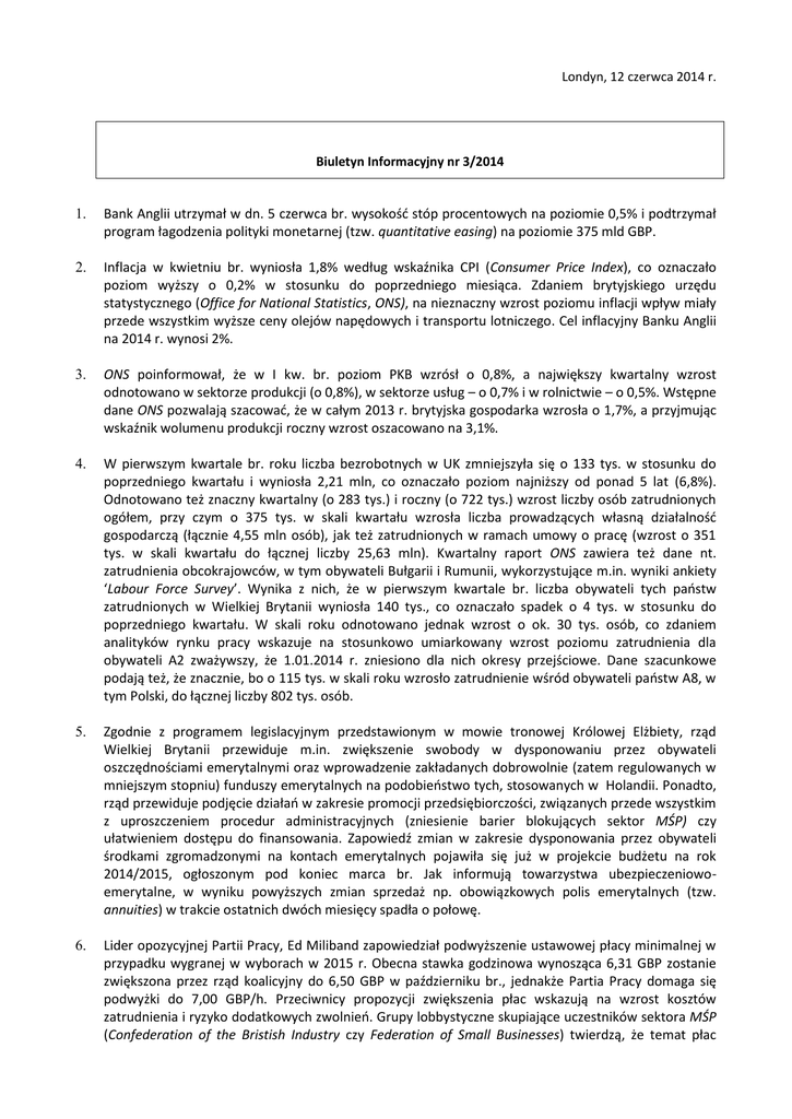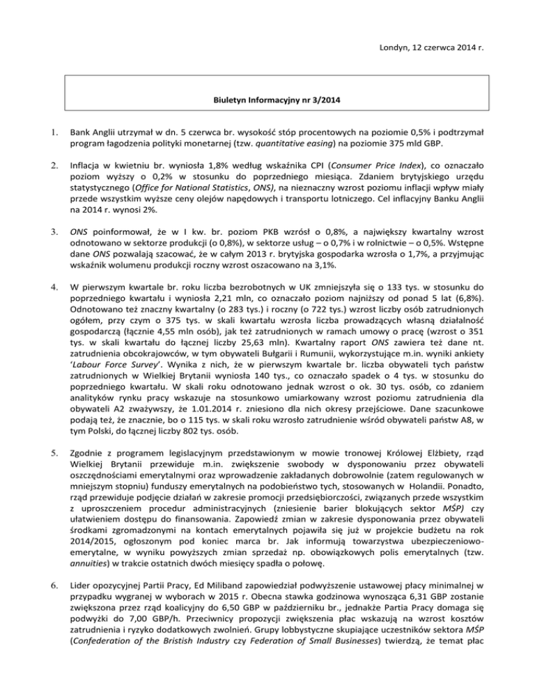 Londyn, 12 czerwca 2014 r. Biuletyn Informacyjny nr 3/2014 1. Bank Anglii utrzymał w dn. 5 czerwca br. wysokość stóp procentowych na poziomie 0,5% i podtrzymał program łagodzenia polityki monetarnej (tzw. quantitative easing) na poziomie 375 mld GBP. 2. Inflacja w kwietniu br. wyniosła 1,8% według wskaźnika CPI (Consumer Price Index), co oznaczało poziom wyższy o 0,2% w stosunku do poprzedniego miesiąca. Zdaniem brytyjskiego urzędu statystycznego (Office for National Statistics, ONS), na nieznaczny wzrost poziomu inflacji wpływ miały przede wszystkim wyższe ceny olejów napędowych i transportu lotniczego. Cel inflacyjny Banku Anglii na 2014 r. wynosi 2%. 3. ONS poinformował, że w I kw. br. poziom PKB wzrósł o 0,8%, a największy kwartalny wzrost odnotowano w sektorze produkcji (o 0,8%), w sektorze usług – o 0,7% i w rolnictwie – o 0,5%. Wstępne dane ONS pozwalają szacować, że w całym 2013 r. brytyjska gospodarka wzrosła o 1,7%, a przyjmując wskaźnik wolumenu produkcji roczny wzrost oszacowano na 3,1%. 4. W pierwszym kwartale br. roku liczba bezrobotnych w UK zmniejszyła się o 133 tys. w stosunku do poprzedniego kwartału i wyniosła 2,21 mln, co oznaczało poziom najniższy od ponad 5 lat (6,8%). Odnotowano też znaczny kwartalny (o 283 tys.) i roczny (o 722 tys.) wzrost liczby osób zatrudnionych ogółem, przy czym o 375 tys. w skali kwartału wzrosła liczba prowadzących własną działalność gospodarczą (łącznie 4,55 mln osób), jak też zatrudnionych w ramach umowy o pracę (wzrost o 351 tys. w skali kwartału do łącznej liczby 25,63 mln). Kwartalny raport ONS zawiera też dane nt. zatrudnienia obcokrajowców, w tym obywateli Bułgarii i Rumunii, wykorzystujące m.in. wyniki ankiety ‘Labour Force Survey’. Wynika z nich, że w pierwszym kwartale br. liczba obywateli tych państw zatrudnionych w Wielkiej Brytanii wyniosła 140 tys., co oznaczało spadek o 4 tys. w stosunku do poprzedniego kwartału. W skali roku odnotowano jednak wzrost o ok. 30 tys. osób, co zdaniem analityków rynku pracy wskazuje na stosunkowo umiarkowany wzrost poziomu zatrudnienia dla obywateli A2 zważywszy, że 1.01.2014 r. zniesiono dla nich okresy przejściowe. Dane szacunkowe podają też, że znacznie, bo o 115 tys. w skali roku wzrosło zatrudnienie wśród obywateli państw A8, w tym Polski, do łącznej liczby 802 tys. osób. 5. Zgodnie z programem legislacyjnym przedstawionym w mowie tronowej Królowej Elżbiety, rząd Wielkiej Brytanii przewiduje m.in. zwiększenie swobody w dysponowaniu przez obywateli oszczędnościami emerytalnymi oraz wprowadzenie zakładanych dobrowolnie (zatem regulowanych w mniejszym stopniu) funduszy emerytalnych na podobieństwo tych, stosowanych w Holandii. Ponadto, rząd przewiduje podjęcie działań w zakresie promocji przedsiębiorczości, związanych przede wszystkim z uproszczeniem procedur administracyjnych (zniesienie barier blokujących sektor MŚP) czy ułatwieniem dostępu do finansowania. Zapowiedź zmian w zakresie dysponowania przez obywateli środkami zgromadzonymi na kontach emerytalnych pojawiła się już w projekcie budżetu na rok 2014/2015, ogłoszonym pod koniec marca br. Jak informują towarzystwa ubezpieczeniowoemerytalne, w wyniku powyższych zmian sprzedaż np. obowiązkowych polis emerytalnych (tzw. annuities) w trakcie ostatnich dwóch miesięcy spadła o połowę. 6. Lider opozycyjnej Partii Pracy, Ed Miliband zapowiedział podwyższenie ustawowej płacy minimalnej w przypadku wygranej w wyborach w 2015 r. Obecna stawka godzinowa wynosząca 6,31 GBP zostanie zwiększona przez rząd koalicyjny do 6,50 GBP w październiku br., jednakże Partia Pracy domaga się podwyżki do 7,00 GBP/h. Przeciwnicy propozycji zwiększenia płac wskazują na wzrost kosztów zatrudnienia i ryzyko dodatkowych zwolnień. Grupy lobbystyczne skupiające uczestników sektora MŚP (Confederation of the Bristish Industry czy Federation of Small Businesses) twierdzą, że temat płac został upolityczniony, a w debacie nt. płac pomija się stanowisko przedsiębiorców, zatrudniających pracowników. 7. Jak wynika z sondażu przeprowadzonego przez agencję badań opinii publicznej Ipsos Mori, ponad połowa Brytyjczyków spodziewa się w bieżącym roku lepszych wyników gospodarczych niż w latach poprzednich. Na zwiększenie optymizmu wpływa m.in. systematyczny wzrost zatrudnienia, jak również same dane dotyczące wzrostu. Warto jednak wskazać, że zarówno Bank Anglii (BoE), jak i Międzynarodowy Fundusz Walutowy wyraziły ostatnio obawy o przyszłość rozwoju gospodarczego UK z powodu rosnących cen nieruchomości. W odpowiedzi na wzrost cen mieszkań o 10% w 2013 r., prezes BoE, Mark Carney zapowiedział podjęcie działań zapobiegających potencjalnym zagrożeniom na rynku nieruchomości. 8. Według danych ONS, 10% najbogatszych mieszkańców Wielkiej Brytanii posiada obecnie 44% majątku całego kraju, podczas gdy najuboższa połowa społeczeństwa - jedynie 9%. Dane urzędu potwierdzają istnienie dużych nierówności materialnych i społecznych, a według raportu Komisji ds. Mobilności Społecznej i Ubóstwa Dzieci jeszcze przed upływem 2020 r. ponad 20% dzieci dorastać będzie w niedostatku. Średnia wartość majątku gospodarstwa domowego (uwzględniającego wartość posiadanej nieruchomości) wynosi dziś 218 tys. GBP. 9. Ministerstwo Spraw Wewnętrznych prowadzi działania mające na celu ujawnienie pracodawców zatrudniających imigrantów „na czarno”, w warunkach zagrażających zdrowiu i bezpieczeństwu za stawkę poniżej płacy minimalnej. Szczegółową kontrolą przez najbliższe 2 tygodnie objęci będą przede wszystkim właściciele hoteli, małych przedsiębiorstw taksówkarskich i budowlanych oraz agencji świadczących usługi sprzątania. Zdaniem ministra kultury Sajida Javida obcokrajowcy przybywający do Wielkiej Brytanii powinni zostać objęci obowiązkiem nauki języka angielskiego