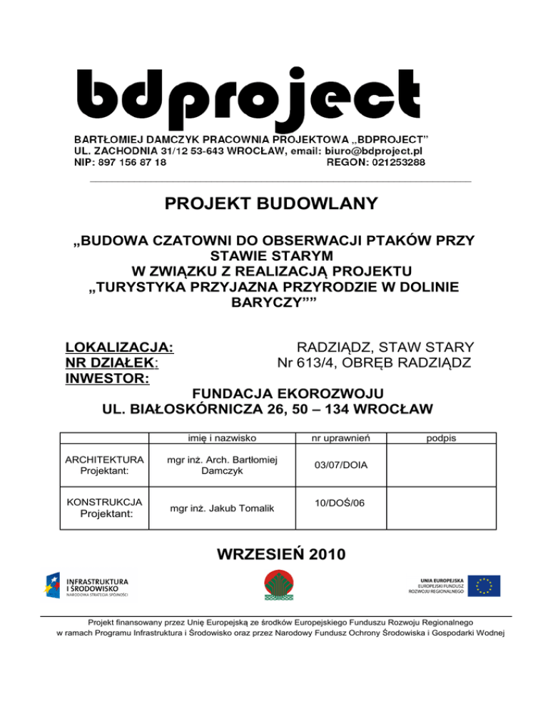 _____________________________________________________________________ PROJEKT BUDOWLANY „BUDOWA CZATOWNI DO OBSERWACJI PTAKÓW PRZY STAWIE STARYM W ZWIĄZKU Z REALIZACJĄ PROJEKTU „TURYSTYKA PRZYJAZNA PRZYRODZIE W DOLINIE BARYCZY”” LOKALIZACJA: NR DZIAŁEK: INWESTOR: RADZIĄDZ, STAW STARY Nr 613/4, OBRĘB RADZIĄDZ FUNDACJA EKOROZWOJU UL. BIAŁOSKÓRNICZA 26, 50 – 134 WROCŁAW ARCHITEKTURA Projektant: KONSTRUKCJA Projektant: imię i nazwisko nr uprawnień mgr inż. Arch. Bartłomiej Damczyk 03/07/DOIA mgr inż. Jakub Tomalik podpis 10/DOŚ/06 WRZESIEŃ 2010 Projekt finansowany przez Unię Europejską ze środków Europejskiego Funduszu Rozwoju Regionalnego w ramach Programu Infrastruktura i Środowisko oraz przez Narodowy Fundusz Ochrony Środowiska i Gospodarki Wodnej Spis treści: 1 . Załączniki – dokumenty formalno - prawne 1.1. Oświadczenia projektantów o wykonaniu projektu zgodnie z obowiązującymi przepisami oraz zasadami wiedzy technicznej . 1.2. Uprawnienia zawodowe oraz przynależności do izb zawodowych. 1.3. Kopie decyzji, warunków technicznych i uzgodnień 1.3.1 Kopia Decyzji o Warunkach zabudowy 1.3.2 Zaświadczenie organu odpowiedzialnego za monitoring obszarów NATURA 2000 1.3.3 Opinia naukowego opiekuna rezerwatu Stawy Milickie Józefa Witkowskiego 2. Opis techniczny- projekt zagospodarowania terenu Podstawa opracowania 2.2 Przedmiot inwestycji oraz kolejność realizacji 2.3 Istniejący stan zagospodarowania działek 2.4 Opis projektowanego zagospodarowania terenu 2.5 Opis projektowanych sieci uzbrojenia terenu. 2.6 Bilans terenu 2.7 Informacja i dane dotyczące przewidywanych zagrożeń dla środowiska oraz higieny i zdrowia użytkowników 2.8 Informacja o zgodności inwestycji z planem miejscowym 2.9 Ochrona terenu inwestycji 2.10 Wpływ eksploatacji górniczej 2.11 Oddziaływanie na środowisko 2.12 Warunki bhp, wykonastwo robót 2.1 3. Opis techniczny- projekt architektoniczno - budowlany 3.1 Przeznaczenie i program użytkowy obiektu. 3.2 Forma architektoniczna obiektu. funkcja obiektu budowlanego 3.3 Konstrukcja 3.3.1 Normy 3.3.2 Użyte materiały konstrukcyjne i izolacyjne 3.3.3 Przyjęte obciążenia zmienne od wiatru 3.3.4 Przyjęte obciążenia zmienne od śniegu 3.3.5 Warunki gruntowo – wodne 3.3.6 Posadowienie 3.3.7 Konstrukcja drewniana 3.4 Dostępność obiektu dla osób niepełnosprawnych 3.5 Główne elementy budowlane 3.6 Instalacje: 3.7 Wpływ obiektu budowlanego na środowisko, zdrowie ludzi i obiekty sąsiednie: 3.7.1 Bilans wody i ścieków 3.7.2 Emisja zanieczyszczeń gazowych, pyłów etc. 3.7.3 Rodzaj i ilość wytwarzanych odpadów 3.7.4 Emisja hałasu oraz wibracji 3.7.5 Wpływ obiektu budowlanego na istniejący drzewostan, glebę, wody 3.8 Warunki ochrony przeciwpożarowej 3.9 Informacja BIOZ 3.10 Informacja dotycząca odstąpienia od zatwierdzonego projektu budowlanego. 4. Rysunki: 1. Plan zagospodarowania terenu skala 1:500 2. Rzut fundamentów skala 1:50 3. Rzut przyziemia skala 1:50 4. Rzut piętra skala 1:50 5. Rzut więźby dachowej skala 1:50 6. Rzut dachu skala 1:50 7. Rzut konstrukcji stropów, schodów i pochylni skala 1:50 8. Przekrój 1-1 skala 1:50 9. Przekrój 2-2, detal pochwytu balustrady skala 1:20, 1:50 10. Elewacja frontowa skala 1:50 11. Elewacja tylna skala 1:50 12. Elewacja w osi C skala 1:50 13. Elewacja boczna 1 skala 1:50 14. Elewacja boczna 2 skala 1:50 15. Zestawienie elementów drewnianych 16. Detale fundamentów żelbetowych skala 1:10, 1:20 17. Detale fundamentów żelbetowych – zestawienie stali 2. Opis techniczny – projekt zagospodarowania terenu 2.1 Podstawa opracowania: Podstawą opracowania są: • Zlecenie inwestora • Obowiązujący warunki zabudowy dla terenu inwestycji • Charakterystyka całego przedsięwzięcia • Podkład sytuacyjno-wysokościowy w skali 1:500 do celów projektowych; • Opinia geotechniczna • Wizja lokalna • Obowiązujące normy i przepisy • Uzgodnienia z Inwestorem • Uzgodnienia z zarządcą gruntu • Uzgodnienia z opiekunami naukowymi rezerwatu przyrody; 2.2 Przedmiot inwestycji oraz kolejność realizacji : Przedmiotem inwestycji jest budowa czatowni do obserwacji ptaków, zlokalizowanej przy Stawie Starym ( kompleks Radziądz) na granicy rezerwatu przyrody „Stawy Milickie” oraz na obszarze Parku Krajobrazowego „Dolina Baryczy”. Planowane zamierzenie będzie uzupełnieniem infrastruktury turystycznej na obszarze rezerwatu i będzie służyć do nieinwazyjnego obserwowania przyrody. Wieża obserwacyjna nad Stawem Starym stanowić będzie dodatkową atrakcję turystyczną i jest nawiązaniem do istniejącej i projektowanej infrastruktury turystycznej. Realizacja punktu obserwacyjnego stanowi element projektu „Turystyka przyjaznej przyrodzie w Parku Krajobrazowym Dolina Baryczy”. Pełnić będzie funkcję elementu turystyki przyrodniczej, bazującej głównie na obserwacjach ptaków „bird watching”, z pełną infrastrukturą umożliwiająca nieinwazyjną obserwację przyrody, pakietem usług przewodnickich (powiązanych z ofertą agroturystyczną) oraz systemem informacyjnym. Umożliwi ukierunkowanie ruchu turystycznego, skuteczną promocję walorów przyrodniczych, edukację ekologiczną w sposób nie ingerujący w środowisko przyrodnicze. Dojście do czatowni odbywać się będzie wyznaczaną w tym roku ścieżką dydaktyczno-przyrodniczą biegnącą z parkingu w centrum wsi Niezgoda. Obiekt dostępny dla turystów indywidualnych oraz grup zorganizowanych (grupy piesze i rowerowe korzystające ze ścieżki dydaktycznej). Zarówno lokalizacja jak i konstrukcja platformy do obserwacji ptaków została skonsultowana z prof. J. Witkowskim, opiekunem naukowym rezerwatu przyrody „Stawy Milickie” (w załączeniu pozytywna opinia), uzgodniona z zarządcą gruntu (PZB „Stawy Milickie”). Należy także podkreślić, iż lokalizacja czatowni przy Stawie Starym została pozytywnie zaopiniowana przez Regionalną Dyrekcję Ochrony Środo