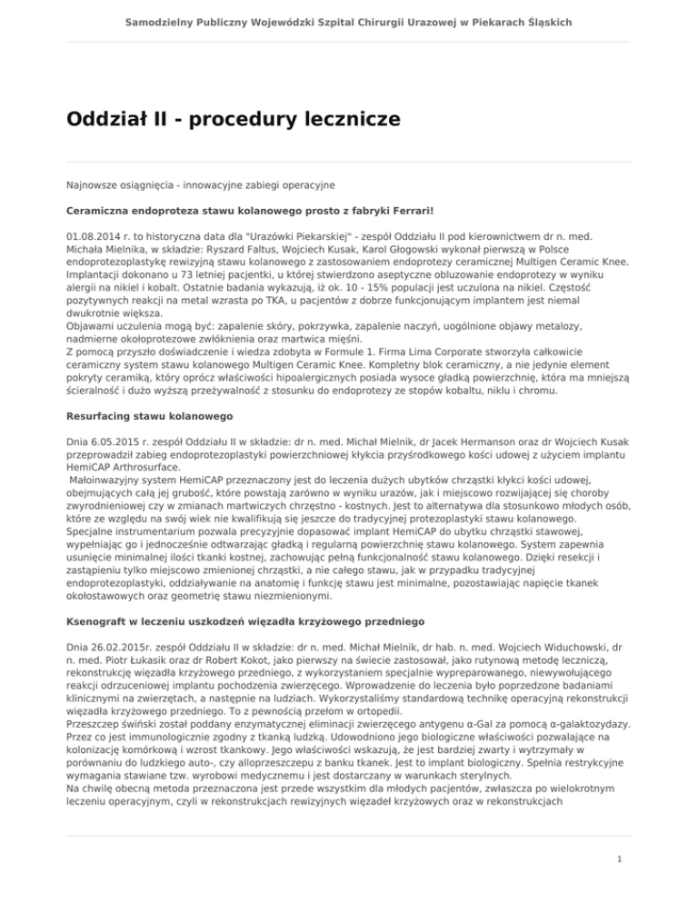 przeprowadził zabieg endoprotezoplastyki powierzchniowej kłykcia przyśrodkowego kości udowej z użyciem implantu