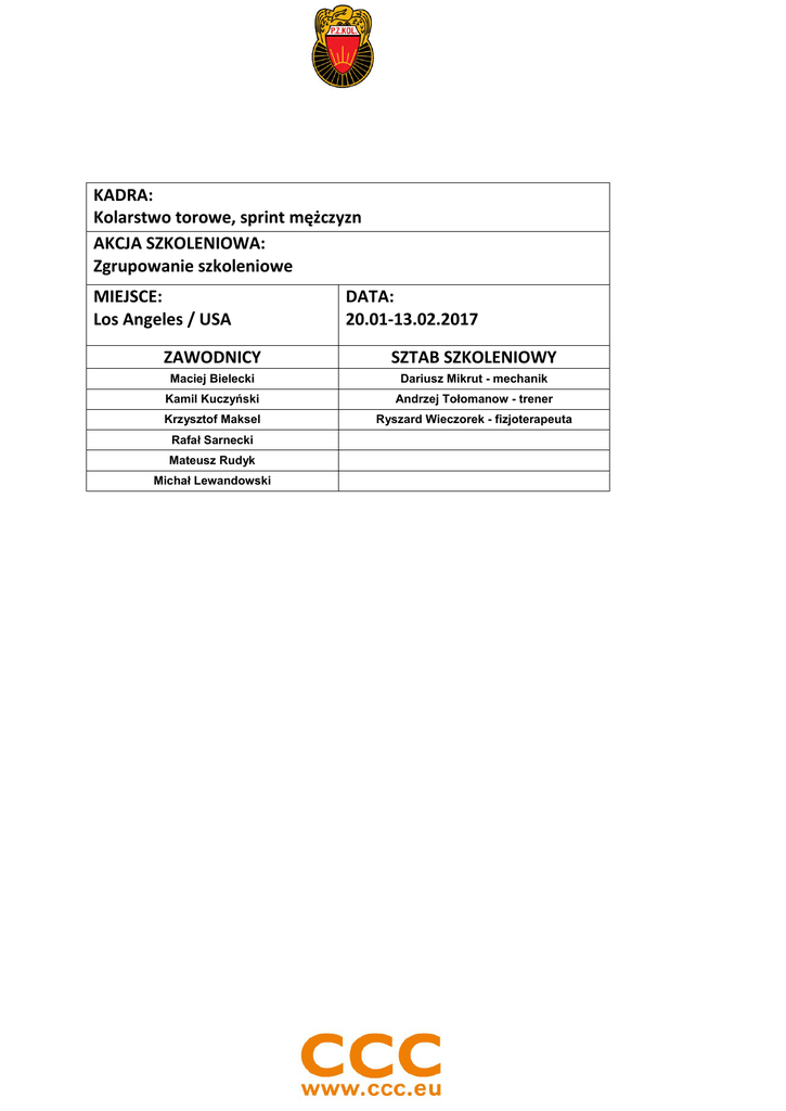 KADRA: Kolarstwo torowe, sprint mężczyzn AKCJA SZKOLENIOWA: Zgrupowanie szkoleniowe MIEJSCE: Los Angeles / USA DATA: 20.01-13.02.2017 ZAWODNICY SZTAB SZKOLENIOWY Maciej Bielecki Dariusz Mikrut - mechanik Kamil Kuczyński Andrzej Tołomanow - trener Krzysztof Maksel Ryszard Wieczorek - fizjoterapeuta Rafał Sarnecki Mateusz Rudyk Michał Lewandowski