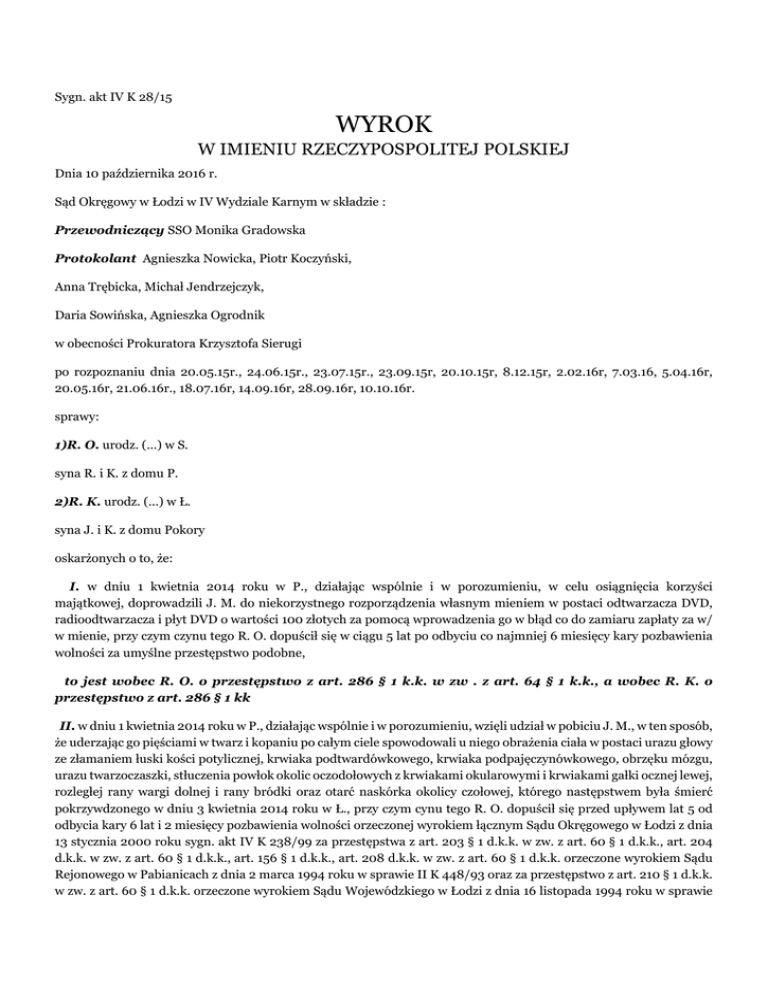 Sygn. akt IV K 28/15 WYROK W IMIENIU RZECZYPOSPOLITEJ POLSKIEJ Dnia 10 października 2016 r. Sąd Okręgowy w Łodzi w IV Wydziale Karnym w składzie : Przewodniczący SSO Monika Gradowska Protokolant Agnieszka Nowicka, Piotr Koczyński, Anna Trębicka, Michał Jendrzejczyk, Daria Sowińska, Agnieszka Ogrodnik w obecności Prokuratora Krzysztofa Sierugi po rozpoznaniu dnia 20.05.15r., 24.06.15r., 23.07.15r., 23.09.15r, 20.10.15r, 8.12.15r, 2.02.16r, 7.03.16, 5.04.16r, 20.05.16r, 21.06.16r., 18.07.16r, 14.09.16r, 28.09.16r, 10.10.16r. sprawy: 1)R. O. urodz. (...) w S. syna R. i K. z domu P. 2)R. K. urodz. (...) w Ł. syna J. i K. z domu Pokory oskarżonych o to, że: I. w dniu 1 kwietnia 2014 roku w P., działając wspólnie i w porozumieniu, w celu osiągnięcia korzyści majątkowej, doprowadzili J. M. do niekorzystnego rozporządzenia własnym mieniem w postaci odtwarzacza DVD, radioodtwarzacza i płyt DVD o wartości 100 złotych za pomocą wprowadzenia go w błąd co do zamiaru zapłaty za w/ w mienie, przy czym czynu tego R. O. dopuścił się w ciągu 5 lat po odbyciu co najmniej 6 miesięcy kary pozbawienia wolności za umyślne przestępstwo podobne, to jest wobec R. O. o przestępstwo z art. 286 § 1 k.k. w zw . z art. 64 § 1 k.k., a wobec R. K. o przestępstwo z art. 286 § 1 kk II. w dniu 1 kwietnia 2014 roku w P., działając wspólnie i w porozumieniu, wzięli udział w pobiciu J. M., w ten sposób, że uderzając go pięściami w twarz i kopaniu po całym ciele spowodowali u niego obrażenia ciała w postaci urazu głowy ze złamaniem łuski kości potylicznej, krwiaka podtwardówkowego, krwiaka podpajęczynówkowego, obrzęku mózgu, urazu twarzoczaszki, stłuczenia powłok okolic oczodołowych z krwiakami okularowymi i krwiakami gałki ocznej lewej, rozległej rany wargi dolnej i rany bródki oraz otarć naskórka okolicy czołowej, którego następstwem była śmierć pokrzywdzonego w dniu 3 kwietnia 2014 roku w Ł., przy czym cynu tego R. O. dopuścił się przed upływem lat 5 od odbycia kary 6 lat i 2 miesięcy pozbawienia wolności orzeczonej wyrokiem łącznym Sądu Okręgowego w Łodzi z dnia 13 stycznia 2000 roku sygn. akt IV K 238/99 za przestępstwa z art. 203 § 1 d.k.k. w zw. z art. 60 § 1 d.k.k., art. 204 d.k.k. w zw. z art. 60 § 1 d.k.k., art. 156 § 1 d.k.k., art. 208 d.k.k. w zw. z art. 60 § 1 d.k.k. orzeczone wyrokiem Sądu Rejonowego w Pabianicach z dnia 2 marca 1994 roku w sprawie II K 448/93 oraz za przestępstwo z art. 210 § 1 d.k.k. w zw. z art. 60 § 1 d.k.k. orzeczone wyrokiem Sądu Wojewódzkiego w Łodzi z dnia 16 listopada 1994 roku w sprawie IV K 135/94, którą to karę odbył w okresie od 24.05.1995 roku do 15.12.1995 roku, od 21.07.2003r. do 25.07.2007 roku i od 3.03.2009 roku do 6.10.2010 roku; to jest wobec R. O. o przestępstwo z art. 158 § 3 k.k. w zw . z art. 64 § 2 k.k., a wobec R. K. o przestępstwo z art. 158 § 3 kk a nadto R. O. o to, że: III. w dniu 1 kwietnia 2014 roku w P. zastosował wobec J. M. groźbę bezprawną pozbawienia życia w celu zmuszenia go do zaniechania wezwania Policji, przy czym czynu tego dopuścił się w ciągu lat 5 po odbyciu co najmniej 6 miesięcy kary pozbawienia wolności za umyślne przestępstwo podobne, to jest o przestępstwo z art. 191 § 1 k.k. w zw. z art. 64 § 1 k.k. a nadto R. K. o to, że: IV. w dniu 1 kwietnia 2014 roku w P., stosując przemoc polegającą na szarpnięciu J. M., posadzeniu go na pufie, a następnie złapaniu go za głowę, doprowadził go do obcowania płciowego w postaci odbycia stosunku oralnego, to jest o czyn z art. 197 § 1 k.k.; a nadto R. O. i R. K. o to, że: V. w dniu 18 marca 2014 roku w P., działając wspólnie i w porozumieniu, zabrali w celu przywłaszczenia cudze rzeczy ruchome w postaci kina domowego marki S. model (...) 22 z napędem DVD, głośnikami i pilotem, tunera telewizyjnego marki T. (...), dwóch tunerów telewizyjnych Cyfrowego P., w tym model HD 6000, czterech sztuk pilotów telewizyjnych, pięciu sztuk aparatów telefonicznych marki S., N. i S. (...), wraz z zasilaczami, trzech sztuk latarek, kompletu wkrętaków, ręcznej maszynki do kręcenia papierosów, walkman marki (...), dwóch odtwarzaczy MP3, zegarka z kalkulatorem, konsoli do gry M. G., torby z napisem W. o łącznej wartości 855 złotych czym działali na szkodę B. F., przy czym czynu tego R. O. dopuścił się w ciągu 5 lat po odbyciu co najmniej 6 miesięcy kary pozbawienia wolności za umyślne przestępstwo podobne; to jest wobec R. O. o przestępstwo z art. 278 § 1 k.k. w zw . z art. 64 § 1 k.k., a wobec R. K. o przestępstwo z art. 278 § 1 kk; 1. oskarżonych R. O. i R. K. uznaje za winnych zarzucanego im w pkt I czynu, czym oskarżony R. O. wypełnił dyspozycję art. 286 § 1 kk w zw. z art. 64 § 1 kk, a R. K. wypełnił dyspozycję art. 286 § 1 kk i na podstawie art. 286 § 1 kk wymierza: a) R. O. karę 1 (jednego) roku i 3 (trzech) miesięcy pozbawienia wolności, b) R. K. karę 1 (jednego) roku pozbawienia wolności, 2. oskarżonych R. O. i R. K. w miejsce zarzucanego im w pkt II czynu uznaje za winnych tego, że w dniu 1 kwietnia 2014 roku w P., działając wspólnie i w porozumieniu, wzięli udział w pobiciu J. M., w ten sposób, że uderzając go w twarz i kopiąc po całym ciele spowodowali u niego obrażenia ciała w postaci urazu głowy ze stłuczeniem okolic oczodołowych, krwiakami okularowymi i krwiakiem gałki ocznej lewej, rozległej rany wargi dolnej i rany bródki oraz otarć naskórka okolicy czołowej oraz niewielkiego krwiaka podtwardówkowego na sklepistości po stronie lewej, przy czym uraz głowy ze stłuczeniem okolic oczodołowych, krwiakami okularowymi i krwiakiem gałki ocznej lewej i rana bródki oraz otarcia naskórka okolicy czołowej spowodowały naruszenie czynności narządu ciała trwające nie dłużej niż siedem dni, natomiast rozległa rana wargi dolnej spowodowała naruszenie czynności narządu ciała na czas dłuższy ni