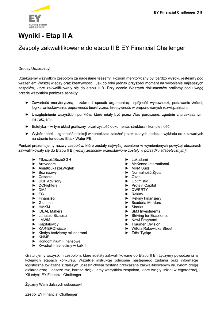 EY Financial Challenger XII Wyniki - Etap II A Zespoły zakwalifikowane do etapu II B EY Financial Challenger Drodzy Uczestnicy! Dziękujemy wszystkim zespołom za nadesłane teaser’y. Poziom merytoryczny był bardzo wysoki, jesteśmy pod wrażeniem Waszej wiedzy oraz kreatywności. Jak co roku jednak przyszedł moment na wyłonienie najlepszych zespołów, które zakwalifikowały się do etapu II B. Przy ocenie Waszych dokumentów braliśmy pod uwagę przede wszystkim poniższe aspekty: ► Zawartość merytoryczną – zakres i sposób argumentacji, spójność wypowiedzi, podawanie źródeł, logika wnioskowania, poprawność teoretyczna, kreatywność w proponowanych rozwiązaniach. ► Uwzględnienie wszystkich punktów, które miały być przez Was poruszone, zgodnie z przekazanymi instrukcjami. ► Estetyka – w tym układ graficzny, przejrzystość dokumentu, struktura i kompletność. ► Wybór spółki – zgodność selekcji w kontekście założeń przekazanych podczas wykładu oraz zawartych na stronie funduszu Black Water PE. Poniżej prezentujemy nazwy zespołów, które zostały najwyżej ocenione w wymienionych powyżej obszarach i zakwalifikowały się do Etapu II B (nazwy zespołów przedstawione zostały w porządku alfabetycznym): ► ► ► ► ► ► ► ► ► ► ► ► ► ► ► ► ► ► ► ► ► #SzczęśćBożeSGH Arrivederci Asia&Łukasz&Wojtek Bez nazwy Cesarze DCF Advisory DCFighters DM2 FG Finansiści Gluttons HMKM iDEAL Makers Janusze Biznesu JMWM Kapitałowcy KARIERO!wicze Kiedyś będziemy milionerami KNMF Kondominium Finansowe Kwadrat - nie lecimy w kulki ! ► ► ► ► ► ► ► ► ► ► ► ► ► ► ► ► ► ► Lukadami McKenna International MKM Suits Normalność Życia Okapi Optimistic Protein Capital QWERTY Rekiny Rekiny Finansjery Scuderia Mordoru Sharks SMJ Investments Striving for Excellence Nowi Pragmaci Träumen Division Wilki z Rakowicka Street Żółci Tysiąc Gratulujemy wszystkim zespołom, które zostały zakwalifikowane do Etapu II B i życzymy powodzenia w kolejnych etapach konkursu. Wszelkie instrukcje odnośnie następnego zadania oraz informacje logistyczne związane z dalszym uczestnictwem zostaną przekazane zakwalifikowanym drużynom drogą elektroniczną. Jeszcze raz, bardzo dziękujemy wszystkim zespołom, które wzięły udział w tegorocznej, XII edycji EY Financial Challenger. Życzmy Wam dalszych sukcesów! Zespół EY Financial Challenger