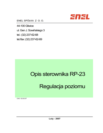 ENEL SPÓŁKA Z O. O. 44-100 Gliwice ul. Gen J. Sowińskiego 3 tel.: (32) 237-62-68 tel./fax: (32) 237-62-69 Opis sterownika RP-23 Regulacja poziomu CA2 / 22.02.07 Luty - 2007 A SPIS TREŚCI WPROWADZENIE ...................................................................................1 STRUKTURA WEWNĘTRZNA STEROWNIKA ......................................1 OPROGRAMOWANIA STEROWNIKA ............................................................1 REGULATOR ...........................................................................................2 UKŁAD KASKADOWY ................................................................................2 UKŁAD STANDARDOWY ............................................................................3 UKŁAD NADĄŻNY .....................................................................................4 Wersja dla układów do 3 pomp........................................................4 Wersja dla układów powyżej 3 pomp...............................................5 PŁYTA CZOŁOWA STEROWNIKA I JEJ FUNKCJE .............................5 EKRAN STANDARDOWY STEROWNIKA .......................................................6 TRYB PRACY ...........................................................................................6 WARTOŚĆ ZADANA ..................................................................................7 INFORMACJE ...........................................................................................8 WEJŚCIA I WYJŚCIA STEROWNIKA ....................................................9 WEJŚCIA ANALOGOWE ............................................................................9 WEJŚCIA CYFROWE...............................................................................10 WEJŚCIA CYFROWE DODATKOWE ...........................................................12 WEJŚCIE IMPULSOWE ............................................................................12 POMIAR MOCY CZYNNEJ (OPCJA) ...........................................................13 WYJŚCIE SZEREGOWE RS-485 .............................................................13 WYJŚCIE SZEREGOWE RS-232 .............................................................14 WYJŚCIE PRĄDOWE ..............................................................................14 PRZEKAŹNIKI WYJŚCIOWE ......................................................................15 OPIS PARAMETRÓW............................................................................17 DOSTĘP DO PARAMETRÓW NASTAWIALNYCH...........................................19 GRUPA 1. PARAMETRY STERUJĄCE PRACĄ REGULATORA ........................19 GRUPA 2. PARAMETRY STERUJĄCE PRACĄ REGULATORA ........................21 GRUPA 3. STEROWANIE ZAŁĄCZANIEM POMP ..........................................22 GRUPA 4. PARAMETRY WYŁĄCZENIA NOCNEGO ......................................23 GRUPA 5. ZAŁĄCZANIE POMP BEZ FALOWNIKA ........................................24 GRUPA 6. CZASY PRACY POMP ..............................................................25 GRUPA 7. ZABEZPIECZENIA ...................................................................26 GRUPA 8. ŁĄCZNOŚĆ ............................................................................27 GRUPA 9. NASTAWA ZEGARA .................................................................28 B KOMUNIKATY I SYGNALIZACJE AWARII ..........................................29 STOP STEROWNIKA ...............................................................................29 BLOKADA TECHNOLOGICZNA ..................................................................29 BRAK WODY (SUCHOBIEG) .....................................................................29 AWARIA TORU POMIAROWEGO ...............................................................30 AWARIA PRZEMIENNIKA CZĘSTOTLIWOŚCI ...............................................30 UŻYTECZNE WSKAZÓWKI ..................................................................30 URUCHOMIENIE STEROWNIKA ................................................................30 PRZED ODDANIEM DO NAPRAWY ............................................................31 DANE TECHNICZNE: ............................................................................33 KARTA GWARANCYJNA .....................................................................41 UWAGA: Opis dotyczy dwóch wersji programu do regulacji poziomu. Wersją podstawową dla której opisano sposób działania regulatora jest układ w którym pompy opróżniają zbiornik (wylewanie). Natomiast gdy pompy napełniają zbiornik (nalewanie), działanie sterownika jest odwrotne i zostało podane w nawiasach. 1 Wprowadzenie RP-23 jest uniwersalnym sterownikiem przeznaczonym przede wszystkim do współpracy z przemiennikami częstotliwości. Jego głównym zadaniem jest stabilizacja wielkości fizycznej na poziomie zadanym poprzez odpowiednie sterowanie pracą pomp. Sterownik, dzięki stosunkowo niskiej cenie i dużych możliwościach regulacyjnych, znajduje zastosowanie w sterowaniu procesów technologicznych takich jak: • stabilizacja ciśnienia wody, • stabilizacja poziomu, • stabilizacja przepływu wody, • stabilizacja zawartości tlenu w ściekach • oraz innych, w małych i średnich obiektach, gdzie stanowi alternatywne rozwiązanie wobec sterowników swobodnie programowalnych. Sterownik przystosowany jest do mocowania na drzwiach szaf sterowniczych. Struktura wewnętrzna sterownika Podstawowym podzespołem sterownika RP-23 jest H8/3048F – 16 bitowy procesor z wejściami analogowymi, dużą dowolnością sterowania liniami portowymi oraz rozbudowanym systemem wewnętrznych zabezpieczeń przeciwzakłóceniowych. Mikroprocesor ten przyjmuje informacje zewnętrzne w postaci analogowych i cyfrowych sygnałów wejściowych, przetwarza je i wysyła w postaci cyfrowej (dwa łącza szeregowe) lub analogowej (dwa wyjścia analogowe) oraz poprzez załączanie i wyłączanie prze