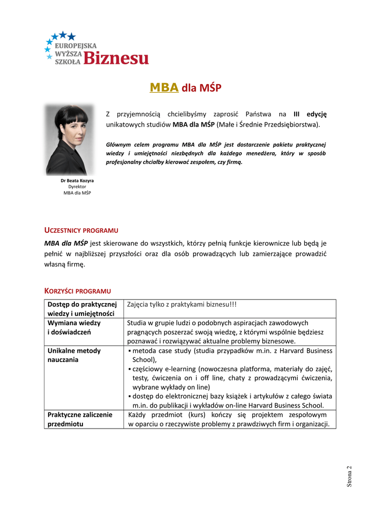 MBA dla MŚP Z przyjemnością chcielibyśmy zaprosić Państwa na III edycję unikatowych studiów MBA dla MŚP (Małe i Średnie Przedsiębiorstwa). Głównym celem programu MBA dla MŚP jest dostarczenie pakietu praktycznej wiedzy i umiejętności niezbędnych dla każdego menedżera, który w sposób profesjonalny chciałby kierować zespołem, czy firmą. Dr Beata Kozyra Dyrektor MBA dla MŚP UCZESTNICY PROGRAMU MBA dla MŚP jest skierowane do wszystkich, którzy pełnią funkcje kierownicze lub będą je pełnić w najbliższej przyszłości oraz dla osób prowadzących lub zamierzające prowadzić własną firmę. KORZYŚCI PROGRAMU Unikalne metody nauczania Praktyczne zaliczenie przedmiotu Zajęcia tylko z praktykami biznesu!!! Studia w grupie ludzi o podobnych aspiracjach zawodowych pragnących poszerzać swoją wiedzę, z którymi wspólnie będziesz poznawać i rozwiązywać aktualne problemy biznesowe. metoda case study (studia przypadków m.in. z Harvard Business School), częściowy e-learning (nowoczesna platforma, materiały do zajęć, testy, ćwiczenia on i off line, chaty z prowadzącymi ćwiczenia, wybrane wykłady on line) dostęp do elektronicznej bazy książek i artykułów z całego świata m.in. do publikacji i wykładów on-line Harvard Business School. Każdy przedmiot (kurs) kończy się projektem zespołowym w oparciu o rzeczywiste problemy z prawdziwych firm i organizacji. Strona 2 Dostęp do praktycznej wiedzy i umiejętności Wymiana wiedzy i doświadczeń PROGRAM dr Zbigniew Matyjas Nazwa modułu Nazwa kursu Rynek Współczesny rynek – co to jest rynek, rodzaje rynków, metody analizy rynków Najważniejsze aspekty makro i mikroekonomii. Współczesne wyzwania rynkowe dla MSP Przedsiębiorczość - tworzenie i rozwój MSP Prawne aspekty funkcjonowania MSP Podatki i inne świadczenia dla MSP Menedżer - zarządzanie Firma - działania operacyjne Zarządzanie produktem i usługą w MSP Zarządzanie sprzedażą w MSP. Zarządzanie wartością klienta Zarządzanie marketingowe w MSP- badania i nowoczesne narzędzia marketingowe Prawo pracy Planowanie kadr i zarządzanie zasobami ludzkimi w MSP - rekrutacja, rozwój, ocena, motywacja, dokumentacja Zarządzanie finansami w MSP. Źródła finansowania MSP Rachunkowość w MSP Zarządzanie strategiczne w MSP Biznes plan Informatyczne systemy zarządzania dla MSP Rozwiązywanie problemów i podejmowanie decyzji Komunikacja interpersonalna Wykłady Ćw W+ćw Elearning Łącznie ECTS 4 6 10 4 14 2 4 8 12 5 17 2 4 5 5 5 4 8 8 8 8 13 13 13 3 5 5 5 11 18 18 18 2 3 3 4 5 8 13 5 18 4 9 15 24 10 34 5 4 4 8 3 11 2 9 15 24 10 34 5 9 15 24 10 34 5 9 9 9 8 15 15 15 8 24 24 24 16 10 10 10 6 34 34 34 22 5 6 5 4 5 10 15 6 21 2 5 10 15 6 21 4 Negocjacje 5 10 15 6 21 4 Efektywne przywództwo 5 5 5 10 10 10 10 30 15 15 15 40 6 6 6 16 21 21 21 56 4 4 4 5 152 162 380 125 439 84 Zarządzanie czasem i skuteczne planowanie. Zarządzanie zmianą Business English PROWADZĄCY ZAJĘCIA Wyłącznie specjaliści i praktycy biznesu! Trenerzy posiadający polskie i międzynarodowe certyfikaty. DYPLOM Strona 2 Uczestnicy MBA dla MŚP otrzymują świadectwo ukończenia studiów podyplomowych Europejskiej Wyższej Szkoły Biznesu. ORGANIZACJA STUDIÓW 2 lata; tryb zaoczny – zjazdy weekendowe (ok. 12 zjazdów w roku) rozpoczęcie – październik 2015 Język wykładowy polski OPŁATY Wpisowe: 350 zł Wpisowe: 0 zł dla zgłoszeń do 30 czerwca Dla Absolwentów EWSB: Wpłata jednorazowa całej kwoty do 30.10.2015 Wpłata w dwóch ratach: I rata 50% do 30.10.2015 II rata 50% do 28.02. 2016 Wpłaty miesięczne Dla pozostałych słuchaczy: Wpłata jednorazowa całej kwoty do 30.10.2015 Wpłata w dwóch ratach: I rata 50% do 30.10.2015 II rata 50% do 28.02. 2016 Wpłaty miesięczne 9 265 zł 9 810 zł (2 razy po 4 905 zł) 10 900 zł (24 x 454zł) 15 470 zł 16 380 zł (2 razy po 8 190 zł) 18 200zł (24 x 758 zł) !Dla osoby, która zaprosi na program MBA dla MŚP znajomego – dodatkowe 10% zniżki. WYMOGI REKRUTACYJNE dyplom licencjata minimum 3 lata pracy w firmie na samodzielnym stanowisku DYREKTOR PROGRAMU Dr Beata Kozyra [email protected] KOORDYNATOR PROGRAMU [email protected] Strona 2 Mgr Kinga Chełminiak