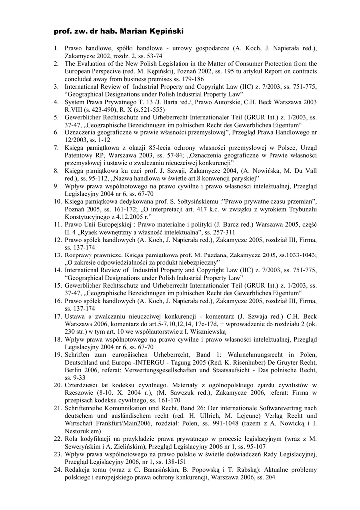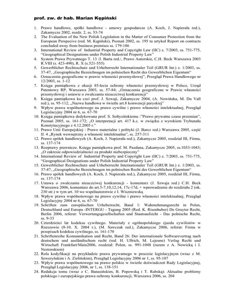 prof. zw. dr hab. Marian Kępiński 1. Prawo handlowe, spółki handlowe - umowy gospodarcze (A. Koch, J. Napierała red.), Zakamycze 2002, rozdz. 2, ss. 53-74 2. The Evaluation of the New Polish Legislation in the Matter of Consumer Protection from the European Perspecive (red. M. Kępiński), Poznań 2002, ss. 195 tu artykuł Report on contracts concluded away from business premises ss. 179-186 3. International Review of Industrial Property and Copyright Law (IIC) z. 7/2003, ss. 751-775, “Geographical Designations under Polish Industrial Property Law” 4. System Prawa Prywatnego T. 13 /J. Barta red./, Prawo Autorskie, C.H. Beck Warszawa 2003 R.VIII (s. 423-490), R. X (s.521-555) 5. Gewerblicher Rechtsschutz und Urheberrecht Internationaler Teil (GRUR Int.) z. 1/2003, ss. 37-47, „Geographische Bezeichnugen im polnischen Recht des Gewerblichen Eigentum“ 6. Oznaczenia geograficzne w prawie własności przemysłowej”, Przegląd Prawa Handlowego nr 12/2003, ss. 1-12 7. Księga pamiątkowa z okazji 85-lecia ochrony własności przemysłowej w Polsce, Urząd Patentowy RP, Warszawa 2003, ss. 57-84; „Oznaczenia geograficzne w Prawie własności przemysłowej i ustawie o zwalczaniu nieuczciwej konkurencji” 8. Księga pamiątkowa ku czci prof. J. Szwaji, Zakamycze 2004, (A. Nowińska, M. Du Vall red.), ss. 95-112, „Nazwa handlowa w świetle art.8 konwencji paryskiej” 9. Wpływ prawa wspólnotowego na prawo cywilne i prawo własności intelektualnej, Przegląd Legislacyjny 2004 nr 6, ss. 67-70 10. Księga pamiątkowa dedykowana prof. S. Sołtysińskiemu :”Prawo prywatne czasu przemian”, Poznań 2005, ss. 161-172; „O interpretacji art. 417 k.c. w związku z wyrokiem Trybunału Konstytucyjnego z 4.12.2005 r.” 11. Prawo Unii Europejskiej : Prawo materialne i polityki (J. Barcz red.) Warszawa 2005, część II. 4 „Rynek wewnętrzny a własność intelektualna”, ss. 257-311 12. Prawo spółek handlowych (A. Koch, J. Napierała red.), Zakamycze 2005, rozdział III, Firma, ss. 137-174 13. Rozprawy prawnicze. Księga pamiątkowa prof. M. Pazdana, Zakamycze 2005, ss.1033-1043; „O zakresie odpowiedzialności za produkt niebezpieczny” 14. International Review of Industrial Property and Copyright Law (IIC) z. 7/2003, ss. 751-775, “Geographical Designations under Polish Industrial Property Law” 15. Gewerblicher Rechtsschutz und Urheberrecht Internationaler Teil (GRUR Int.) z. 1/2003, ss. 37-47, „Geographische Bezeichnugen im polnischen Recht des Gewerblichen Eigentum“ 16. Prawo spółek handlowych (A. Koch, J. Napierała red.), Zakamycze 2005, rozdział III, Firma, ss. 137-174 17. Ustawa o zwalczaniu nieuczciwej konkurencji - komentarz (J. Szwaja red.) C.H. Beck Warszawa 2006, komentarz do art.5-7,10,12,14, 17c-17d, + wprowadzenie do rozdziału 2 (ok. 230 str.) w tym art. 10 we współautorstwie z I. Wiszniewską 18. Wpływ prawa wspólnotowego na prawo cywilne i prawo własności intelektualnej, Przegląd Legislacyjny 2004 nr 6, ss. 67-70 19. Schriften zum europäischen Urheberrecht, Band 1: Wahrnehmungsrecht in Polen, Deutschland und Europa -INTERGU - Tagung 2005 (Red. K. Risenhuber) De Gruyter Recht, Berlin 2006, referat: Verwertungsgesellschaften und Staatsaufsicht - Das polnische Recht, ss. 9-33 20. Czterdzieści lat kodeksu cywilnego. Materiały z ogólnopolskiego zjazdu cywilistów w Rzeszowie (8-10. X. 2004 r.), (M. Sawczuk red.), Zakamycze 2006, referat: Firma w przepisach kodeksu cywilnego, ss. 161-170 21. Schriftenreihe Komunnikation und Recht, Band 26: Der internationale Softwarevertrag nach deutschem und ausländischem recht (red. H. Ullrich, M. Lejeune) Verlag Recht und Wirtschaft Frankfurt/Main2006, rozdział: Polen, ss. 991-1048 (razem z A. Nowicką i I. Nestorukiem) 22. Rola kodyfikacji na przykładzie prawa prywatnego w procesie legislacyjnym (wraz z M. Seweryńskim i A. Zielińskim), Przegląd Legislacyjny 2006 nr 1, ss. 95-107 23. Wpływ prawa wspólnotowego na prawo polskie w świetle doświadczeń Rady Legislacyjnej, Przegląd Legislacyjny 2006, nr 1, ss. 138-151 24. Redakcja tomu (wraz z C. Banasińskim, B. Popowską i T. Rabską): Aktualne problemy polskiego i europejskiego prawa ochrony konkurencji, Warszawa 2006, ss. 204 25. Czterdzieści lat kodeksu cywilnego. Materiały z ogólnopolskiego zjazdu cywilistów w Rzeszowie (8-10. X. 2004 r.), (M. Sawczuk red.), Zakamycze 2006, referat: Firma w przepisach kodeksu cywilnego, ss. 161-170 26. O wykładni art. 827 kodeksu cywilnego (M. Orlicki współautor), Przegląd Sądowy 2006, nr 3, ss. 3-12 27. Księga Pamiątkowa dedykowana prof. J. Rajskiemu, C.H. Beck Warszawa 2007,: Uwagi o karze umownej ze szczególnym uwzględnieniem praktyki sądów polubownych, ss. 439-450 28. System Prawa Prywatnego T. 13 /J. Barta red./, Prawo Autorskie, C.H. Beck Warszawa 2007, rozdz. VIII, ss. 463-532, rozdz. X, ss. 575-626 Glosy 1. Glosa do wyroku SN IC z 8.01.2002 r. I CKN 581/99, OSP z. 11/2002, poz. C 143 2. Glosa do wyroku SN IC z 11.07.2002 r. I CKN 1319/00, OSP z. 4/2003, poz. C 54 3. Glosa do wyroku SN IC 9.05.2003 r. V CK 219/01, OSP z. 4/2004, poz. C 54 4. Glosa do wyroku SN IC z 8.04.2003 r. IV CKN 22/01, OSP z. 5/2004, poz. C 61 5. Glosa do wyroku SN IAPiUS z 8.01.2003 r. II RN 240/01, OSP z. 10/2004, poz. P 129 6. Glosa do wyroku NSA z 14.12.2005 r. II S.A. 3446/01, OSP z. 1/2004, poz. A II 7. Glosa do wyroku SN IC z 17.02.2005 r. I CK 626/04, OSP z. 12/2005, poz. C 148