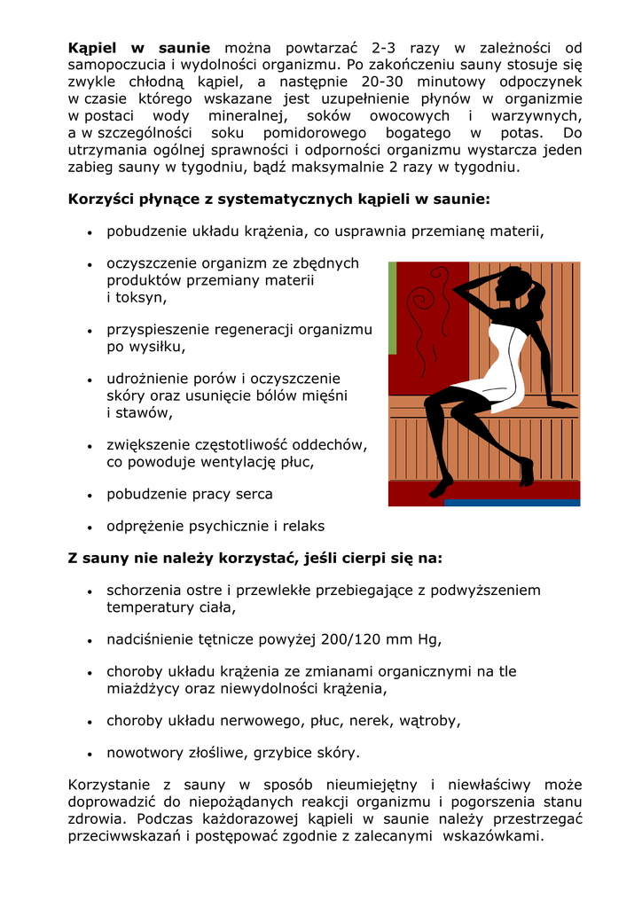 Kąpiel w saunie moŜna powtarzać 2-3 razy w zaleŜności od samopoczucia i wydolności organizmu. Po zakończeniu sauny stosuje się zwykle chłodną kąpiel, a następnie 20-30 minutowy odpoczynek w czasie którego wskazane jest uzupełnienie płynów w organizmie w postaci wody mineralnej, soków owocowych i warzywnych, a w szczególności soku pomidorowego bogatego w potas. Do utrzymania ogólnej sprawności i odporności organizmu wystarcza jeden zabieg sauny w tygodniu, bądź maksymalnie 2 razy w tygodniu. Korzyści płynące z systematycznych kąpieli w saunie: • pobudzenie układu krąŜenia, co usprawnia przemianę materii, • oczyszczenie organizm ze zbędnych produktów przemiany materii i toksyn, • przyspieszenie regeneracji organizmu po wysiłku, • udroŜnienie porów i oczyszczenie skóry oraz usunięcie bólów mięśni i stawów, • zwiększenie częstotliwość oddechów, co powoduje wentylację płuc, • pobudzenie pracy serca • odpręŜenie psychicznie i relaks Z sauny nie naleŜy korzystać, jeśli cierpi się na: • schorzenia ostre i przewlekłe przebiegające z podwyŜszeniem temperatury ciała, • nadciśnienie tętnicze powyŜej 200/120 mm Hg, • choroby układu krąŜenia ze zmianami organicznymi na tle miaŜdŜycy oraz niewydolności krąŜenia, • choroby układu nerwowego, płuc, nerek, wątroby, • nowotwory złośliwe, grzybice skóry. Korzystanie z sauny w sposób nieumiejętny i niewłaściwy moŜe doprowadzić do niepoŜądanych reakcji organizmu i pogorszenia stanu zdrowia. Podczas kaŜdorazowej kąpieli w saunie naleŜy przestrzegać przeciwwskazań i postępować zgodnie z zalecanymi wskazówkami.