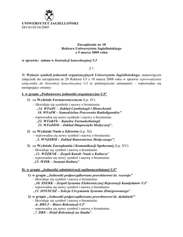 UIWERSYTET JAGIELLOŃSKI DO-0130/10/2009 Zarządzenie nr 10 Rektora Uniwersytetu Jagiellońskiego z 5 marca 2009 roku w sprawie: zmian w Instrukcji kancelaryjnej UJ §1 W Wykazie symboli jednostek organizacyjnych Uniwersytetu Jagiellońskiego, stanowiącym załącznik do zarządzenia nr 20 Rektora UJ z 18 marca 2008 roku w sprawie wprowadzenia załącznika do Instrukcji kancelaryjnej UJ (z późniejszymi zmianami) – wprowadza się następujące zmiany: I. w grupie „Podstawowe jednostki organizacyjne UJ” 1) na Wydziale Farmaceutycznym (Lp. IV) – likwiduje się symbole i nazwy o brzmieniu: „14. WFaZC – Zakład Cytobiologii i Histochemii 18. WFaPR – Samodzielna Pracownia Radioligandów” – wprowadza się nowe symbole i nazwy o brzmieniu: „22. WFaKFb – Katedra Farmakobiologii 23. WFaZDM – Zakład Diagnostyki Medycznej”; 2) na Wydziale auk o Zdrowiu (Lp. XI) – wprowadza się nowy symbol i nazwę o brzmieniu: „5. W1ZZRM – Zakład Ratownictwa Medycznego”; 3) na Wydziale Zarządzania i Komunikacji Społecznej (Lp. XV) – likwiduje się symbol i nazwę o brzmieniu: „11. WZZK1K – Zespół Katedr 1auk o Kulturze” – wprowadza się nowy symbol i nazwę o brzmieniu: „15. WZIK – Instytut Kultury”. II. w grupie „Jednostki administracji ogólnouczelnianej UJ” 1) w grupie „Jednostki podporządkowane prorektorowi ds. rozwoju” – likwiduje się symbol i nazwę o brzmieniu: „10. ZSERK – Zespół Systemu Elektronicznej Rejestracji Kandydatów UJ” – wprowadza się nowy symbol i nazwę o brzmieniu: „11. DTI/SUSZ – Sekcja Utrzymania Systemu Zintegrowanego”. 2) w grupie „Jednostki podporządkowane prorektorowi ds. dydaktyki” – likwiduje się symbol i nazwę o brzmieniu: „6. BRUJ – Biuro Rekrutacji UJ” – wprowadza się nowy symbol i nazwę o brzmieniu: „7. DRS – Dział Rekrutacji na Studia”. III. w grupie „Jednostki administracji ogólnouczelnianej Collegium Medicum” 1) w grupie „Jednostki podporządkowane prorektorowi UJ ds. Collegium Medicum” – likwiduje się symbole i nazwy o brzmieniu: „4. BB1/CM – Biuro Badań 1aukowych 5. DWM/CM – Dział ds. Integracji Europejskiej i Współpracy Międzynarodowej”; – w ich miejsce wprowadza się nowe symbole i nazwy o brzmieniu: „4. DB1iFS/CM – Dział Badań 1aukowych i Funduszy Strukturalnych 5. DWZ/CM – Dział Współpracy z Zagranicą”. §2 Zarządzenie wchodzi w życie z dniem podpisania. Rektor Prof. dr hab. Karol Musioł Otrzymują: – wszystkie jednostki organizacyjne UJ (wraz z Collegium Medicum)