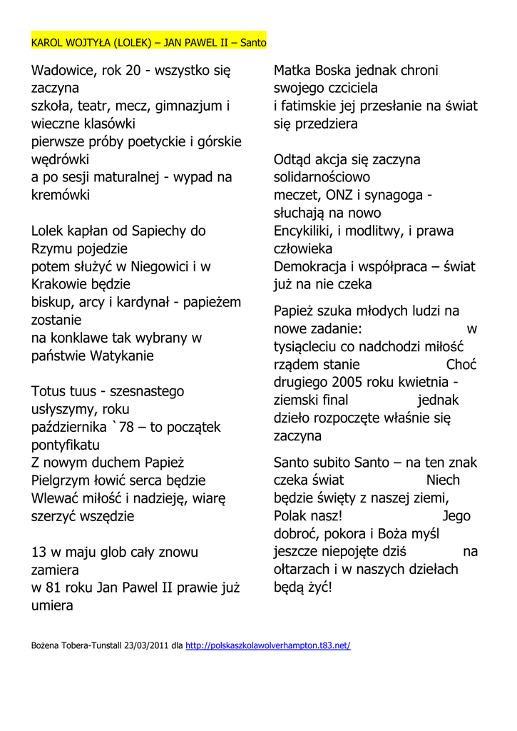 KAROL WOJTYŁA (LOLEK) – JAN PAWEL II – Santo Wadowice, rok 20 - wszystko się zaczyna szkoła, teatr, mecz, gimnazjum i wieczne klasówki pierwsze próby poetyckie i górskie wędrówki a po sesji maturalnej - wypad na kremówki Lolek kapłan od Sapiechy do Rzymu pojedzie potem służyć w Niegowici i w Krakowie będzie biskup, arcy i kardynał - papieżem zostanie na konklawe tak wybrany w państwie Watykanie Totus tuus - szesnastego usłyszymy, roku października `78 – to początek pontyfikatu Z nowym duchem Papież Pielgrzym łowić serca będzie Wlewać miłość i nadzieję, wiarę szerzyć wszędzie 13 w maju glob cały znowu zamiera w 81 roku Jan Pawel II prawie już umiera Matka Boska jednak chroni swojego czciciela i fatimskie jej przesłanie na świat się przedziera Odtąd akcja się zaczyna solidarnościowo meczet, ONZ i synagoga słuchają na nowo Encykiliki, i modlitwy, i prawa człowieka Demokracja i współpraca – świat już na nie czeka Papież szuka młodych ludzi na nowe zadanie: w tysiącleciu co nadchodzi miłość rządem stanie Choć drugiego 2005 roku kwietnia ziemski final jednak dzieło rozpoczęte właśnie się zaczyna Santo subito Santo – na ten znak czeka świat Niech będzie święty z naszej ziemi, Polak nasz! Jego dobroć, pokora i Boża myśl jeszcze niepojęte dziś na ołtarzach i w naszych dziełach będą żyć! Bożena Tobera-Tunstall 23/03/2011 dla http://polskaszkolawolverhampton.t83.net/