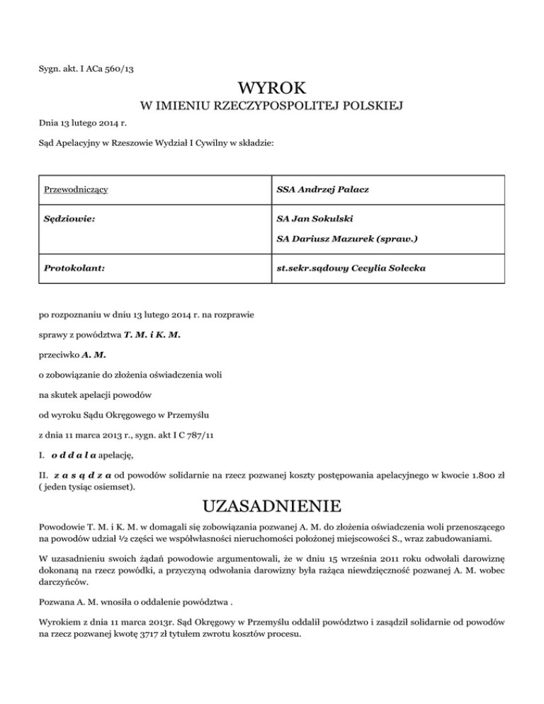 Sygn. akt. I ACa 560/13 WYROK W IMIENIU RZECZYPOSPOLITEJ POLSKIEJ Dnia 13 lutego 2014 r. Sąd Apelacyjny w Rzeszowie Wydział I Cywilny w składzie: Przewodniczący SSA Andrzej Palacz Sędziowie: SA Jan Sokulski SA Dariusz Mazurek (spraw.) Protokolant: st.sekr.sądowy Cecylia Solecka po rozpoznaniu w dniu 13 lutego 2014 r. na rozprawie sprawy z powództwa T. M. i K. M. przeciwko A. M. o zobowiązanie do złożenia oświadczenia woli na skutek apelacji powodów od wyroku Sądu Okręgowego w Przemyślu z dnia 11 marca 2013 r., sygn. akt I C 787/11 I. o d d a l a apelację, II. z a s ą d z a od powodów solidarnie na rzecz pozwanej koszty postępowania apelacyjnego w kwocie 1.800 zł ( jeden tysiąc osiemset). UZASADNIENIE Powodowie T. M. i K. M. w domagali się zobowiązania pozwanej A. M. do złożenia oświadczenia woli przenoszącego na powodów udział ½ części we współwłasności nieruchomości położonej miejscowości S., wraz zabudowaniami. W uzasadnieniu swoich żądań powodowie argumentowali, że w dniu 15 września 2011 roku odwołali darowiznę dokonaną na rzecz powódki, a przyczyną odwołania darowizny była rażąca niewdzięczność pozwanej A. M. wobec darczyńców. Pozwana A. M. wnosiła o oddalenie powództwa . Wyrokiem z dnia 11 marca 2013r. Sąd Okręgowy w Przemyślu oddalił powództwo i zasądził solidarnie od powodów na rzecz pozwanej kwotę 3717 zł tytułem zwrotu kosztów procesu. W uzasadnieniu wyroku Sąd Okręgowy wskazał, że rozstrzygnął sprawę w oparciu o następujące ustalenia faktyczne: Dnia 16 grudnia 2005r. T. M. i K. M. darowali swojemu synowi G. M. i jego żonie A. M. nieruchomość położoną w miejscowości S. o powierzchni 1,02 ha z wzniesionymi na niej budynkiem mieszkalnym i gospodarczym. Obdarowani na nabytej nieruchomości ustanowili nieodpłatnie na rzecz darczyńców dożywotnią służebność osobistą polegającą na prawie korzystania z pokoju, kuchni, łazienki i przedpokoju na parterze oraz prawie wspólnego korzystania z nieruchomości. W chwili dokonania darowizny relacje pomiędzy stronami były dobre. Po przekazaniu domu obdarowanym powodowie wspólnie z synem i pozwaną przeprowadzili remont domu. Do pogorszenia relacji pomiędzy powodami a pozwaną doszło we wrześniu 2010r. kiedy pozwana w obecności swojego męża oświadczyła powodom, że została zgwałcona przez męża. Po tym zdarzeniu relacje pozwanej z mężem i teściami w krótkim czasie uległy pogorszeniu. W lutym 2011 roku orzeczeniem sadowym ustanowiona została rozdzielność majątkową pomiędzy A. M. i G. M.. Miesiąc później G. M. wniósł pozew rozwodowy. Chociaż pomiędzy pozwaną i mężem ciągle dochodziło do kłótni i awantur to pozwana starała się unikać kłótni z teściami. Powodowie skarżyli się rodzinie i znajomym, że pozwana obmawia ich. Skarżąc się na zachowanie pozwanej opowiadali, że synowa ogranicza im swobodne korzystanie z domu, nakazuje wychodzenie do przyznanego pokoju oraz, że rozpowiada, że syn powodów jest alkoholikiem . Jak ustalił Sąd Okręgowy pozwana często przebywała poza domem w związku z tym, że wykonywała pracę zarobkową poda poza miejscem zamieszkania Sąd Okręgowy ustalił zdarzało się, że pozwana mówiła teściom, że dom w którym mieszkają stanowi jej własność, domagała się od nich opuszczenia pokoju z telewizorem i kazała im aby udali się do własnego pokoju. Takim zachowaniem pozwanej powodowie czuli się bardzo dotknięci. Jak ustalił Sąd Okręgowy pomiędzy powodami a pozwaną nie dochodziło do kłótni, chociaż czasami zdarzały się pomiędzy nimi ostre wymiany zdań. Dnia 15 września 2011r. adwokat G. wysłał do pozwanej list informujący o odwołaniu przez powodów darowizny. W piśmie tym zawarte było stwierdzenie, że w imieniu powodów adwokat odwołuje darowiznę dokonaną przez nich na rzecz pozwanej. Sąd Okręgowy ustalił, że przed Sądem Rejonowym w Przeworsku toczy się postępowanie o udzielenie zezwolenia A. M. na dokonanie darowizny na rzecz jej małoletnich synów udziałów w nieruchomości położonej w S., która była przedmiotem darowizny dokonanej przez powodów. Ustalił również, że pozwana kupiłam mieszkanie w J., gdzie planuje w przyszłości zamieszkać. Chciała ustanowienia na rzecz małoletnich synów służebność mieszkania na spornej nieruchomości, gdyż do zakończenia sprawy rozwodowej chce tam mieszkać wraz z synami. Na podstawie wniosków opinii biegłych z zakresu psychologii i psychiatrii Sąd Okręgowy ustalił, że powodowie cierpią na łagodną depresję. Ustalił, że zaburzenia nerwicowe mają u powodów łagodny przebieg. Zaburzenia te mają związek z konfliktową sytuacją jaka istnieje w domu stron. W oparciu o takie ustalenia i dokonaną w uzasadnieniu wyroku ocenę zgromadzonego materiału dowodowego Sąd Okręgowy prowadził rozważania nad zasadnością powództwa w oparciu o przepis z art. 898 § 1 k.c. i następnych. Sąd Okręgowy argumentował, że ustawową przesłanką odwołania darowizny jest rażąca niewdzięczność obdarowanego względem darczyńcy, interpretowaną w praktyce orzeczniczej tylko jako takie zachowanie obdarowanego i takie działania, które są skierowane przeciwko darczyńcy z zamiarem nieprzyjaznym. Sąd Okręgowy wskazał, że odwołanie darowizny jest czynnością jednostronną, kształtującą prawo, wywołującą skutek obligacyjny w postaci powstania po stronie obdarowanego obowiązku zwrotu przedmiotu darowizny. Sąd Okręgowy zauważył, że istotnym elementem oświadczenia o odwołaniu darowizny jest wskazanie konkretnych przyczyn odwołania darowizny i określenie z jakim zachowaniem obdarowanego darczyńca łączy dopuszczenie się wobec niego rażącej niewdzięczności. Sąd Okręgowy zauważył, że oświadczenie powodów o odwołaniu darowizny nie wskazuje jakie zachowanie pozwanej powodowie odebrali jako rażącą niewdzięczność. powołując się na 