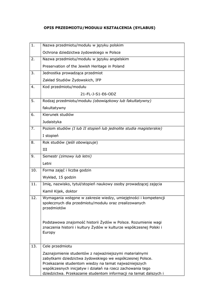 OPIS PRZEDMIOTU/MODUŁU KSZTAŁCENIA (SYLABUS) 1. Nazwa przedmiotu/modułu w języku polskim Ochrona dziedzictwa żydowskiego w Polsce 2. Nazwa przedmiotu/modułu w języku angielskim Preservation of the Jewish Heritage in Poland 3. Jednostka prowadząca przedmiot Zakład Studiów Żydowskich, IFP 4. Kod przedmiotu/modułu 21-FL-J-S1-E6-ODZ 5. Rodzaj przedmiotu/modułu (obowiązkowy lub fakultatywny) fakultatywny 6. Kierunek studiów Judaistyka 7. Poziom studiów (I lub II stopień lub jednolite studia magisterskie) I stopień 8. Rok studiów (jeśli obowiązuje) III 9. Semestr (zimowy lub letni) Letni 10. Forma zajęć i liczba godzin Wykład, 15 godzin 11. Imię, nazwisko, tytuł/stopień naukowy osoby prowadzącej zajęcia Kamil Kijek, doktor 12. Wymagania wstępne w zakresie wiedzy, umiejętności i kompetencji społecznych dla przedmiotu/modułu oraz zrealizowanych przedmiotów Podstawowa znajomość historii Żydów w Polsce. Rozumienie wagi znaczenia historii i kultury Żydów w kulturze współczesnej Polski i Europy 13. Cele przedmiotu Zaznajomienie studentów z najważniejszymi materialnymi zabytkami dziedzictwa żydowskiego we współczesnej Polsce. Przekazanie studentom wiedzy na temat najważniejszych współczesnych inicjatyw i działań na rzecz zachowania tego dziedzictwa. Przekazanie studentom informacji na temat dalszych i nowych działań z tym związanych. 14. Zakładane efekty kształcenia Student ma wiedzę o historii Polski, roli odgrywanej w niej przez kulturę i historię Żydów, a także na temat zachowanego jej dziedzictwa. zna najważniejsze instytucje zajmujące się ochroną dziedzictwa żydowskiego w Polsce. potrafi identyfikować, ocenić znaczenie a także działać na rzecz zachowania i konserwacji piśmiennego, artystycznego, architektonicznego i innych reliktów dziedzictwa żydowskiego w Polsce ma świadomość znaczenia zasad etyki zawodowej i uczciwości intelektualnej w działaniach własnych i innych osób; postępuje zgodnie z tymi zasadami ma świadomość różnic kulturowych i związanych z tym wyzwań, potrafi w praktyce stosować wiedzę o mechanizmach komunikacji interkulturowej 15. Symbole kierunkowych efektów kształcenia, np.: K_W01*, K_U05, K_K03 K-W10 K-W11 K-U05 K-K04 K-K06 K-K08 sest świadomy współodpowiedzialności za zachowanie dziedzictwa Polski i Europy. Treści programowe Piśmiennicze relikty dziedzictwa żydowskiego w Polsce. Artystyczne relikty dziedzictwa żydowskiego w Polsce. Architektoniczne relikty dziedzictwa żydowskiego w Polsce. Najważniejsze instytucje zajmujące się ochroną dziedzictwa żydowskiego w Polsce- instytucje polskie, europejskie, światowe. Sposoby i działania na rzecz zachowania dziedzictwa żydowskiego w Polsce. 16. Zalecana literatura (podręczniki) Robert Kuwałek „Rewitalizacja renesansowej synagogi w Zamościu na potrzeby Szlaku Chasydzkiego oraz lokalnej społeczności”, Warszawa 2011 Ruth Gruber “Odrodzenie kultury żydowskiej w Europie”, Sejny 2004 Erica T. Lehrer “Jewish Poland revisited heritage tourism in unquiet”, Bloominton 2013 red. Weronika Litwin „Ochrona dziedzictwa żydowskiego w Polsce/ Preserving Jewish heritage in Poland”, Warszawa 2012 17. Forma zaliczenia poszczególnych komponentów przedmiotu/modułu, sposób sprawdzenia osiągnięcia zamierzonych efektów kształcenia: wykład: obecność, czytanie zadanych lektur, kolokwium zaliczeniowe (100%) 18. Język wykładowy Polski 19. Obciążenie pracą studenta Forma aktywności studenta Średnia liczba godzin na zrealizowanie aktywności Godziny zajęć (wg planu studiów) z nauczycielem: - wykład: 15 Praca własna studenta np.: - przygotowanie do zajęć: - opracowanie wyników: - czytanie wskazanej literatury: 7 - napisanie raportu z zajęć: - przygotowanie do egzaminu: 7 Suma godzin 30 Liczba punktów ECTS 1