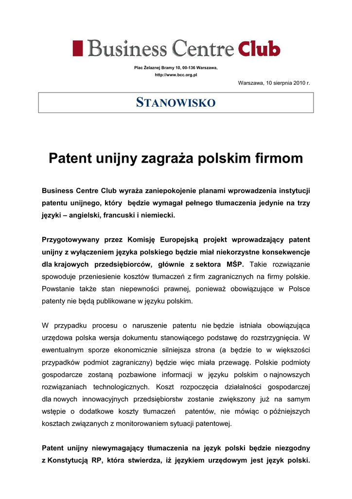 Plac Żelaznej Bramy 10, 00-136 Warszawa, http://www.bcc.org.pl Warszawa, 10 sierpnia 2010 r. STANOWISKO Patent unijny zagraża polskim firmom Business Centre Club wyraża zaniepokojenie planami wprowadzenia instytucji patentu unijnego, który będzie wymagał pełnego tłumaczenia jedynie na trzy języki – angielski, francuski i niemiecki. Przygotowywany przez Komisję Europejską projekt wprowadzający patent unijny z wyłączeniem języka polskiego będzie miał niekorzystne konsekwencje dla krajowych przedsiębiorców, głównie z sektora MŚP. Takie rozwiązanie spowoduje przeniesienie kosztów tłumaczeń z firm zagranicznych na firmy polskie. Powstanie także stan niepewności prawnej, ponieważ obowiązujące w Polsce patenty nie będą publikowane w języku polskim. W przypadku procesu o naruszenie patentu nie będzie istniała obowiązująca urzędowa polska wersja dokumentu stanowiącego podstawę do rozstrzygnięcia. W ewentualnym sporze ekonomicznie silniejsza strona (a będzie to w większości przypadków podmiot zagraniczny) będzie więc miała przewagę. Polskie podmioty gospodarcze zostaną pozbawione informacji w języku polskim o najnowszych rozwiązaniach technologicznych. Koszt rozpoczęcia działalności gospodarczej dla nowych innowacyjnych przedsiębiorstw zostanie zwiększony już na samym wstępie o dodatkowe koszty tłumaczeń patentów, nie mówiąc o późniejszych kosztach związanych z monitorowaniem sytuacji patentowej. Patent unijny niewymagający tłumaczenia na język polski będzie niezgodny z Konstytucją RP, która stwierdza, iż językiem urzędowym jest język polski. Niezgodny będzie również z jedną z podstawowych zasad Unii Europejskiej, jaką jest respektowanie różnorodności językowej państw członkowskich. Optymalnym rozwiązaniem byłoby dołączenie języka polskiego do listy oficjalnych języków, na które będą tłumaczone patenty (ewentualnie dołączenie również języka włoskiego i hiszpańskiego, ponieważ ludność tych w sumie sześciu państw stanowi ponad 70 procent ludności UE). Rozwiązaniem minimalnym natomiast może być zapewnienie, aby w przyszłej legislacji znalazły się postanowienia gwarantujące – na życzenie danego kraju członkowskiego – obowiązek tłumaczenia pełnych tekstów patentów unijnych na język tego kraju. BCC zwrócił się w tej sprawie do ministra gospodarki Waldemara Pawlaka z wnioskiem o uwzględnienie powyższych argumentów w rozmowach z najwyższymi przedstawicielami instytucji i krajów Unii Europejskiej. Krzysztof Ostrowski dyr. Biura Interwencji BCC, członek EKES 602 399 642, [email protected] Business Centre Club istnieje od 1991 roku. Jest największą w kraju organizacją indywidualnych pracodawców. Zrzesza 2500 członków (osób i firm). Wśród członków BCC znajdują się największe międzynarodowe korporacje, instytucje finansowe, ubezpieczeniowe, firmy telekomunikacyjne, najwięksi polscy producenci, uczelnie wyższe, koncerny wydawnicze itd. Członkami Klubu są także prawnicy, dziennikarze, naukowcy, wydawcy, lekarze, wojskowi i studenci. BCC koncentruje się na działaniach lobbingowych, których celem jest rozwój polskiej gospodarki, zwiększenie liczby miejsc pracy i pomoc przedsiębiorcom. Związek Pracodawców BCC jest członkiem Komisji Trójstronnej. Członkowie Klubu, reprezentujący blisko 250 miast, skupiają się w 24 lożach regionalnych na terenie całej Polski. Koordynatorem wszystkich działań BCC jest prezes Marek Goliszewski. Więcej: http://www.bcc.org.pl Kontakty prasowe: http://www.bcc.org.pl/Eksperci.244.0.html