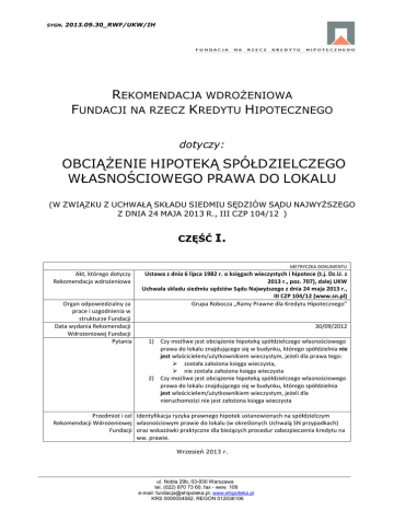 SYGN. 2013.09.30_RWF/UKW/IH REKOMENDACJA WDROŻENIOWA FUNDACJI NA RZECZ KREDYTU HIPOTECZNEGO dotyczy: OBCIĄŻENIE HIPOTEKĄ SPÓŁDZIELCZEGO WŁASNOŚCIOWEGO PRAWA DO LOKALU (W ZWIĄZKU Z UCHWAŁĄ SKŁADU SIEDMIU SĘDZIÓW SĄDU NAJWYŻSZEGO Z DNIA 24 MAJA 2013 R., III CZP 104/12 ) CZĘŚĆ I. METRYCZKA DOKUMENTU Akt, którego dotyczy Rekomendacja wdrożeniowa Organ odpowiedzialny za prace i uzgodnienia w strukturze Fundacji Data wydania Rekomendacji Wdrożeniowej Fundacji Pytania Ustawa z dnia 6 lipca 1982 r. o księgach wieczystych i hipotece (t.j. Dz.U. z 2013 r., poz. 707), dalej UKW Uchwała składu siedmiu sędziów Sądu Najwyższego z dnia 24 maja 2013 r., III CZP 104/12 (www.sn.pl) Grupa Robocza „Ramy Prawne dla Kredytu Hipotecznego” 30/09/2012 1) Czy możliwe jest obciążenie hipoteką spółdzielczego własnościowego prawa do lokalu znajdującego się w budynku, którego spółdzielnia nie jest właścicielem/użytkownikiem wieczystym, jeżeli dla prawa tego: została założona księga wieczysta, nie została założona księga wieczysta 2) Czy możliwe jest obciążenie hipoteką spółdzielczego własnościowego prawa do lokalu znajdującego się w budynku, którego spółdzielnia jest właścicielem/użytkownikiem wieczystym, jeżeli dla nieruchomości nie jest założona księga wieczysta Przedmiot i cel Identyfikacja ryzyka prawnego hipotek ustanowionych na spółdzielczym Rekomendacji Wdrożeniowej własnościowym prawie do lokalu (w określonych Uchwalą SN przypadkach) Fundacji oraz wskazówki praktyczne dla bieżących procedur zabezpieczenia kredytu na ww. prawie. Wrzesień 2013 r. ul. Nobla 29b, 03-930 Warszawa tel. (022) 870 73 60, fax - wew. 108 e-mail: [email protected], www.ehipoteka.pl KRS 0000054582, REGON 012036106 SYGN. 2013.09.30_RWF/UKW/IH CHARAKTER I CEL REKOMENDACJI WDROŻENIOWYCH FUNDACJI Realizując cel statutowy Fundacji na rzecz Kredytu Hipotecznego, tj. współtworzenie i monitorowanie prawnej infrastruktury dla kredytu hipotecznego w Polsce, w ramach zapoczątkowanego na 69 posiedzeniu Rady Programowej Fundacji projektu „Modelowe rozwiązania procedur wypełniających obowiązki banków, wynikające z przepisów nadzorczych i ustawowych”, niniejszym udostępnia się wskazówki praktyczne, przesądzające zgłoszone przez banki wątpliwości interpretacyjne. Niniejsza Rekomendacja Wdrożeniowa związana jest z koniecznością dostosowania oceny ryzyka prawnego zabezpieczeń kredytów jak również dostosowania praktyki bankowej do orzecznictwa Sadu Najwyższego. Rekomendacje wdrożeniowe Fundacji mają charakter ekspercki, opierają się na wnioskach analiz biura Fundacji (analizy prawne i prawnoporównawcze oraz funkcjonalne) oraz na uzgodnieniach bankowo-resortowych grup roboczych działających przy Fundacji, jak również wymianie opinii z odpowiednimi organami administracji, w wielu przypadkach – analizie źródłowych, implementowanych dyrektyw, ustaw, orzecznictwa i praktyki wdrożeniowej. Celem szerszego udostępnienia Rekomendacji Wdrożeniowych Fundacji jest: • minimalizacja ryzyka bankowego, odpowiedzialności władz banku i ograniczenie kosztów powstających w związku z potencjalnie nieprawidłowym wdrożeniem nowych przepisów; • ujednolicenie poziomu wdrożeń regulacji (wypośrodkowanie zbyt daleko idących i kosztownych procedur i sprostanie prawnym wymogom) • w braku jasności interpretacyjnej organu źródła prawa – wypracowanie najrozsądniejszej w danych warunkach praktyki wdrożeniowej – dla której obroną będzie powszechność danego standardu. ul. Nobla 29b, 03-930 Warszawa tel. (022) 870 73 60, fax - wew. 108 e-mail: [email protected], www.ehipoteka.pl KRS 0000054582, REGON 012036106 Strona 2 z 9 SYGN. 2013.09.30_RWF/UKW/IH I. ZIDENTYFIKOWANE PRZEZ BANKI ŹRÓDŁA I TŁO PROBLEMÓW WDROŻENIOWYCH Dnia 24 maja 2013 r. Sąd Najwyższy w składzie Siedmiu Sędziów podjął uchwałę w sprawie sygn. akt III CZP 104/12 następującej treści: „Spółdzielcze własnościowe prawo do lokalu ustanowione w budynku położonym na gruncie, do którego spółdzielni nie przysługuje własność albo użytkowanie wieczyste, stanowi ekspektatywę tego prawa; niedopuszczalne jest założenie księgi wieczystej w celu jej ujawnienia.”. Jest to uchwała o treści odmiennej niż uchwała z dnia 30 maja 1994 r., III CZP 79/94, w której Sąd orzekł, że założenie księgi wieczystej w celu ustalenia stanu prawnego własnościowego prawa do lokalu mieszkalnego w budynku stanowiącym własność spółdzielni nie jest uzależnione od uregulowania tytułu prawnego spółdzielni do nieruchomości, na której znajduje się budynek mieszkalny oraz uchwała Sądu Najwyższego z dnia 28 września 1994 r., III CZP 121/94 (Rejent 1996, nr 3, s. 123), w której Sąd orzekł, że brak uregulowania tytułu prawnego spółdzielni mieszkaniowej do nieruchomości, na której znajduje się budynek mieszkalny należący do spółdzielni, nie stanowi przeszkody do założenia księgi wieczystej w celu ujawnienia w niej praw wymienionych w art. 241 u.k.w.h. Przepis ten dotyczył własnościowego spółdzielczego prawa do lokalu mieszkalnego, spółdzielczego prawa do lokalu użytkowego i prawa do domu jednorodzinnego w spółdzielni mieszkaniowej. W uzasadnieniu uchwały z dnia 24 maja 2013 r. Sąd Najwyższy zajął się głównie krytyką powołanych wyżej uchwał Sądu Najwyższego z 1994 r. oraz uzasadnieniem tezy opartym głównie na przepisach ustawy Prawo spółdzielcze. Natomiast nie przeanalizował skutków prawnych, jakie będą wynikiem podjęcia takiej uchwały ani dla już zawartych umów o ustanowienie „spółdzielczego własnościowego prawa do lokalu”, ani dla już założonych ksiąg wieczystych dla takich „praw”. Kierując się uchwałami Sądu Najwyższego z 1994 r. spółdzielnie mieszkaniowe ustanawiały na rzecz swoich członków własnościowe spółdzielcze prawa do lokalu nawet w sytuacji, gdy 