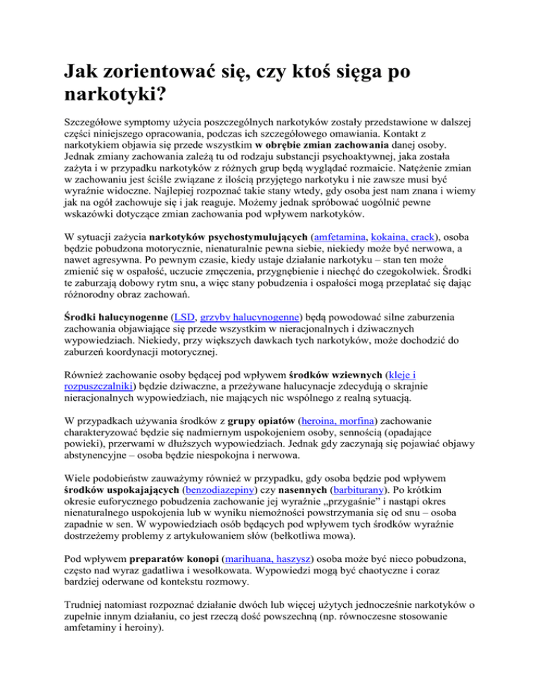 Jak zorientować się, czy ktoś sięga po narkotyki? Szczegółowe symptomy użycia poszczególnych narkotyków zostały przedstawione w dalszej części niniejszego opracowania, podczas ich szczegółowego omawiania. Kontakt z narkotykiem objawia się przede wszystkim w obrębie zmian zachowania danej osoby. Jednak zmiany zachowania zależą tu od rodzaju substancji psychoaktywnej, jaka została zażyta i w przypadku narkotyków z różnych grup będą wyglądać rozmaicie. Natężenie zmian w zachowaniu jest ściśle związane z ilością przyjętego narkotyku i nie zawsze musi być wyraźnie widoczne. Najlepiej rozpoznać takie stany wtedy, gdy osoba jest nam znana i wiemy jak na ogół zachowuje się i jak reaguje. Możemy jednak spróbować uogólnić pewne wskazówki dotyczące zmian zachowania pod wpływem narkotyków. W sytuacji zażycia narkotyków psychostymulujących (amfetamina, kokaina, crack), osoba będzie pobudzona motorycznie, nienaturalnie pewna siebie, niekiedy może być nerwowa, a nawet agresywna. Po pewnym czasie, kiedy ustaje działanie narkotyku – stan ten może zmienić się w ospałość, uczucie zmęczenia, przygnębienie i niechęć do czegokolwiek. Środki te zaburzają dobowy rytm snu, a więc stany pobudzenia i ospałości mogą przeplatać się dając różnorodny obraz zachowań. Środki halucynogenne (LSD, grzyby halucynogenne) będą powodować silne zaburzenia zachowania objawiające się przede wszystkim w nieracjonalnych i dziwacznych wypowiedziach. Niekiedy, przy większych dawkach tych narkotyków, może dochodzić do zaburzeń koordynacji motorycznej. Również zachowanie osoby będącej pod wpływem środków wziewnych (kleje i rozpuszczalniki) będzie dziwaczne, a przeżywane halucynacje zdecydują o skrajnie nieracjonalnych wypowiedziach, nie mających nic wspólnego z realną sytuacją. W przypadkach używania środków z grupy opiatów (heroina, morfina) zachowanie charakteryzować będzie się nadmiernym uspokojeniem osoby, sennością (opadające powieki), przerwami w dłuższych wypowiedziach. Jednak gdy zaczynają się pojawiać objawy abstynencyjne – osoba będzie niespokojna i nerwowa. Wiele podobieństw zauważymy również w przypadku, gdy osoba będzie pod wpływem środków uspokajających (benzodiazepiny) czy nasennych (barbiturany). Po krótkim okresie euforycznego pobudzenia zachowanie jej wyraźnie „przygaśnie” i nastąpi okres nienaturalnego uspokojenia lub w wyniku niemożności powstrzymania się od snu – osoba zapadnie w sen. W wypowiedziach osób będących pod wpływem tych środków wyraźnie dostrzeżemy problemy z artykułowaniem słów (bełkotliwa mowa). Pod wpływem preparatów konopi (marihuana, haszysz) osoba może być nieco pobudzona, często nad wyraz gadatliwa i wesołkowata. Wypowiedzi mogą być chaotyczne i coraz bardziej oderwane od kontekstu rozmowy. Trudniej natomiast rozpoznać działanie dwóch lub więcej użytych jednocześnie narkotyków o zupełnie innym działaniu, co jest rzeczą dość powszechną (np. równoczesne stosowanie amfetaminy i heroiny). Działanie większości narkotyków można również identyfikować na podstawie wyglądu oczu oraz reakcji źrenic na światło. Po otwarciu oczu w jasno oświetlonym pomieszczeniu źrenice błyskawicznie zwężają się, a następnie powoli, przyzwyczajając się do natężenia światła, powiększają się. Większość substancji psychoaktywnych zaburza ten proces. Środki pobudzające i halucynogenne powodują zazwyczaj powiększenie źrenic. Działanie heroiny powoduje, że oczy są szkliste, a źrenice ekstremalnie zwężone. Po wypaleniu marihuany bądź haszyszu białka oczu mogą być przekrwione. Do zażywania większości narkotyków służą specyficzne akcesoria, na podstawie których możemy próbować rozpoznawać, jaka substancja jest zażywana: I tak do palenia marihuany służą zazwyczaj szklane lufki i fifki, różnych kształtów fajki drewniane lub gliniane (na ogół mniejsze niż te, w których palony jest tytoń). Do palenia haszyszu, który często mieszany jest z tytoniem potrzebne są bibułki i maszynki do robienia skrętów. Niekiedy, szczególnie podczas zbiorowego palenia preparatów konopi, używa się prymitywnych fajek wodnych zrobionych z plastikowych butelek. Środki takie, jak amfetamina czy kokaina (niekiedy heroina) stosowane są poprzez tzw. snifowanie, czyli wciąganie do nosa i umożliwianie przedostawania się substancji psychoaktywnej do krwioobiegu przez śluzówkę. Tutaj najczęstszymi akcesoriami są różnego rodzaju rurki (np. krótko przycięte słomki). Gładką powierzchnię, na której usypywane są za pomocą żyletek lub kart telefonicznych „ścieżki” proszku stanowią np. lusterka. Palenie brązowej wersji heroiny wymaga folii aluminiowej, na której narkotyk jest podgrzewany, a powstające opary wciągane przez usta. Przyjmowanie narkotyków poprzez iniekcje (najczęściej „kompot”, brązowa heroina, amfetamina) wymaga posiadania nie tylko igieł i strzykawek, ale także innych przyborów: łyżki do rozpuszczania narkotyku z wodą (łyżka zwykle jest okopcona od podgrzewania); kwasku cytrynowego, który ułatwia rozpuszczanie; kawałka waty lub filtru papierosowego do odfiltrowania zanieczyszczeń. Zażywanie środków wziewnych (kleje i rozpuszczalniki) odbywa się najczęściej z plastikowych woreczków lub kawałków nasączonych tymi substancjami szmatek. Testy do wykrywania narkotyków Najprostszą i najtańszą metodą wykrywania narkotyków w organizmie są testy do badania obecności narkotyków, a dokładnie ich metabolitów w moczu. Są one dostępne w wielu aptekach za stosunkowo niewielką kwotę (10–20 zł). Trudność polega na tym, że każdy z nich wykrywa jeden konkretny narkotyk bądź jedną grupę narkotyków. W związku z tym, kupując test w aptece, powinniśmy wiedzieć o użycie jakiego narkotyku osobę badaną podejrzewamy. Z reguły opisywane 