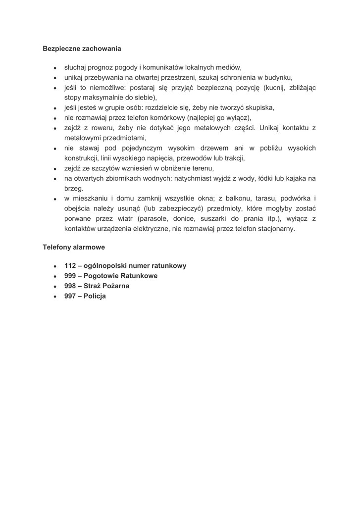 Bezpieczne zachowania słuchaj prognoz pogody i komunikatów lokalnych mediów, unikaj przebywania na otwartej przestrzeni, szukaj schronienia w budynku, jeśli to niemożliwe: postaraj się przyjąć bezpieczną pozycję (kucnij, zbliżając stopy maksymalnie do siebie), jeśli jesteś w grupie osób: rozdzielcie się, żeby nie tworzyć skupiska, nie rozmawiaj przez telefon komórkowy (najlepiej go wyłącz), zejdź z roweru, żeby nie dotykać jego metalowych części. Unikaj kontaktu z metalowymi przedmiotami, nie stawaj pod pojedynczym wysokim drzewem ani w pobliżu wysokich konstrukcji, linii wysokiego napięcia, przewodów lub trakcji, zejdź ze szczytów wzniesień w obniżenie terenu, na otwartych zbiornikach wodnych: natychmiast wyjdź z wody, łódki lub kajaka na brzeg. w mieszkaniu i domu zamknij wszystkie okna; z balkonu, tarasu, podwórka i obejścia należy usunąć (lub zabezpieczyć) przedmioty, które mogłyby zostać porwane przez wiatr (parasole, donice, suszarki do prania itp.), wyłącz z kontaktów urządzenia elektryczne, nie rozmawiaj przez telefon stacjonarny. Telefony alarmowe 112 – ogólnopolski numer ratunkowy 999 – Pogotowie Ratunkowe 998 – Straż Pożarna 997 – Policja
