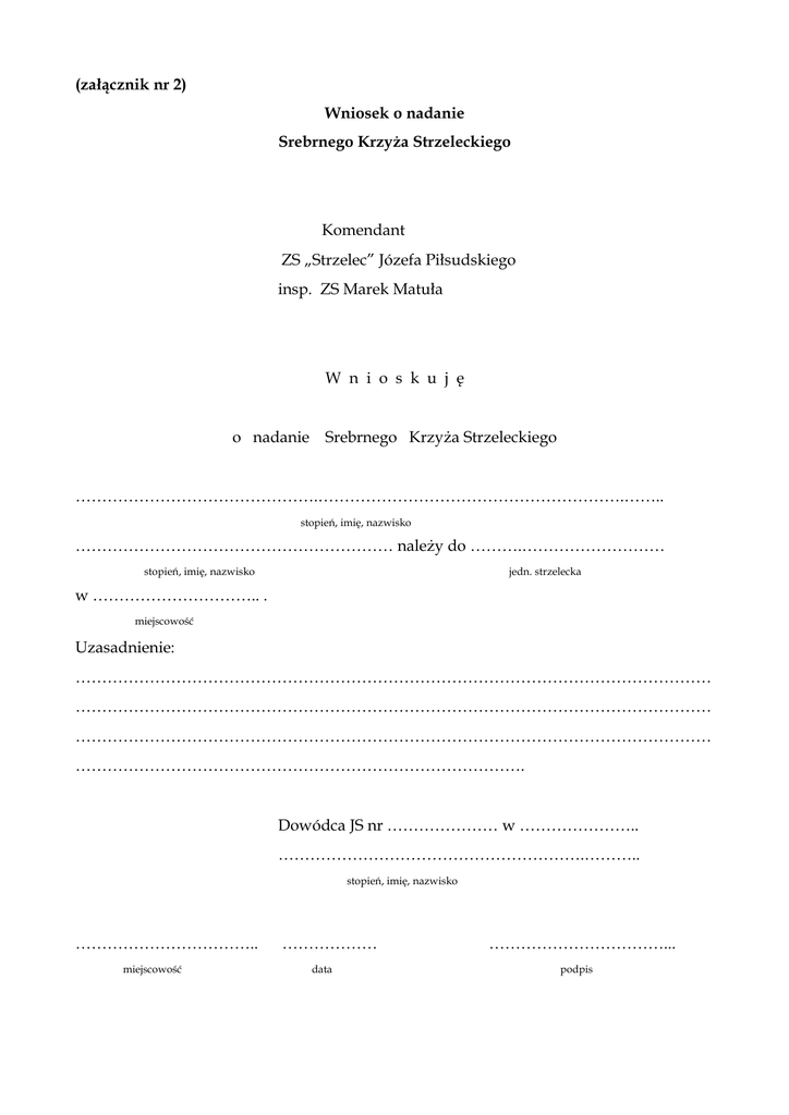 (załącznik nr 2) Wniosek o nadanie Srebrnego Krzyża Strzeleckiego Komendant ZS „Strzelec” Józefa Piłsudskiego insp. ZS Marek Matuła W n i o s k u j ę o nadanie Srebrnego Krzyża Strzeleckiego ……………………………………….………………………………………………….…….. stopień, imię, nazwisko …………………………………………………… należy do ……….……………………… stopień, imię, nazwisko jedn. strzelecka w ………………………….. . miejscowość Uzasadnienie: ………………………………………………………………………………………………………… ………………………………………………………………………………………………………… ………………………………………………………………………………………………………… …………………………………………………………………………. Dowódca JS nr ………………… w ………………….. ………………………………………………….……….. stopień, imię, nazwisko …………………………….. miejscowość ……………… data ……………………………... podpis