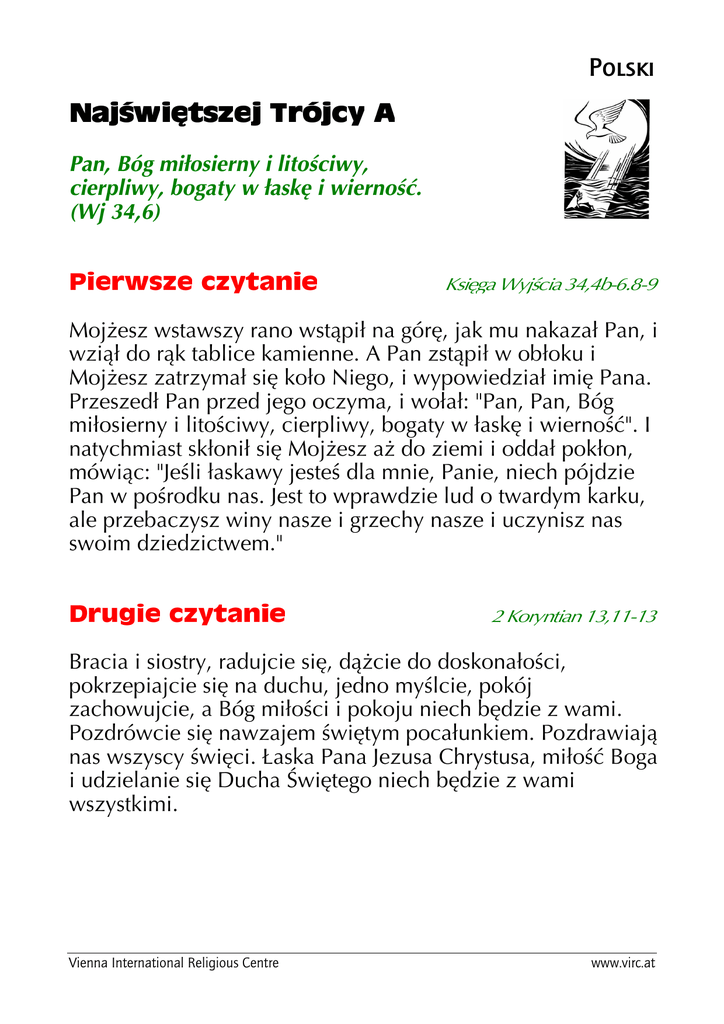 Polski Pan, Bóg miłosierny i litościwy, cierpliwy, bogaty w łaskę i wierność. (Wj 34,6) Mojżesz wstawszy rano wstąpił na górę, jak mu nakazał Pan, i wziął do rąk tablice kamienne. A Pan zstąpił w obłoku i Mojżesz zatrzymał się koło Niego, i wypowiedział imię Pana. Przeszedł Pan przed jego oczyma, i wołał: "Pan, Pan, Bóg miłosierny i litościwy, cierpliwy, bogaty w łaskę i wierność". I natychmiast skłonił się Mojżesz aż do ziemi i oddał pokłon, mówiąc: "Jeśli łaskawy jesteś dla mnie, Panie, niech pójdzie Pan w pośrodku nas. Jest to wprawdzie lud o twardym karku, ale przebaczysz winy nasze i grzechy nasze i uczynisz nas swoim dziedzictwem." Bracia i siostry, radujcie się, dążcie do doskonałości, pokrzepiajcie się na duchu, jedno myślcie, pokój zachowujcie, a Bóg miłości i pokoju niech będzie z wami. Pozdrówcie się nawzajem świętym pocałunkiem. Pozdrawiają nas wszyscy święci. Łaska Pana Jezusa Chrystusa, miłość Boga i udzielanie się Ducha Świętego niech będzie z wami wszystkimi. Vienna International Religious Centre www.virc.at Jezus powiedział do Nikodema: "Tak Bóg umiłował świat, że Syna swego Jednorodzonego dał, aby każdy, kto w Niego wierzy, nie zginął, ale miał życie wieczne. Albowiem Bóg nie posłał swego Syna na świat po to, aby świat potępił, ale po to, by świat został przez Niego zbawiony. Kto wierzy w Niego, nie podlega potępieniu, a kto nie wierzy, już został potępiony, bo nie uwierzył w imię Jednorodzonego Syna Bożego." W jaki sposób możemy mówić o Bogu; Tym, którego nie da się wymówić? Jego, którego nie da się pojąć, pojmować? Przed Nim jesteśmy jak dziecko, które próbuje pojąć nieskończoną otchłań morza. Ono czerpie wodę, a jest tak, jakby żadna kropla morzu nie ubyła; czerpie wodę na ziemię i widzi jednocześnie jak znika w piasku. Jak powinno się wyjaśnić coś, co wykracza poza wszelkie granice? Jak można o tym opowiadać, jeżeli nie ma się przynajmniej pewnego podstawowego doświadczenia związanego z nieskończonością morza? Czy nie lepiej zanużyć się w oceanie i zagubić się w jego bezgranicznej wielkości, aby go poznać? Podobnie ma się z Bogiem. Nie można mówić o Bogu, jeśli się wcześniej nie nauczyło z Nim rozmawiać. O tym mówią wielkie wzorce modlitwy. My jesteśmy zawsze udzielającymi odpowiedzi na inicjatywę Boga. Boga, który ukazuje się nam we wnętrzu serca i naszej wiary. Tylko Bóg może mówić o Bogu i czyni to poprzez wcielenie Jezusa Chrystusa. Jezus Chrystus jest wcielonym obliczem miłości Boga do nas. Chrystus jest prawdziwym człowiekiem i prawdziwym Bogiem jednocześnie. W nim pełnia Boskości przyjęła konkretną formę, a duch porusza Go, gdy mówi do swojego Ojca: Abba! Tatusiu! Każda próba wyjaśnienia Trójcy świętej pozostaje niewystarczająca. Trójca święta pozostaje tajemnicą, tj. rzeczywistością, która przekracza granice wszelkiej wyobraźni. To, co jest nam mówione o Bogu, jest próbą pojęcia niezmierzonego oceanu: wciąż będziemy kierowani na ostateczną niemożliwość pojęcia Boga. Jan otwiera nam wymiar tego niepojętego Boga poprzez zbliżenie do Niego w wypowiedzi: "Tak bowiem Bóg umiłowała świat, że Syna swego Jednorodzonego dał, aby każdy kto w Niego wierzy, nie zginął, ale miał życie wieczne". Bóg chce nas jako przyjaciół. On chce dzielić się swoją miłością i swoją obecnością. W nieskończonej, przekraczającej wszystko co ziemskie, miłości chce z nami dzielić chleb życia. Komuś powiedzieć, że się go kocha, oznacza powiedzieć mu, że on nigdy nie umrze. Nic innego nie mówi Bóg w i przez Jezusa Chrystusa do nas. Vienna International Religious Centre [email protected]