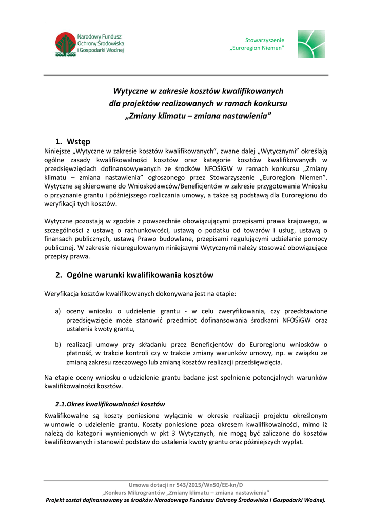 Stowarzyszenie „Euroregion Niemen” Wytyczne w zakresie kosztów kwalifikowanych dla projektów realizowanych w ramach konkursu „Zmiany klimatu – zmiana nastawienia” 1. Wstęp Niniejsze „Wytyczne w zakresie kosztów kwalifikowanych”, zwane dalej „Wytycznymi” określają ogólne zasady kwalifikowalności kosztów oraz kategorie kosztów kwalifikowanych w przedsięwzięciach dofinansowywanych ze środków NFOŚiGW w ramach konkursu „Zmiany klimatu – zmiana nastawienia” ogłoszonego przez Stowarzyszenie „Euroregion Niemen”. Wytyczne są skierowane do Wnioskodawców/Beneficjentów w zakresie przygotowania Wniosku o przyznanie grantu i późniejszego rozliczania umowy, a także są podstawą dla Euroregionu do weryfikacji tych kosztów. Wytyczne pozostają w zgodzie z powszechnie obowiązującymi przepisami prawa krajowego, w szczególności z ustawą o rachunkowości, ustawą o podatku od towarów i usług, ustawą o finansach publicznych, ustawą Prawo budowlane, przepisami regulującymi udzielanie pomocy publicznej. W zakresie nieuregulowanym niniejszymi Wytycznymi należy stosować obowiązujące przepisy prawa. 2. Ogólne warunki kwalifikowania kosztów Weryfikacja kosztów kwalifikowanych dokonywana jest na etapie: a) oceny wniosku o udzielenie grantu - w celu zweryfikowania, czy przedstawione przedsięwzięcie może stanowić przedmiot dofinansowania środkami NFOŚiGW oraz ustalenia kwoty grantu, b) realizacji umowy przy składaniu przez Beneficjentów do Euroregionu wniosków o płatność, w trakcie kontroli czy w trakcie zmiany warunków umowy, np. w związku ze zmianą zakresu rzeczowego lub zmianą kosztów realizacji przedsięwzięcia. Na etapie oceny wniosku o udzielenie grantu badane jest spełnienie potencjalnych warunków kwalifikowalności kosztów. 2.1.Okres kwalifikowalności kosztów Kwalifikowalne są koszty poniesione wyłącznie w okresie realizacji projektu określonym w umowie o udzielenie grantu. Koszty poniesione poza okresem kwalifikowalności, mimo iż należą do kategorii wymienionych w pkt 3 Wytycznych, nie mogą być zaliczone do kosztów kwalifikowanych i stanowić podstaw do ustalenia kwoty grantu oraz późniejszych wypłat. Umowa dotacji nr 543/2015/Wn50/EE-kn/D „Konkurs Mikrograntów „Zmiany klimatu – zmiana nastawienia” Projekt został dofinansowany ze środków Narodowego Funduszu Ochrony Środowiska i Gospodarki Wodnej. Stowarzyszenie „Euroregion Niemen” 2.2.Warunki kwalifikowalności kosztów Za koszty kwalifikowane w ramach przedsięwzięcia uznane będą koszty faktycznie poniesione przez Beneficjenta spełniające wszystkie poniższe warunki łącznie: a) są zgodne z obowiązującymi przepisami prawa, b) są niezbędne do realizacji przedsięwzięcia oraz zapewniają wdrożenie i funkcjonowanie przedsięwzięcia oraz uzyskanie określonego efektu ekologicznego, c) są poniesione w okresie kwalifikowalności kosztów, d) są poniesione przez Beneficjenta, e) są zgodne z umową o dofinansowanie, f) są udokumentowane i możliwe do zidentyfikowania w szczególności poprzez wprowadzenie ich do ewidencji księgowej Beneficjenta oraz ustalone zgodnie z odpowiednimi standardami rachunkowości, g) nie podlegają wyłączeniu z finansowania przez NFOŚiGW, o których mowa w pkt 4 Wytycznych, lub określonych w programie priorytetowym „Edukacja ekologiczna”. 2.3. Podmiot uprawniony do ponoszenia kosztów kwalifikowanych Podmiotem uprawnionym do ponoszenia kosztów kwalifikowanych jest Beneficjent. 2.4. Zakaz podwójnego finansowania Niedozwolone jest podwójne finansowanie całkowitych lub częściowych kosztów przedsięwzięcia ze środków publicznych (krajowych, unijnych lub zagranicznych). Jako przykłady podwójnego finansowania uznaje się: a) zrefundowanie tego samego kosztu w ramach różnych przedsięwzięć współfinansowanych z krajowych środków publicznych, funduszy strukturalnych lub Funduszu Spójności, b) zrefundowanie poniesionego podatku od towarów i usług (VAT) z krajowych środków publicznych, a następnie odzyskanie tego podatku ze środków budżetu państwa w oparciu o ustawę o podatku od towarów i usług (VAT), c) zakupienie środka trwałego ze środków unijnych/zagranicznych lub krajowych środków publicznych, a następnie uznanie kosztów amortyzacji tego środka trwałego za kwalifikowane z krajowych środków publicznych, d) finansowanie wynagrodzenia osoby zaangażowanej w realizację przedsięwzięcia Umowa dotacji nr 543/2015/Wn50/EE-kn/D „Konkurs Mikrograntów „Zmiany klimatu – zmiana nastawienia” Projekt został dofinansowany ze środków Narodowego Funduszu Ochrony Środowiska i Gospodarki Wodnej. Stowarzyszenie „Euroregion Niemen” wykonującej zadania, które mieszczą się w zakresie obowiązków służbowych wynikających ze stosunku pracy tej osoby. 2.5. Podatek od towarów i usług (VAT) Podatek od towarów i usług (VAT) jest kosztem kwalifikowanym tylko wówczas, gdy jest on faktycznie i ostatecznie ponoszony przez Beneficjenta, a Beneficjent nie ma prawnej możliwości odliczenia podatku naliczonego od podatku należnego w jakiejkolwiek części, zgodnie z przepisami ustawy o podatku od towarów i usług. Podatek VAT, który można odliczyć, nie może być uznany za kwalifikowany, nawet jeżeli nie został faktycznie odzyskany przez Beneficjenta. Oznacza to, że w przypadkach, gdy Beneficjent może odliczyć podatek VAT, ale rezygnuje z tej możliwości, podatek VAT nie jest kosztem kwalifikowanym. Beneficjent zobowiązany jest złożyć oświadczenie, że w ramach realizowanego przedsięwzięcia będzie miał/nie będzie miał możliwości odliczenia podatku VAT poniesionego w związku z realizacją przedsięwzięcia. 3. Kategorie kosztów kwalifikowanych 3.1. Przygotowanie przedsięwzięcia Koszty związane z przygotowaniem przedsięwzięcia nie są kosztami kwalifikowalnymi w ramach konkursu „Zmiany klimatu – zmiana nastawienia”. 3.2. Z