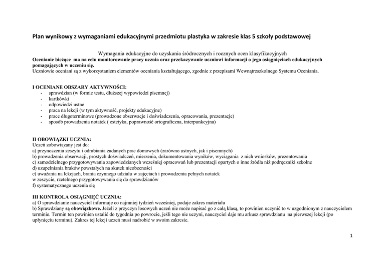 Plan wynikowy z wymaganiami edukacyjnymi przedmiotu plastyka w zakresie klas 5 szkoły podstawowej Wymagania edukacyjne do uzyskania śródrocznych i rocznych ocen klasyfikacyjnych Ocenianie bieżące ma na celu monitorowanie pracy ucznia oraz przekazywanie uczniowi informacji o jego osiągnięciach edukacyjnych pomagających w uczeniu się. Uczniowie oceniani są z wykorzystaniem elementów oceniania kształtującego, zgodnie z przepisami Wewnątrzszkolnego Systemu Oceniania. I OCENIANE OBSZARY AKTYWNOŚCI: - sprawdzian (w formie testu, dłuższej wypowiedzi pisemnej) - kartkówki - odpowiedzi ustne - praca na lekcji (w tym aktywność, projekty edukacyjne) - prace długoterminowe (prowadzone obserwacje i doświadczenia, opracowania, prezentacje) - sposób prowadzenia notatek ( estetyka, poprawność ortograficzna, interpunkcyjna) II OBOWIĄZKI UCZNIA: Uczeń zobowiązany jest do: a) przynoszenia zeszytu i odrabiania zadanych prac domowych (zarówno ustnych, jak i pisemnych) b) prowadzenia obserwacji, prostych doświadczeń, mierzenia, dokumentowania wyników, wyciągania z nich wniosków, prezentowania c) samodzielnego przygotowywania zapowiedzianych wcześniej opracowań lub prezentacji opartych o inne źródła niż podręczniki szkolne d) uzupełniania braków powstałych na skutek nieobecności e) uważania na lekcjach, brania czynnego udziału w zajęciach i prowadzenia pełnych notatek w zeszycie, rzetelnego przygotowywania się do sprawdzianów f) systematycznego uczenia się III KONTROLA OSIĄGNIĘĆ UCZNIA: a) O sprawdzianie nauczyciel informuje co najmniej tydzień wcześniej, podaje zakres materiału b) Sprawdziany są obowiązkowe. Jeżeli z przyczyn losowych uczeń nie może napisać go z całą klasą, to powinien uczynić to w uzgodnionym z nauczycielem terminie. Termin ten powinien ustalić do tygodnia po powrocie, jeśli tego nie uczyni, nauczyciel daje mu arkusz sprawdzianu na pierwszej lekcji (po upłynięciu terminu). Zakres tej lekcji uczeń musi nadrobić w swoim zakresie. 1 c) Nauczyciel udostępnia prace pisemne niezwłocznie po ich ocenieniu uczniom i rodzicom(prawnym opiekunom). Uczeń zielonym długopisem dokonuje poprawy błędnych odpowiedzi, po czym bierze pracę do domu i do 7 dni od daty otrzymania zwraca ją nauczycielowi. d) Nauczyciel może bez uprzedzenia przeprowadzić kartkówkę z trzech ostatnich tematów. Uczeń wkleja kartkówkę do zeszytu i daje do podpisu Rodzicowi. e) Uczeń ma prawo 2 razy w półroczu zgłosić brak przygotowania do zajęć bez podania przyczyny. Należy to zrobić w momencie sprawdzania listy obecności, po wyczytaniu nazwiska ucznia. Prawo to nie dotyczy lekcji, na której przeprowadzane są zapowiedziane sprawdziany. W dzienniku zostaje ten fakt odnotowany jako” np”. „Np.” rozumiane jest jako brak pracy domowej, zeszytu, brak opanowania materiału z trzech poprzednich lekcji. g) Na bieżąco uczeń może być zapytany do 3 tematów wstecz. Powtórzenie większej partii materiału wymaga zapowiedzenia tydzień wcześniej. h) Ocena bieżąca może być wyrażona słownie (np. bardzo ładnie, świetnie, brawo, popracuj nad…, pomyśl, poćwicz itp.) lub oceną w skali 1-6. i) Wszystkie prace pisemne sumujące muszą być opatrzone punktacją, komentarzem (zawiera informację o tym co uczeń robi dobrze, co i jak wymaga poprawy oraz jak powinien dalej się uczyć), a ich ocena obliczona wg skali: ocena ocena celująca ocena bardzo dobra ocena dobra ocena dostateczna ocena dopuszczająca ocena niedostateczna procent liczby punktów 96% - 100% oraz w całości wykonane zadanie dodatkowe lub twórcze, oryginalne rozwiązanie 86% - 95% 70% -85% 50% - 69% 30% - 49% do 29% IV TRYB POPRAWIANIA OCEN: a) Uczeń ma prawo poprawiać bieżącą ocenę sumującą. b) Poprawa jest dobrowolna i musi odbywać się poza lekcjami. c) Termin poprawy uczeń uzgadnia z nauczycielem do dwóch tygodni od czasu otrzymania oceny. d) Nową ocenę zapisuje się obok poprawianej. e) Zadania domowe uczeń powinien poprawić na lekcję następną. Wyjątkowo, jeżeli zadanie było pracochłonne lub jego realizacja trwała dłuższy czas, uczeń uzgadnia z nauczycielem termin oddania pracy (maksymalnie 2 tygodnie). 2 V OCENIANIE UCZNIA ZE SPECYFICZNYMI POTRZEBAMI EDUKACYJNYMI: 1. Kryteria oceniania wiedzy i umiejętności przedmiotowych są dostosowywane do indywidualnych możliwości ucznia z uwzględnieniem wskazówek zawartych w opiniach i orzeczeniach Poradni Psychologiczno- Pedagogicznej. 2. W głównej mierze oceniany jest wkład pracy w realizowane zadanie, zaangażowanie w dążeniu do celu, pozytywna motywacja do nauki, jak również wytrwałość, systematyczność, przygotowanie do zajęć oraz wywiązywanie się z obowiązków szkolnych. 3. Sposoby dostosowania wymagań edukacyjnych a) dla ucznia z upośledzeniem umysłowym w stopniu lekkim: zmniejszanie ilości, stopnia trudności i obszerności zadań dzielenie materiału na mniejsze partie, wyznaczanie czasu na ich opanowanie i odpytywanie odwoływanie się do znanych sytuacji z życia codziennego częste podchodzenie do ucznia w trakcie samodzielnej pracy w celu udzielania dodatkowej pomocy, wyjaśnień należy zezwolić na dokończenie w domu niektórych prac wykonywanych na lekcjach większa ilość czasu i powtórzeń na opanowanie materiału w związku z dużym problemem w selekcji i wyborze najważniejszych informacji z danego tematu można wypisać kilka podstawowych pytań, na które uczeń powinien znaleźć odpowiedź, czytając dany materiał (przy odpytywaniu prosić o udzielenie na nie odpowiedzi) b) dla ucznia z dysleksją rozwojową: - miarę możliwości pomagać, wspierać, dodatkowo instruować, naprowadzać, pokazywać na przykładzie - dzielić dane zadanie na etapy i zachęcać do wykonywania malutkimi krokami - starać się, aby uczeń doprowadził rozpoczętą pracę do całkowitego wykonania - podczas oceniania brać przede wszystkim pod uwagę stosunek uc
