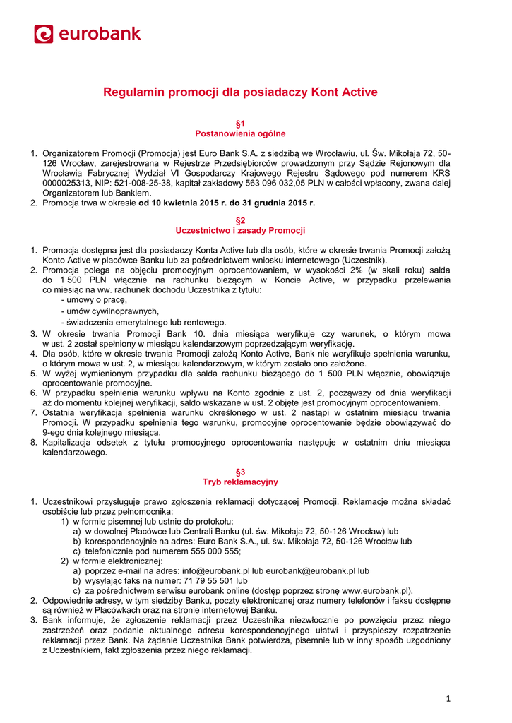 Regulamin promocji dla posiadaczy Kont Active §1 Postanowienia ogólne 1. Organizatorem Promocji (Promocja) jest Euro Bank S.A. z siedzibą we Wrocławiu, ul. Św. Mikołaja 72, 50126 Wrocław, zarejestrowana w Rejestrze Przedsiębiorców prowadzonym przy Sądzie Rejonowym dla Wrocławia Fabrycznej Wydział VI Gospodarczy Krajowego Rejestru Sądowego pod numerem KRS 0000025313, NIP: 521-008-25-38, kapitał zakładowy 563 096 032,05 PLN w całości wpłacony, zwana dalej Organizatorem lub Bankiem. 2. Promocja trwa w okresie od 10 kwietnia 2015 r. do 31 grudnia 2015 r. §2 Uczestnictwo i zasady Promocji 1. Promocja dostępna jest dla posiadaczy Konta Active lub dla osób, które w okresie trwania Promocji założą Konto Active w placówce Banku lub za pośrednictwem wniosku internetowego (Uczestnik). 2. Promocja polega na objęciu promocyjnym oprocentowaniem, w wysokości 2% (w skali roku) salda do 1 500 PLN włącznie na rachunku bieżącym w Koncie Active, w przypadku przelewania co miesiąc na ww. rachunek dochodu Uczestnika z tytułu: - umowy o pracę, - umów cywilnoprawnych, - świadczenia emerytalnego lub rentowego. 3. W okresie trwania Promocji Bank 10. dnia miesiąca weryfikuje czy warunek, o którym mowa w ust. 2 został spełniony w miesiącu kalendarzowym poprzedzającym weryfikację. 4. Dla osób, które w okresie trwania Promocji założą Konto Active, Bank nie weryfikuje spełnienia warunku, o którym mowa w ust. 2, w miesiącu kalendarzowym, w którym zostało ono założone. 5. W wyżej wymienionym przypadku dla salda rachunku bieżącego do 1 500 PLN włącznie, obowiązuje oprocentowanie promocyjne. 6. W przypadku spełnienia warunku wpływu na Konto zgodnie z ust. 2, począwszy od dnia weryfikacji aż do momentu kolejnej weryfikacji, saldo wskazane w ust. 2 objęte jest promocyjnym oprocentowaniem. 7. Ostatnia weryfikacja spełnienia warunku określonego w ust. 2 nastąpi w ostatnim miesiącu trwania Promocji. W przypadku spełnienia tego warunku, promocyjne oprocentowanie będzie obowiązywać do 9-ego dnia kolejnego miesiąca. 8. Kapitalizacja odsetek z tytułu promocyjnego oprocentowania następuje w ostatnim dniu miesiąca kalendarzowego. §3 Tryb reklamacyjny 1. Uczestnikowi przysługuje prawo zgłoszenia reklamacji dotyczącej Promocji. Reklamacje można składać osobiście lub przez pełnomocnika: 1) w formie pisemnej lub ustnie do protokołu: a) w dowolnej Placówce lub Centrali Banku (ul. św. Mikołaja 72, 50-126 Wrocław) lub b) korespondencyjnie na adres: Euro Bank S.A., ul. św. Mikołaja 72, 50-126 Wrocław lub c) telefonicznie pod numerem 555 000 555; 2) w formie elektronicznej: a) poprzez e-mail na adres: [email protected] lub [email protected] lub b) wysyłając faks na numer: 71 79 55 501 lub c) za pośrednictwem serwisu eurobank online (dostęp poprzez stronę www.eurobank.pl). 2. Odpowiednie adresy, w tym siedziby Banku, poczty elektronicznej oraz numery telefonów i faksu dostępne są również w Placówkach oraz na stronie internetowej Banku. 3. Bank informuje, że zgłoszenie reklamacji przez Uczestnika niezwłocznie po powzięciu przez niego zastrzeżeń oraz podanie aktualnego adresu korespondencyjnego ułatwi i przyspieszy rozpatrzenie reklamacji przez Bank. Na żądanie Uczestnika Bank potwierdza, pisemnie lub w inny sposób uzgodniony z Uczestnikiem, fakt zgłoszenia przez niego reklamacji. 1 4. Bank zobowiązuje się do rozpatrzenia reklamacji niezwłocznie po jej otrzymaniu, nie później niż w terminie 14 Dni roboczych od daty wpływu reklamacji do Banku. Jeżeli termin 14 Dni roboczych nie jest wystarczający do udzielenia odpowiedzi i zachodzi konieczność przeprowadzenia dodatkowego postępowania wyjaśniającego, Bank informuje Uczestnika o przedłużeniu terminu i udziela odpowiedzi w terminie 30 dni kalendarzowych od daty wpływu reklamacji do Banku, z zastrzeżeniem ust. 5. 5. W szczególnie skomplikowanych przypadkach, uniemożliwiających rozpatrzenie reklamacji i udzielenie odpowiedzi w terminie 30 dni kalendarzowych, Bank informuje Uczestnika o prowadzonym postępowaniu, wyjaśnia przyczynę opóźnienia i wskazuje okoliczności, które muszą zostać ustalone dla rozpatrzenia sprawy oraz określa przewidywany termin udzielenia odpowiedzi, który nie może być dłuższy niż 60 dni kalendarzowych od dnia otrzymania reklamacji. 6. O wyniku rozpatrzenia reklamacji Bank informuje Uczestnika w postaci papierowej, za pośrednictwem serwisu eurobank online lub poprzez e-mail, przy czym informowanie za pośrednictwem poczty elektronicznej odbywa się wyłącznie na wniosek Uczestnika. Do zachowania przez Bank terminów, o których mowa w ust. 4 i 5, wystarczy wysłanie odpowiedzi przed ich upływem. 7. W przypadku wnoszenia reklamacji, Uczestnik ma możliwość zwrócenia się o pomoc do Miejskich i Powiatowych Rzeczników Konsumenta oraz do Rzecznika Finansowego. Każdemu Uczestnikowi przysługuje również prawo do wniesienia skargi na działalność Banku do Bankowego Arbitrażu Konsumenckiego przy Związku Banków Polskich (Arbitraż), a także do Sądu Polubownego działającego przy Komisji Nadzoru Finansowego (Sąd Polubowny). 8. Wniosek do Arbitrażu musi mieć formę pisemną i może zostać przesłany na adres siedziby Arbitrażu lub zostać złożony osobiście bądź przez pełnomocnika w Biurze Arbitra Bankowego. Orzeczenie Arbitra Bankowego nie jest orzeczeniem sądu polubownego w rozumieniu Kodeksu postępowania cywilnego. Szczegółowe informacje na temat działalności Arbitra Bankowego, procedury korzystania z pozasądowego rozstrzygania sporów oraz procedury obowiązującej w postępowaniu dostępne są w Regulaminie Bankowego Arbitrażu Konsumenckiego znajdującym się na stronie internetowej Związku Banków Polskich pod adresem www.zbp.pl. 9. Wniosek do Sądu Polubownego musi mieć formę pisemną i może zostać przesłany na adres siedziby Sądu Polubownego lub zostać złożony osobiście bądź przez 