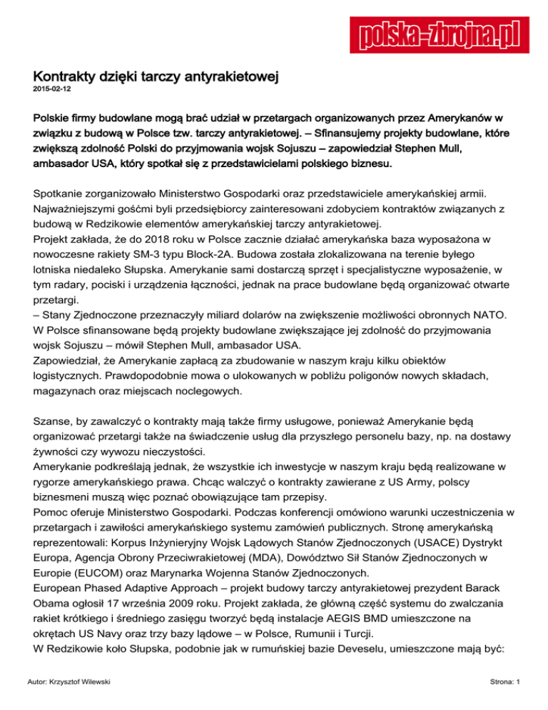 Kontrakty dzięki tarczy antyrakietowej 2015-02-12 Polskie firmy budowlane mogą brać udział w przetargach organizowanych przez Amerykanów w związku z budową w Polsce tzw. tarczy antyrakietowej. – Sfinansujemy projekty budowlane, które zwiększą zdolność Polski do przyjmowania wojsk Sojuszu – zapowiedział Stephen Mull, ambasador USA, który spotkał się z przedstawicielami polskiego biznesu. Spotkanie zorganizowało Ministerstwo Gospodarki oraz przedstawiciele amerykańskiej armii. Najważniejszymi gośćmi byli przedsiębiorcy zainteresowani zdobyciem kontraktów związanych z budową w Redzikowie elementów amerykańskiej tarczy antyrakietowej. Projekt zakłada, że do 2018 roku w Polsce zacznie działać amerykańska baza wyposażona w nowoczesne rakiety SM-3 typu Block-2A. Budowa została zlokalizowana na terenie byłego lotniska niedaleko Słupska. Amerykanie sami dostarczą sprzęt i specjalistyczne wyposażenie, w tym radary, pociski i urządzenia łączności, jednak na prace budowlane będą organizować otwarte przetargi. – Stany Zjednoczone przeznaczyły miliard dolarów na zwiększenie możliwości obronnych NATO. W Polsce sfinansowane będą projekty budowlane zwiększające jej zdolność do przyjmowania wojsk Sojuszu – mówił Stephen Mull, ambasador USA. Zapowiedział, że Amerykanie zapłacą za zbudowanie w naszym kraju kilku obiektów logistycznych. Prawdopodobnie mowa o ulokowanych w pobliżu poligonów nowych składach, magazynach oraz miejscach noclegowych. Szanse, by zawalczyć o kontrakty mają także firmy usługowe, ponieważ Amerykanie będą organizować przetargi także na świadczenie usług dla przyszłego personelu bazy, np. na dostawy żywności czy wywozu nieczystości. Amerykanie podkreślają jednak, że wszystkie ich inwestycje w naszym kraju będą realizowane w rygorze amerykańskiego prawa. Chcąc walczyć o kontrakty zawierane z US Army, polscy biznesmeni muszą więc poznać obowiązujące tam przepisy. Pomoc oferuje Ministerstwo Gospodarki. Podczas konferencji omówiono warunki uczestniczenia w przetargach i zawiłości amerykańskiego systemu zamówień publicznych. Stronę amerykańską reprezentowali: Korpus Inżynieryjny Wojsk Lądowych Stanów Zjednoczonych (USACE) Dystrykt Europa, Agencja Obrony Przeciwrakietowej (MDA), Dowództwo Sił Stanów Zjednoczonych w Europie (EUCOM) oraz Marynarka Wojenna Stanów Zjednoczonych. European Phased Adaptive Approach – projekt budowy tarczy antyrakietowej prezydent Barack Obama ogłosił 17 września 2009 roku. Projekt zakłada, że główną część systemu do zwalczania rakiet krótkiego i średniego zasięgu tworzyć będą instalacje AEGIS BMD umieszczone na okrętach US Navy oraz trzy bazy lądowe – w Polsce, Rumunii i Turcji. W Redzikowie koło Słupska, podobnie jak w rumuńskiej bazie Deveselu, umieszczone mają być: Autor: Krzysztof Wilewski Strona: 1 radar AN/SPY-1(D), radar kierowania ogniem Mk99 oraz kontenerowe wyrzutnie pocisków przeciwbalistycznych SM-3. Baza w Turcji będzie wyposażona jedynie w radary którymi opiekować się będzie kilkudziesięciu żołnierzy. W Polsce i w Rumunii stacjonować będzie po 200 amerykańskich wojskowych. Autor: Krzysztof Wilewski Strona: 2