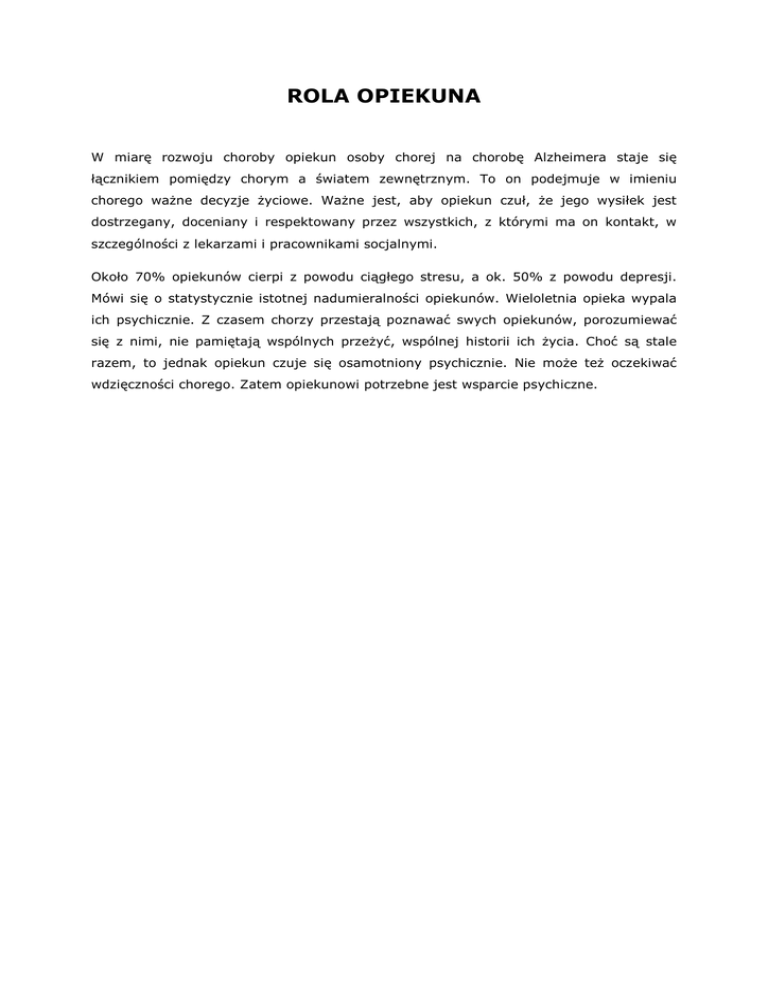 ROLA OPIEKUNA W miarę rozwoju choroby opiekun osoby chorej na chorobę Alzheimera staje się łącznikiem pomiędzy chorym a światem zewnętrznym. To on podejmuje w imieniu chorego waŜne decyzje Ŝyciowe. WaŜne jest, aby opiekun czuł, Ŝe jego wysiłek jest dostrzegany, doceniany i respektowany przez wszystkich, z którymi ma on kontakt, w szczególności z lekarzami i pracownikami socjalnymi. Około 70% opiekunów cierpi z powodu ciągłego stresu, a ok. 50% z powodu depresji. Mówi się o statystycznie istotnej nadumieralności opiekunów. Wieloletnia opieka wypala ich psychicznie. Z czasem chorzy przestają poznawać swych opiekunów, porozumiewać się z nimi, nie pamiętają wspólnych przeŜyć, wspólnej historii ich Ŝycia. Choć są stale razem, to jednak opiekun czuje się osamotniony psychicznie. Nie moŜe teŜ oczekiwać wdzięczności chorego. Zatem opiekunowi potrzebne jest wsparcie psychiczne.
