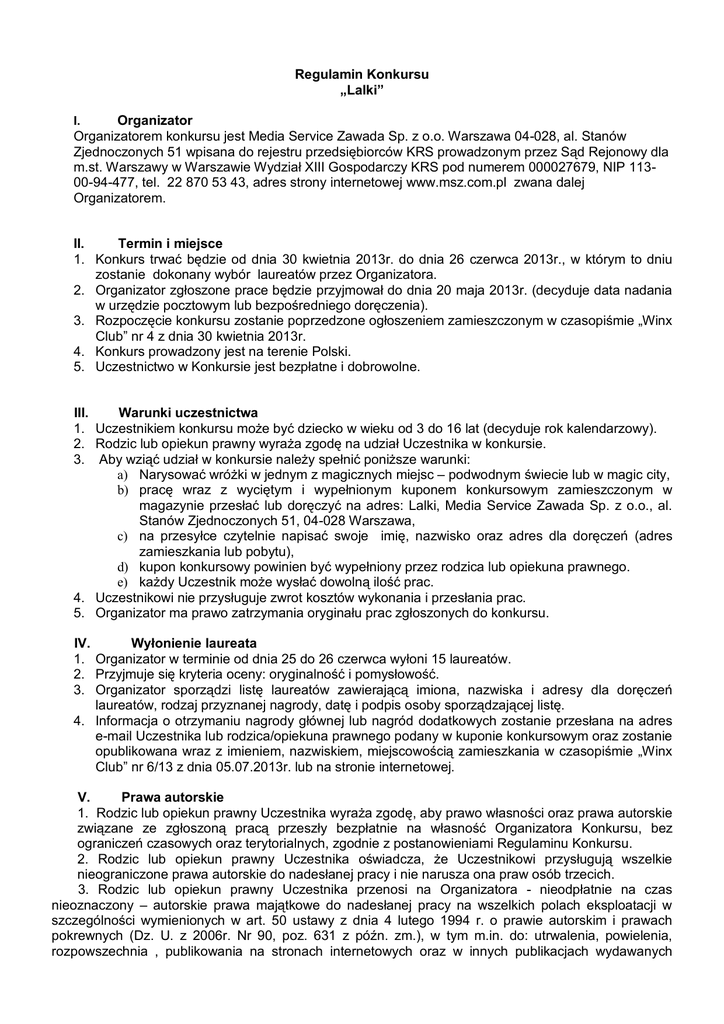 Regulamin Konkursu „Lalki” Organizator Organizatorem konkursu jest Media Service Zawada Sp. z o.o. Warszawa 04-028, al. Stanów Zjednoczonych 51 wpisana do rejestru przedsiębiorców KRS prowadzonym przez Sąd Rejonowy dla m.st. Warszawy w Warszawie Wydział XIII Gospodarczy KRS pod numerem 000027679, NIP 11300-94-477, tel. 22 870 53 43, adres strony internetowej www.msz.com.pl zwana dalej Organizatorem. I. II. Termin i miejsce 1. Konkurs trwać będzie od dnia 30 kwietnia 2013r. do dnia 26 czerwca 2013r., w którym to dniu zostanie dokonany wybór laureatów przez Organizatora. 2. Organizator zgłoszone prace będzie przyjmował do dnia 20 maja 2013r. (decyduje data nadania w urzędzie pocztowym lub bezpośredniego doręczenia). 3. Rozpoczęcie konkursu zostanie poprzedzone ogłoszeniem zamieszczonym w czasopiśmie „Winx Club” nr 4 z dnia 30 kwietnia 2013r. 4. Konkurs prowadzony jest na terenie Polski. 5. Uczestnictwo w Konkursie jest bezpłatne i dobrowolne. III. Warunki uczestnictwa 1. Uczestnikiem konkursu może być dziecko w wieku od 3 do 16 lat (decyduje rok kalendarzowy). 2. Rodzic lub opiekun prawny wyraża zgodę na udział Uczestnika w konkursie. 3. Aby wziąć udział w konkursie należy spełnić poniższe warunki: a) Narysować wróżki w jednym z magicznych miejsc – podwodnym świecie lub w magic city, b) pracę wraz z wyciętym i wypełnionym kuponem konkursowym zamieszczonym w magazynie przesłać lub doręczyć na adres: Lalki, Media Service Zawada Sp. z o.o., al. Stanów Zjednoczonych 51, 04-028 Warszawa, c) na przesyłce czytelnie napisać swoje imię, nazwisko oraz adres dla doręczeń (adres zamieszkania lub pobytu), d) kupon konkursowy powinien być wypełniony przez rodzica lub opiekuna prawnego. e) każdy Uczestnik może wysłać dowolną ilość prac. 4. Uczestnikowi nie przysługuje zwrot kosztów wykonania i przesłania prac. 5. Organizator ma prawo zatrzymania oryginału prac zgłoszonych do konkursu. IV. Wyłonienie laureata 1. Organizator w terminie od dnia 25 do 26 czerwca wyłoni 15 laureatów. 2. Przyjmuje się kryteria oceny: oryginalność i pomysłowość. 3. Organizator sporządzi listę laureatów zawierającą imiona, nazwiska i adresy dla doręczeń laureatów, rodzaj przyznanej nagrody, datę i podpis osoby sporządzającej listę. 4. Informacja o otrzymaniu nagrody głównej lub nagród dodatkowych zostanie przesłana na adres e-mail Uczestnika lub rodzica/opiekuna prawnego podany w kuponie konkursowym oraz zostanie opublikowana wraz z imieniem, nazwiskiem, miejscowością zamieszkania w czasopiśmie „Winx Club” nr 6/13 z dnia 05.07.2013r. lub na stronie internetowej. V. Prawa autorskie 1. Rodzic lub opiekun prawny Uczestnika wyraża zgodę, aby prawo własności oraz prawa autorskie związane ze zgłoszoną pracą przeszły bezpłatnie na własność Organizatora Konkursu, bez ograniczeń czasowych oraz terytorialnych, zgodnie z postanowieniami Regulaminu Konkursu. 2. Rodzic lub opiekun prawny Uczestnika oświadcza, że Uczestnikowi przysługują wszelkie nieograniczone prawa autorskie do nadesłanej pracy i nie narusza ona praw osób trzecich. 3. Rodzic lub opiekun prawny Uczestnika przenosi na Organizatora - nieodpłatnie na czas nieoznaczony – autorskie prawa majątkowe do nadesłanej pracy na wszelkich polach eksploatacji w szczególności wymienionych w art. 50 ustawy z dnia 4 lutego 1994 r. o prawie autorskim i prawach pokrewnych (Dz. U. z 2006r. Nr 90, poz. 631 z późn. zm.), w tym m.in. do: utrwalenia, powielenia, rozpowszechnia , publikowania na stronach internetowych oraz w innych publikacjach wydawanych przez Organizatora we wszystkich technikach znanych w dniu złożenia oświadczenia – uprawnienie to dotyczy wielokrotnego publikowania i nie jest ograniczone w czasie i co do terytorium. Przeniesienie praw autorskich następuje w dniu wyłonienia laureatów. VI. Nagrody 1. Laureaci konkursu otrzymają nagrody w postaci: a) 15 lalek Winx ufundowanych przez firmę COBI Polska Sp. z o.o. o wartości jednostkowej 50 zł brutto (40,65 zł netto + 0,23 zł podatek VAT). 2. Nagroda nie może zostać zamieniona na ekwiwalent pieniężny lub inną rzeczową. 3. Jeden Uczestnik może otrzymać tylko jedną nagrodę. 4. Laureat nie ponosi jakichkolwiek opłat z tytułu otrzymania nagrody, w tym kosztów doręczenia lub podatków. 5. Odbiór nagrody: nagroda zostanie przesłana pocztą – listem poleconym w terminie 6 tygodni od daty opublikowania listy laureatów w numerze 6/2013 z dnia 052.07.2013 na podany adres dla doręczeń. VII. Reklamacje 1. Każdemu Uczestnikowi przysługuje prawo wniesienia reklamacji związanej z niniejszym Konkursem w terminie do 15 dni roboczych po zakończeniu konkursu. 2. Reklamacje należy zgłaszać na adres Organizatora. 3. Zainteresowani, zostaną powiadomieni o rozpatrzeniu reklamacji w ciągu 14 dni od daty jej otrzymania. VIII. Przetwarzanie danych osobowych Uczestników Konkursu 1. Organizator, którego dane podane są na wstępie, oświadcza, że na podstawie art. 24 ust. 1 ustawy 2. 3. 4. 5. z dnia 29 sierpnia 1997 r. o ochronie danych osobowych (tj. z 2002 r. Nr 101, poz. 926 z późn. zm.) jest administratorem podanych przez Uczestnika danych osobowych. Uczestnik konkursu poda prawdziwe dane osobowe, tj.: imię, nazwisko, adres dla doręczeń, wiek, adres e-mail. Przekazane dane będą chronione zgodnie z ustawą z dnia 29 sierpnia 1997 r. o ochronie danych osobowych (tekst jedn. Dz. U. z 2002 r., Nr 101, poz. 926, z późn. zm.). Przetwarzanie danych, w tym ich zbieranie, przechowywanie jest dokonywane w celach związanych z realizacją Konkursu, w tym w celu jednorazowej publikacji danych Uczestnika (imienia, nazwiska, miejscowości zamieszkania, wieku, zdjęcia laureata oraz zdjęcia pracy konkursowej) w ogłoszeniu o laureatach konkursu oraz w celach marketingowych, przez Media Service Zawada sp. z o.o. al. Stanów Zjednoczonych 51, 04-028 Warszawa, w tym udostępnienia renomowa