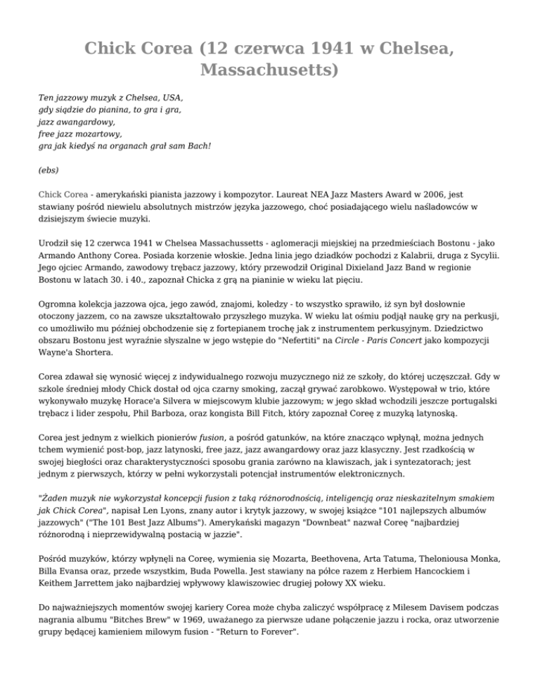 jak Chick Corea", napisał Len Lyons, znany autor i krytyk jazzowy, w swojej książce "101 najlepszych albumów