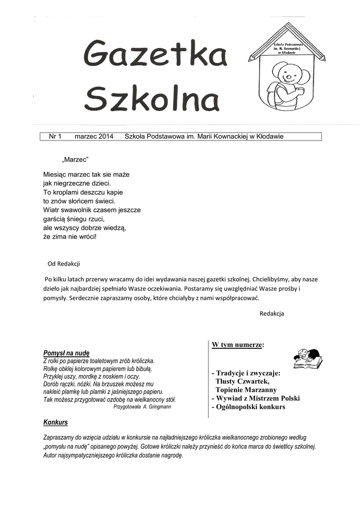 marzec 2014 Nr 1 Szkoła Podstawowa im. Marii Kownackiej w Kłodawie „Marzec” Miesiąc marzec tak sie maże jak niegrzeczne dzieci. To kroplami deszczu kapie to znów słońcem świeci. Wiatr swawolnik czasem jeszcze garścią śniegu rzuci, ale wszyscy dobrze wiedzą, że zima nie wróci! Od Redakcji Po kilku latach przerwy wracamy do idei wydawania naszej gazetki szkolnej. Chcielibyśmy, aby nasze dzieło jak najbardziej spełniało Wasze oczekiwania. Postaramy się uwzględniać Wasze prośby i pomysły. Serdecznie zapraszamy osoby, które chciałyby z nami współpracować. Redakcja W tym numerze: Pomysł na nudę Z rolki po papierze toaletowym zrób króliczka. Rolkę obklej kolorowym papierem lub bibułą. Przyklej uszy, mordkę z noskiem i oczy. Dorób rączki, nóżki. Na brzuszek możesz mu nakleić plamkę lub plamki z jaśniejszego papieru. Tak możesz przygotować ozdobę na wielkanocny stół. Przygotowała A. Gringmann - Tradycje i zwyczaje: Tłusty Czwartek, Topienie Marzanny - Wywiad z Mistrzem Polski - Ogólnopolski konkurs Konkurs Zapraszamy do wzięcia udziału w konkursie na najładniejszego króliczka wielkanocnego zrobionego według „pomysłu na nudę” opisanego powyżej. Gotowe króliczki należy przynieść do końca marca do świetlicy szkolnej. Autor najsympatyczniejszego króliczka dostanie nagrodę. Tradycje i zwyczaje „Powiedział nam Bartek, że dziś Tłusty Czwartek A Bartkowa uwierzyła, tłustych pączków nasmażyła” Istnieją w naszym kraju różne tradycje i zwyczaje, które są ciągle żywe i stale kultywowane. Jednym z takich zwyczajów jest Tłusty Czwartek, a nieodzownym jego akcentem są pączki. Dawniej Tłusty Czwartek był początkiem wielkiego Tłustego Tygodnia, czasu prawdziwego obżarstwa, jednocześnie ostatniego tygodnia karnawału. W kalendarzu chrześcijańskim dzień ten przypada w ostatni czwartek przed rozpoczęciem Wielkiego Postu. Jego data – w tym roku to 27 lutego - zależy zatem od daty Wielkanocy, która jest świętem ruchomym. Z czasem pojawiły się liczne przesądy, mówiące o tym, że każdy, kto nie zje choć jednego pączka w Tłusty Czwartek będzie miał pecha przez cały rok. Chyba jednak nie mamy się czego obawiać. Cukiernicy wyliczyli, że na jednego Polaka przypada średnio 2,5 pączka Oprócz pączków bardzo popularne tego dnia są faworki, zwane również w niektórych regionach chrustem lub chruścikami. Ciekawostką jest, iż dawniej objadano się pączkami nadziewanymi słoniną, boczkiem i mięsem. Nam jednak zdecydowanie bardziej smakują pączki ze słodkim nadzieniem. Osobom, które już nie mogą się doczekać kolejnego Tłustego Czwartku, podpowiadamy (za Wikipedią), iż kolejna okazja do „pączkowego obżarstwa” przypadnie za niecały rok – 12 lutego 2015! (red.) PRZEPIS NA PĄCZKI Składniki: 2 serki homogenizowane waniliowe (200g), 3 jajka, 1,5 szklanki mąki, 1 łyżeczka proszku do pieczenia. Wykonanie: Wszystkie składniki dokładnie wymieszać. Kłaść łyżką na rozgrzany, głęboki olej (lepiej poprosić o pomoc osobę dorosłą). (K. Caboń) Topienie Marzanny Marzanna to nazwa kukły, początkowo przedstawiającej boginię, którą w rytualny sposób palono bądź topiono, aby przywołać wiosnę. Kukłę wykonywano ze słomy, owijano białym płótnem, zdobiono wstążkami i koralami. Począwszy od XIX wieku zwyczaj ten stopniowo zmieniał się w zabawę, w której brały udział przede wszystkim dzieci i młodzież. Tradycja nakazywała, aby dziecięcy orszak z marzanną obszedł wszystkie domy we wsi. Po drodze podtapiano marzannę w każdej wodzie, jaka się nadarzyła. Wieczorem kukłę przejmowała młodzież, podpalała i płonącą wrzucała do wody. Obecnie w Polsce obrzęd łączony jest z nastaniem kalendarzowej wiosny 21 marca, kiedy to uczniowie topiąc Marzannę wrzucają wraz nią do wody szkolne niedole. (J. Caboń, na podstawie Wikipedii) Wywiady Rozmowa z Mistrzem Polski w Bowlingu * p. Ryszardem Korkowskim Od kiedy Pan trenuje? R. K.: Moja przygoda z bowlingiem zaczęła się kilka lat temu, jednak profesjonalnie trenuję od 3,5 roku. Jak dużo czasu przeznacza Pan na treningi? R. K.: Trenuję 3 razy w tygodniu po 2 godziny i zwykle uczestniczę dwa razy w miesiącu w turniejach, które trwają od 2 do 3 dni. Gdzie Pan trenuje? R. K.: Na kręgielni Tokyo Station w Łęgowie i na kręgielni MKBowling w Gdańsku. Pana szczególne osiągnięcia? R. K.: Jestem aktualnym mistrzem Polski seniorów oraz indywidualnym mistrzem województwa kujawsko-pomorskiego. Na co dzień reprezentuję barwy klubu TKB Toruń. Dlaczego nigdy nie widziałam Pana w telewizji? R. K.: Ponieważ sport ten jest w naszym kraju mało popularny. Jedyne transmisje na kanale Eurosport2 są z turniejów międzynarodowych. Dlaczego ten sport jest tak niepopularny? R. K.: W Polsce jest zdecydowanie za mało kręgielni, które spełniają kryteria dla profesjonalnych zawodników. A czy ta gra jest prosta / łatwa? R. K.: Gra jest stosunkowo łatwa, lecz gdy chce się osiągnąć wysoki poziom – niezbędna jest duża ilość treningów. Czym jest dla Pana bowling? R. K.: Bowling jak każda gra daje dużo pozytywnej adrenaliny, szczególnie gdy włączone są kamery, za mną stoi rzesza kibiców i muszę rzucić strika**. Emocje wtedy sięgają zenitu. Bowling jest też świetną zabawą, w którą grać może każdy i każdy może zostać mistrzem. Dziękujemy za rozmowę. * Bowling – najpopularniejsza odmiana gry w kręgle. ** strike – gdy zawodnik strąci wszystkie 10 kręgli w jednym rzucie (pierwszym z rundy) KONKURSY „Szczęśliwy dom, szczęśliwa rodzina” Przypominamy o trwającym corocznym konkursie plastycznym „Szczęśliwy dom, szczęśliwa rodzina”. Prace powinny być wykonane na papierze, brystolu lub kartonie, w odpowiednim formacie: - dla klas 0-3 jest to format A4 - dla klas 4-6 jest to format A3. Technika prac dowolna, powinna mieścić się w kategoriach