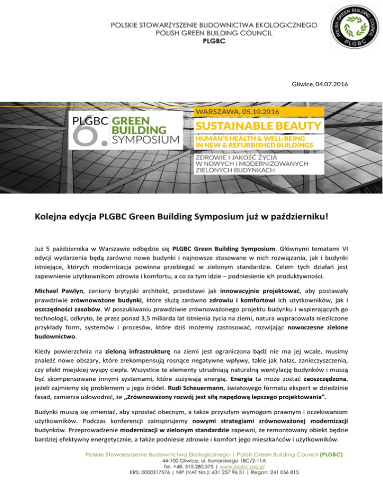POLSKIE STOWARZYSZENIE BUDOWNICTWA EKOLOGICZNEGO POLISH GREEN BUILDING COUNCIL PLGBC Gliwice, 04.07.2016 Kolejna edycja PLGBC Green Building Symposium już w październiku! Już 5 października w Warszawie odbędzie się PLGBC Green Building Symposium. Głównymi tematami VI edycji wydarzenia będą zarówno nowe budynki i najnowsze stosowane w nich rozwiązania, jak i budynki istniejące, których modernizacja powinna przebiegać w zielonym standardzie. Celem tych działań jest zapewnienie użytkownikom zdrowia i komfortu, a co za tym idzie – podniesienie ich produktywności. Michael Pawlyn, ceniony brytyjski architekt, przedstawi jak innowacyjnie projektować, aby postawały prawdziwie zrównoważone budynki, które służą zarówno zdrowiu i komfortowi ich użytkowników, jak i oszczędności zasobów. W poszukiwaniu prawdziwie zrównoważonego projektu budynku i wspierających go technologii, odkryto, że przez ponad 3,5 miliarda lat istnienia życia na ziemi, natura wypracowała niezliczone przykłady form, systemów i procesów, które dziś możemy zastosować, rozwijając nowoczesne zielone budownictwo. Kiedy powierzchnia na zieloną infrastrukturę na ziemi jest ograniczona bądź nie ma jej wcale, musimy znaleźć nowe obszary, które zrekompensują rosnące negatywne wpływy, takie jak hałas, zanieczyszczenia, czy efekt miejskiej wyspy ciepła. Wszystkie te elementy utrudniają naturalną wentylację budynków i muszą być skompensowane innymi systemami, które zużywają energię. Energia ta może zostać zaoszczędzona, jeżeli zajmiemy się problemem u jego źródeł. Rudi Scheuermann, światowego formatu ekspert w dziedzinie fasad, zamierza udowodnić, że „Zrównoważony rozwój jest siłą napędową lepszego projektowania”. Budynki muszą się zmieniać, aby sprostać obecnym, a także przyszłym wymogom prawnym i oczekiwaniom użytkowników. Podczas konferencji zainspirujemy nowymi strategiami zrównoważonej modernizacji budynków. Przeprowadzenie modernizacji w zielonym standardzie zapewni, że remontowany obiekt będzie bardziej efektywny energetycznie, a także podniesie zdrowie i komfort jego mieszkańców i użytkowników. Polskie Stowarzyszenie Budownictwa Ekologicznego | Polish Green Building Council (PLGBC) 44-100 Gliwice, ul. Konarskiego 18C/2-11A Tel. +48. 515.280.575 | www.plgbc.org.pl KRS: 0000317576 | NIP (VAT No.): 631 257 96 51 | Regon: 241 056 815 POLSKIE STOWARZYSZENIE BUDOWNICTWA EKOLOGICZNEGO POLISH GREEN BUILDING COUNCIL PLGBC Następnie zastanowimy się czy opłaca się certyfikować istniejący budynek? Na to pytanie odpowiedzą specjalnie zaproszeni z całego świata przedstawiciele największych obecnych w Polsce systemów certyfikacji wielokryterialnej: BREEAM, DGNB, HQE, LEED oraz Well Building Standard. Wreszcie podczas wspólnej debaty ustalimy jakie założenia realizować w nowych inwestycjach, aby budynek sprzyjał zdrowiu i komfortowi użytkownika, a jednocześnie zostały obniżone koszty eksploatacji. Na zakończenie zostanie rozstrzygnięty konkurs na najlepsze zielone budynki i projekty, które zostaną nagrodzone PLGBC Green Building Awards 2016! Po rozdaniu nagród przewidziana jest konferencja prasowa. Bądź krok przed innymi – to najszybsza droga do sukcesu. Nasza konferencja da Ci tę przewagę! oficjalna konferencja sygnowana przez światowych specjalistów z dziedziny zielonego budownictwa i instytucje wspierające ideę Green Building najświeższe informacje o światowych trendach najważniejsi polscy i światowi eksperci okazja do nieformalnych spotkań z partnerami biznesowymi najlepsze zielone budynki nagrodzone PLGBC Green Building Awards 2016 Dowiesz się: - Jak czerpać inspirację z natury, aby podnieść komfort i zdrowie użytkowników Jak zmniejszyć koszty certyfikacji istniejących obiektów Co jest siłą napędową lepszego projektowania Jak zmodernizować budynek w zielonym standardzie Jak oszczędność zasobów i kosztów może przyczynić się do wyższego komfortu w budynku Jak sprostać wyzwaniom w tworzeniu zrównoważonego środowiska wewnętrznego Jakie są aktualne trendy w zielonym budownictwie Jak zoptymalizować proces projektowania Fakty: Według najnowszego raportu World Green Building Trends 2016, globalny rynek zielonego budownictwa ulega podwojeniu co trzy lata W krajach rozwiniętych, przynajmniej połowa budynków, która będzie istniała w 2050 roku, została już wybudowana, z czego wynika jasna implikacja, że musimy koncentrować się zarówno na budowaniu nowych, jak i modernizacji istniejących budynków Obiekty nowe, jak i te modernizowane, muszą sprzyjać człowiekowi – wpływać pozytywnie na zdrowie, samopoczucie i produktywność, a to zapewnia zielone budownictwo Polskie Stowarzyszenie Budownictwa Ekologicznego | Polish Green Building Council (PLGBC) 44-100 Gliwice, ul. Konarskiego 18C/2-11A Tel. +48. 515.280.575 | www.plgbc.org.pl KRS: 0000317576 | NIP (VAT No.): 631 257 96 51 | Regon: 241 056 815 POLSKIE STOWARZYSZENIE BUDOWNICTWA EKOLOGICZNEGO POLISH GREEN BUILDING COUNCIL PLGBC PLGBC Green Building Symposium jest najważniejszym wydarzeniem skupiającym światowych ekspertów oraz wyznaczającym kierunek rozwoju zielonego budownictwa – serdecznie zapraszamy do udziału oraz aktywnego uczestnictwa! Kontakt: Magdalena Kałużyńska Koordynator ds. Marketingu M. +48 537.445.958 E. [email protected] www.plgbc.org.pl Polskie Stowarzyszenie Budownictwa Ekologicznego | Polish Green Building Council (PLGBC) 44-100 Gliwice, ul. Konarskiego 18C/2-11A Tel. +48. 515.280.575 | www.plgbc.org.pl KRS: 0000317576 | NIP (VAT No.): 631 257 96 51 | Regon: 241 056 815