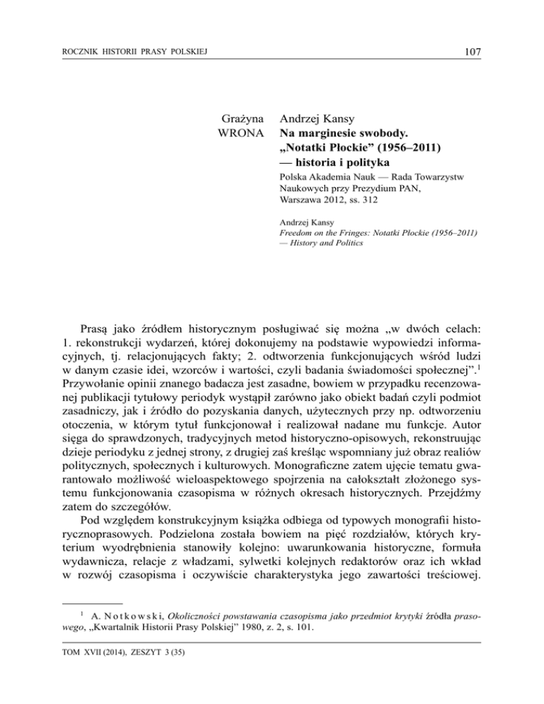 107 ROCZNIK HISTORII PRASY POLSKIEJ Grażyna WRONA Andrzej Kansy Na marginesie swobody. „Notatki Płockie” (1956–2011) — historia i polityka Polska Akademia Nauk — Rada Towarzystw Naukowych przy Prezydium PAN, Warszawa 2012, ss. 312 Andrzej Kansy Freedom on the Fringes: Notatki Płockie (1956–2011) — History and Politics Prasą jako źródłem historycznym posługiwać się można „w dwóch celach: 1. rekonstrukcji wydarzeń, której dokonujemy na podstawie wypowiedzi informacyjnych, tj. relacjonujących fakty; 2. odtworzenia funkcjonujących wśród ludzi w danym czasie idei, wzorców i wartości, czyli badania świadomości społecznej”.1 Przywołanie opinii znanego badacza jest zasadne, bowiem w przypadku recenzowanej publikacji tytułowy periodyk wystąpił zarówno jako obiekt badań czyli podmiot zasadniczy, jak i źródło do pozyskania danych, użytecznych przy np. odtworzeniu otoczenia, w którym tytuł funkcjonował i realizował nadane mu funkcje. Autor sięga do sprawdzonych, tradycyjnych metod historyczno-opisowych, rekonstruując dzieje periodyku z jednej strony, z drugiej zaś kreśląc wspomniany już obraz realiów politycznych, społecznych i kulturowych. Monograficzne zatem ujęcie tematu gwarantowało możliwość wieloaspektowego spojrzenia na całokształt złożonego systemu funkcjonowania czasopisma w różnych okresach historycznych. Przejdźmy zatem do szczegółów. Pod względem konstrukcyjnym książka odbiega od typowych monografii historycznoprasowych. Podzielona została bowiem na pięć rozdziałów, których kryterium wyodrębnienia stanowiły kolejno: uwarunkowania historyczne, formuła wydawnicza, relacje z władzami, sylwetki kolejnych redaktorów oraz ich wkład w rozwój czasopisma i oczywiście charakterystyka jego zawartości treściowej. 1 A. N o t k o w s k i, Okoliczności powstawania czasopisma jako przedmiot krytyki źródła prasowego, „Kwartalnik Historii Prasy Polskiej” 1980, z. 2, s. 101. TOM XVII (2014), ZESZYT 3 (35) 108 PRZEGLĄDY I RECENZJE Dla porządku dodam, że oprócz pierwszego wszystkie pozostałe rozdziały łączy wspólna wewnętrzna periodyzacja, niezależnie od omawianych w nich zagadnień. Wyodrębniono bowiem trzy podokresy: 1. 1956–1968; 2. 1968–1980; 3. 1981–2011. Nie jestem zwolenniczką takiej struktury, bowiem mimo pozornej przejrzystości do wielu faktów, zdarzeń Autor w poszczególnych fragmentach zmuszony jest wracać, niektóre powtarzać, inne powtórnie komentować. Uwaga ta dotyczy szczególnie kwestii związanych z kształtowaniem się formuły wydawniczej „Notatek Płockich”, cenzury, kolejnych inicjatyw redakcji czy też związków z lokalnymi instytucjami i organizacjami. Śledzenie zatem losów czasopisma jest nieco utrudnione, właśnie poprzez takie rozbicie narracji, skutkujące powielaniem pewnych ustaleń. Autor bardzo dba o szczegóły, wiele jednak z nich można było, bez szkody dla dalszego wywodu, pominąć. W tym miejscu chciałabym również odnieść się do przyjętych przez Autora cezur czasowych, o ile bowiem ta pierwsza nie budzi zastrzeżeń, o tyle uznanie 2011 roku za datę końcową, ze względu na pojawienie się wersji internetowej tytułowego periodyku — nie przekonuje. Można także spierać się, czy dla tak mocno związanego z miastem, regionem czasopisma, ważnymi cezurami nie są przypadkiem daty uzyskania i utraty statusu stolicy województwa? Publikację otwiera Wstęp, w którym Autor, w formie pytań szczegółowych określił nie tylko poszczególne etapy swojego postępowania badawczego, ale również wskazał na zakres i zasięg własnych poszukiwań naukowych. Sformułował je następująco: Kim byli przedstawiciele płockiej inteligencji, którzy zaangażowali się w utworzenie i rozwój czasopisma? Z jakich grup społecznych i zawodowych się wywodzili? W jakich okolicznościach doszło do powstania czasopisma „Notatki Płockie”? Jaka była jego formuła wydawnicza? Czy, a jeśli tak, to jakie relacje zachodziły między redakcją i wydawcą czasopisma a władzami państwowymi i partyjnymi? Czy zaznaczyły się w działalności czasopisma czasy przełomów politycznych w Polsce? (s. 9–10). Oczywiście Andrzeja Kansego interesowała także tematyka zamieszczanych w czasopiśmie materiałów i pytanie o integracyjną i kulturotwórczą rolę czasopisma na Mazowszu Płockim. Pytania szczegółowe skutkowały szukaniem odpowiedzi na postawione pytanie zasadnicze: „Jak «Notatki Płockie», jako regionalne czasopismo naukowe, funkcjonowały w ramach istniejącego państwa i w jakim zakresie swobody naukowej i kulturalnej się to odbywało?” (s. 11). Chciałabym wskazać na jeszcze jedną kwestię, która wydała mi się szczególnie interesująca: Autor patrzy na badany obiekt poprzez pełnione przezeń funkcje — z jednej strony, z drugiej zaś dzieje czasopisma splata z dziejami miasta. Bardzo mocno akcentuje ową perspektywę. Czytelnik zaś zachęcony perspektywą wieloaspektowego spojrzenia na analizowany temat zapewne chętnie szukać będzie w tekście odpowiedzi na wszystkie postawione przez Autora pytania. Dodam też, że mimo regionalności badanego ROCZNIK HISTORII PRASY POLSKIEJ Grażyna Wrona ANDRZEJ KANSY, NA MARGINESIE SWOBODY. „NOTATKI PŁOCKIE”… 109 obiektu, cechuje go jednak duży stopień reprezentatywności. Wiele bowiem elementów, tworzących ogólny kontekst historyczny, można ulokować w innej geograficznej przestrzeni. Oczywiście, w trakcie lektury może pojawić się zarzut adresowany do Autora, że miejscami zapomina o „Notatkach Płockich” na rzecz zdarzeń bardzo szczegółowych lub nie bezpośrednio z nimi związanych. Dla usprawiedliwienia należy dodać, że Autorowi chodziło zapewne o budowanie szerszego kontekstu. Dodam również, że zgromadzony przez Autora materiał badawczy pochodził nie tylko ze źródeł archiwalnych i publikowanych dokumentów, ale pozyskano go też z 22