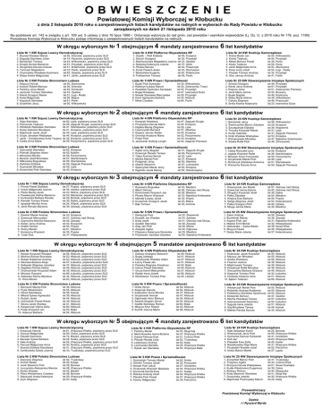 OBWIESZCZENIE Powiatowej Komisji Wyborczej w Kłobucku z dnia 2 listopada 2010 roku o zarejestrowanych listach kandydatów na radnych w wyborach do Rady Powiatu w Kłobucku zarządzonych na dzień 21 listopada 2010 roku Na podstawie art. 142 w związku z art. 109 ust. 5 ustawy z dnia 16 lipca 1998 r. Ordynacja wyborcza do rad gmin, rad powiatów i sejmików województw (t.j. Dz. U. z 2010 roku Nr 176, poz. 1190) Powiatowa Komisja Wyborcza w Kłobucku podaje informację o zarejestrowanych listach kandydatów na radnych. W okręgu wyborczym Nr 1 obejmującym 4 mandaty zarejestrowano 6 list kandydatów Lista Nr 1 KW Sojusz Lewicy Demokratycznej Lista Nr 4 KW Platforma Obywatelska RP Lista Nr 24 KW Koalicja Samorządowa 1. Drynda Wiesław Marian 2. Dygudaj Stanisław Julian 3. Bardziński Tomasz 4. Knopik Dorota Marianna 5. Strugińska Danuta Urszula 6. Tomczyk Magdalena 7. Chynowska Wiesława Kazimiera 8. Stopa Aniela Małgorzata 1. Gawlik – Well Elżbieta 2. Soluch Grzegorz 3. Macherzyńska Magdalena Joanna 4. Radecka Katarzyna Jolanta 5. Płuska Dariusz 6. Żurek Paweł Łukasz 7. Bardzińska Eugenia 8. Puttkammer Tomasz 1. Sroka Marek Jan 2. Kmieć Tadeusz 3. Miśtal Mariusz Paweł 4. Kluba Tadeusz 5. Janik Małgorzata Anna 6. Knop Jerzy Józef 7. Pisarek Tomasz Andrzej 8. Gloc Janusz Andrzej lat 50, Antonów, popierany przez SLD lat 74, Pacanów, popierany przez SLD lat 53, Wilkowiecko, popierany przez SLD lat 51, Przystajń, popierana przez SLD lat 51, Waleńczów, popierana przez SLD lat 33, Panki, popierana przez SLD lat 62, Opatów, popierana przez SLD lat 41, Janiki, popierana przez SLD lat 49, Krzepice lat 30, Przystajń lat 23, Opatów lat 37, Górki lat 42, Praszczyki lat 25, Złochowice lat 62, Waleńczów lat 48, Panki lat 50, Wilkowiecko lat 54, Przystajń lat 39, Panki lat 50, Panki lat 54, Złochowice lat 54, Ługi - Radły lat 32, Przystajń lat 41, Panki Lista Nr 2 KW Polskie Stronnictwo Ludowe Lista Nr 5 KW Prawo i Sprawiedliwość Lista Nr 25 KW Stowarzyszenie Inicjatyw Społecznych 1. Kiepura Henryk 2. Kubicki Robert Mariusz 3. Parkitny Jerzy Marek 4. Jeziorski Tomasz Stanisław 5. Kierat Grzegorz Marek 6. Kulej Małgorzata 7. Kapuścik Stanisław 8. Grzeliński Jerzy 1. Bujak Piotr Sylwester 2. Kiedrzyn Łukasz Marcin 3. Wystalski Kazimierz Szczepan 4. Bugaj Wiesława 5. Nowak Stanisław Mieczysław 6. Koch Agnieszka Barbara 7. Mirek Czesław 1. Sendal Grzegorz 2. Kierat Jerzy Andrzej 3. Kiepura Jerzy 4. Janik Maria Janina 5. Bujak Bogdan 6. Słaby Marta Aldona 7. Cebula Zbigniew 8. Sroka Ksenia Katarzyna lat 40, Złochowice lat 36, Antonów lat 49, Konieczki lat 43, Opatów lat 51, Ługi - Radły lat 26, Bagna lat 61, Panki lat 50, Wilkowiecko lat 34, Wilkowiecko lat 30, Zwierzyniec Trzeci lat 50, Przystajń lat 47, Iwanowice Duże lat 58, Przystajń lat 32, Kłobuck lat 64, Panki W okręgu wyborczym Nr 2 obejmującym 4 mandaty zarejestrowano lat 49, Przystajń lat 61, Przystajń lat 51, Zwierzyniec Pierwszy lat 55, Brzeziny lat 46, Kostrzyna lat 28, Wilkowiecko lat 46, Praszczyki lat 23, Iwanowice Duże 6 list kandydatów Lista Nr 1 KW Sojusz Lewicy Demokratycznej Lista Nr 4 KW Platforma Obywatelska RP Lista Nr 24 KW Koalicja Samorządowa 1. Sieja Stanisław 2. Wieczorek Tadeusz 3. Włodarek Radosław Stanisław 4. Kluba Gabriela Mirosława 5. Majchrzak Jacek Józef 6. Grzyb Jarosław Władysław 7. Janik – Kwiatkowska Anita Tacjana 8. Cieśla Anna Maria 1. Karasiak Wiesława 2. Przybylska Danuta Maria 3. Dądela Maciej Zbigniew 4. Leszczyński Bernard 5. Kopacz Janusz Stefan 6. Grondys Krystyna Maria 7. Potok Piotr 8. Jankowski Andrzej Longin 1. Bardziński Jerzy 2. Świerczyński Marcin Zdzisław 3. Szczepaniak Elżbieta 4. Troczka Krzysztof Marek 5. Kuder Gabriela 6. Drab Wiesław Władysław 7. Klimaszewski Mirosław 8. Sówka Rafał Piotr lat 62, Lipie, popierany przez SLD lat 56, Zajączki Drugie, popierany przez SLD lat 41, Stanisławów, popierany przez SLD lat 41, Krzepice, popierana przez SLD lat 45, Lipie, popierany przez SLD lat 44, Krzepice, popierany przez SLD lat 35, Krzepice, popierana przez SLD lat 59, Parzymiechy, popierana przez SLD lat 47, Zajączki Drugie lat 44, Krzepice lat 26, Lipie lat 37, Albertów lat 45, Krzepice lat 52, Parzymiechy lat 30, Krzepice lat 44, Zajączki Pierwsze lat 58, Wilkowiecko lat 29, Krzepice lat 39, Wapiennik lat 41, Lipie lat 37, Zajączki Pierwsze lat 53, Krzepice lat 47, Rębielice Szlacheckie lat 46, Zimnowoda Lista Nr 2 KW Polskie Stronnictwo Ludowe Lista Nr 5 KW Prawo i Sprawiedliwość 1. Garncarek Stanisław 2. Pilśniak Zbigniew Adam 3. Mirowska Monika 4. Borecki Józef Bronisław 5. Miłkowska Bogusława 6. Zielińska Elżbieta 7. Szymanek Mirosław 8. Krzemiński Piotr Stanisław Lista Nr 25 KW Stowarzyszenie Inicjatyw Społecznych 1. Sądel Jerzy Bogdan 2. Krawczyk Renata Teresa 3. Tołpa Andrzej Henryk 4. Mońka Maciej Piotr 5. Podgórski Jerzy 6. Olejnik Sławomir 7. Spaczyński Marek Jerzy 8. Kępiński Jacek Maciej 1. Cieśla Romuald Leon 2. Jagieła Wojciech Rafał 3. Mrowiec Anna Franciszka 4. Grzybowski Marek Piotr 5. Dziubczyk Zdzisława Antonina 6. Warzycha Danuta Anna lat 62, Krzepice lat 55, Natolin lat 58, Parzymiechy lat 57, Starokrzepice lat 58, Stanisławów lat 59, Zajączki Pierwsze lat 48, Lipie lat 40, Krzepice lat 51, Zajączki Drugie lat 49, Parzymiechy lat 52, Lipie lat 37, Krzepice lat 50, Albertów lat 47, Lutrowskie lat 55, Krzepice lat 56, Starokrzepice W okręgu wyborczym Nr 3 obejmującym 4 mandaty zarejestrowano lat 58, Krzepice lat 38, Starokrzepice lat 56, Parzymiechy lat 48, Lipie lat 51, Stanisławów lat 50, Zajączki Pierwsze 6 list kandydatów Lista Nr 1 KW Sojusz Lewicy Demokratycznej Lista Nr 4 KW Platforma Obywatelska RP Lista Nr 24 KW Koalicja Samorządowa 1. Prorok Paweł Zdzisław 2. Grzyb Małgorzata Joanna 3. Płaza Maciej Jacek 4. Pawełoszek Halina Marianna 5. Kurkowska Barbara Renata 6. Randak Tomasz Paweł 7. Ignasiak Monika Anna 8. Janik Renata Marzena 1