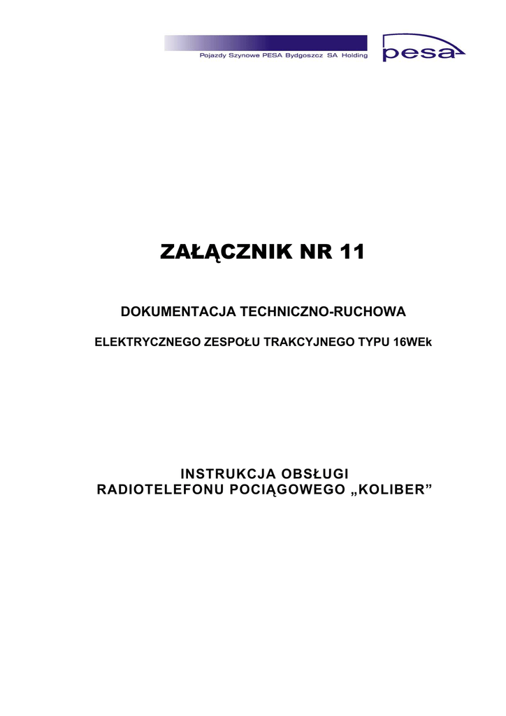 ZAŁĄCZNIK NR 11 DOKUMENTACJA TECHNICZNO-RUCHOWA ELEKTRYCZNEGO ZESPOŁU TRAKCYJNEGO TYPU 16WEk INSTRUKCJA OBSŁUGI RADIOTELEFONU POCIĄGOWEGO „KOLIBER” Instrukcja obsługi radiotelefonu pociągowego „Koliber” SPIS TREŚCI 1 WSTĘP – OPIS OGÓLNY.........................................................................................................................3 2 BUDOWA RADIOTELEFONU „KOLIBER” – ELEMENTY SKŁADOWE ...............................................3 3 SCHEMAT PODŁĄCZENIA RADIOTELEFONU „KOLIBER” DO INSTALACJI POJAZDU..................4 4 OPIS ELEMENTÓW MANIPULACYJNYCH URZĄDZENIA ....................................................................5 4.1 4.2 4.3 5 OPIS MANIPULATORA ...........................................................................................................................5 OPIS MODUŁU NADAWCZO ODBIORCZEGO .............................................................................................6 OPIS ZASILACZA ..................................................................................................................................7 OPIS FUNKCJONALNY RADIOTELEFONU „KOLIBER” ......................................................................8 5.1 ZNACZENIE SYMBOLI I ZNAKÓW .............................................................................................................8 5.1.1 Górne pole ekranu ........................................................................................................................8 5.1.2 Centralne pole ekranu ..................................................................................................................9 5.1.3 Dolne pole ekranu.........................................................................................................................9 5.2 WŁĄCZENIE RADIOTELEFONU DO PRACY ...............................................................................................9 5.3 UŻYTKOWANIE RADIOTELEFONU .........................................................................................................10 5.3.1 Nadawanie ..................................................................................................................................10 5.3.2 Odbiór .........................................................................................................................................10 5.4 OBSŁUGA POZOSTAŁYCH FUNKCJI RADIOTELEFONU .............................................................................11 5.4.1 Nasłuch .......................................................................................................................................11 5.4.2 Szum...........................................................................................................................................11 5.4.3 Funkcje menu .............................................................................................................................11 5.4.4 Zmiana kanałów..........................................................................................................................12 5.4.5 Ustawienie parametrów pracy ....................................................................................................12 5.4.5.1 5.4.5.2 5.5 5.6 Wyświetlacza/Zegara/Daty/Głośności ..............................................................................................12 Nadawanie i odbieranie telegramów ................................................................................................13 TESTOWANIE SYGNAŁU RADIO-STOP...............................................................................................13 SERWIS.............................................................................................................................................13 6 WYSYŁANIE ALARMU...........................................................................................................................13 7 WYŁĄCZANIE RADIOTELEFONU.........................................................................................................14 8 OBSŁUGA REJESTRATORA ................................................................................................................14 DTR 16WEk strona 2 Instrukcja obsługi radiotelefonu pociągowego „Koliber” 1 Wstęp – opis ogólny Radiotelefon pociągowy „Koliber” jest urządzeniem nowoczesnym, specjalnie zaprojektowanym dla potrzeb PKP, służącym do komunikacji radiowej w sieci pociągowej funkcjonującej w Polskich Kolejach Państwowych. „Koliber” może pracować jako zestaw przewoźny w kabinach lokomotyw wszystkich typów i innych pojazdach szynowych użytkowanych przez PKP, oraz jako zestaw stacjonarny - stacja bazowa na stanowiskach dyspozytorskich. Urządzenie zapewnia połączenia radiotelefoniczne w ramach funkcjonującej na PKP radiotelefonicznej sieci pociągowej pracującej w paśmie VHF (136 - 174 MHz) realizując następujące relacje łączności: − − − − 2 Pojazd ruchomy – stacja bazowa, Stacja bazowa – pojazd ruchomy, Pojazd ruchomy – pojazd ruchomy, Stacja noszona – pojazd ruchomy. Budowa radiotelefonu „koliber” – elementy składowe Prezentowane urządzenie składa się z następujących modułów funkcjonalnych: − − − Moduł manipulatora, Moduł radiowy z zespołem N/O, Moduł zasilacza. Rys.1 Kompletny zestaw urządzeń wchodzących w skład radiotelefonu DTR 16WEk strona 3 Instrukcja obsługi radiotelefonu pociągowego „Koliber” 3 Schemat podłączenia radiotelefonu „koliber” do instalacji pojazdu Manipulator KM-01 Antena VHF Moduł KPG-1 Moduł terminala KT-01 Moduł zasilacza KZ-01 Zasilanie pojazdu DTR 16WEk strona 4 Instrukcja obsługi radiotelefonu pociągowego „Koliber” 4 Opis elementów manipulacyjnych urządzenia 4.1 Opis manipulatora Rys.2 Panel czołowy manipulatora (1) (2) (2a) (2b) (3) (4) (4a) (4b) (4c) (5) Klawisz alarmu Klawiatura funkcyjna Klawi