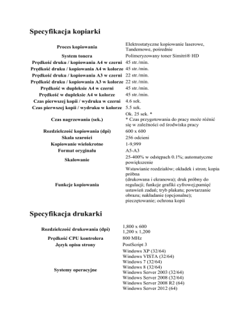 Specyfikacja kopiarki Specyfikacja drukarki