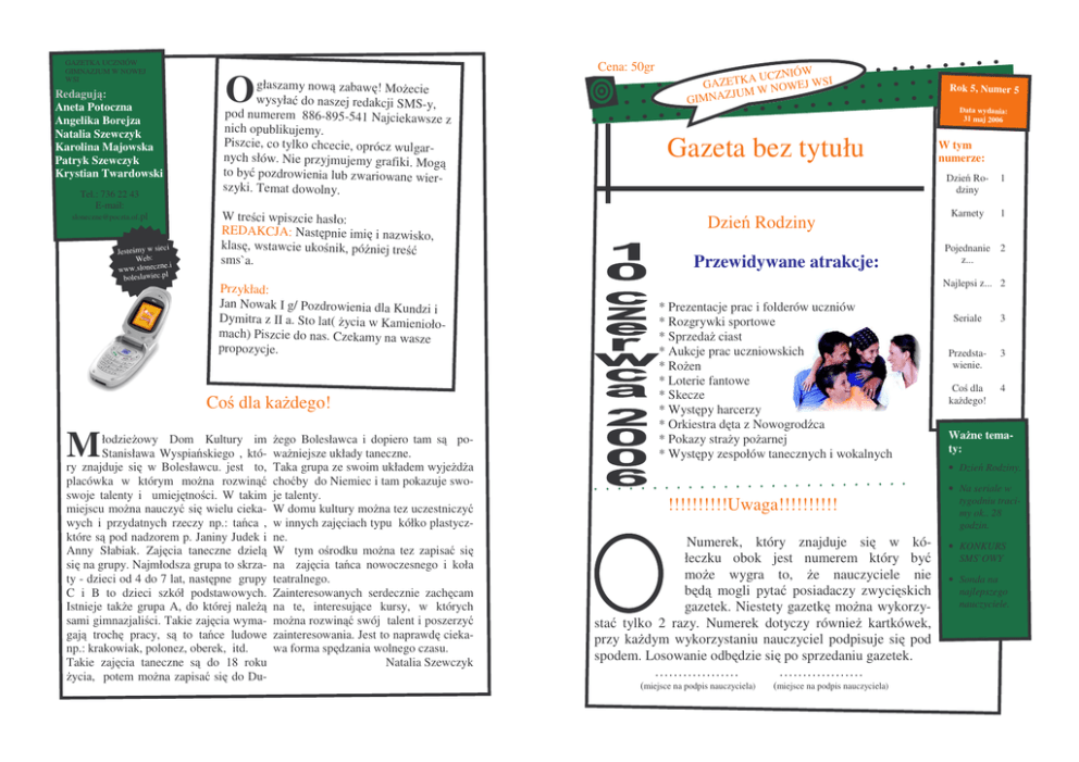 GAZETKA UCZNIÓW GIMNAZJUM W NOWEJ WSI Redaguj : Aneta Potoczna Angelika Borejza Natalia Szewczyk Karolina Majowska Patryk Szewczyk Krystian Twardowski Tel.: 736 22 43 E-mail: [email protected] ci Jeste my w sie Web: ne.i www.slonecz boleslawiec.pl Cena: 50gr O głaszamy now zabaw ! Mo ecie wysyła do naszej redakcji SMS-y, pod numerem 886-895-541 Najciekawsze z nich opublikujemy. Piszcie, co tylko chcecie, oprócz wulgarnych słów. Nie przyjmujemy grafiki. Mog to by pozdrowienia lub zwariowane wierszyki. Temat dowolny. W tre ci wpiszcie hasło: REDAKCJA: Nast pnie imi i nazwisko, klas , wstawcie uko nik, pó niej tre sms`a. Przykład: Jan Nowak I g/ Pozdrowienia dla Kundzi i Dymitra z II a. Sto lat( ycia w Kamieniołomach) Piszcie do nas. Czekamy na wasze propozycje. Co dla ka dego! M łodzie owy Dom Kultury im Stanisława Wyspia skiego , który znajduje si w Bolesławcu. jest to, placówka w którym mo na rozwin swoje talenty i umiej tno ci. W takim miejscu mo na nauczy si wielu ciekawych i przydatnych rzeczy np.: ta ca , które s pod nadzorem p. Janiny Judek i Anny Słabiak. Zaj cia taneczne dziel si na grupy. Najmłodsza grupa to skrzaty - dzieci od 4 do 7 lat, nast pne grupy C i B to dzieci szkół podstawowych. Istnieje tak e grupa A, do której nale sami gimnazjali ci. Takie zaj cia wymagaj troch pracy, s to ta ce ludowe np.: krakowiak, polonez, oberek, itd. Takie zaj cia taneczne s do 18 roku ycia, potem mo na zapisa si do Du- ego Bolesławca i dopiero tam s powa niejsze układy taneczne. Taka grupa ze swoim układem wyje d a cho by do Niemiec i tam pokazuje swoje talenty. W domu kultury mo na tez uczestniczy w innych zaj ciach typu kółko plastyczne. W tym o rodku mo na tez zapisa si na zaj cia ta ca nowoczesnego i koła teatralnego. Zainteresowanych serdecznie zach cam na te, interesuj ce kursy, w których mo na rozwin swój talent i poszerzy zainteresowania. Jest to naprawd ciekawa forma sp dzania wolnego czasu. Natalia Szewczyk W A UCZNIÓ GAZETK W NOWEJ WSI JUM GIMNAZ Gazeta bez tytułu Dzie Rodziny Przewidywane atrakcje: Rok 5, Numer 5 Data wydania: 31 maj 2006 W tym numerze: Dzie Rodziny 1 Karnety 1 Pojednanie 2 z... Najlepsi z... 2 * Prezentacje prac i folderów uczniów * Rozgrywki sportowe * Sprzeda ciast * Aukcje prac uczniowskich * Ro en * Loterie fantowe * Skecze * Wyst py harcerzy * Orkiestra d ta z Nowogrod ca * Pokazy stra y po arnej * Wyst py zespołów tanecznych i wokalnych !!!!!!!!!!Uwaga!!!!!!!!!! Numerek, który znajduje si w kółeczku obok jest numerem który by mo e wygra to, e nauczyciele nie b d mogli pyta posiadaczy zwyci skich gazetek. Niestety gazetk mo na wykorzysta tylko 2 razy. Numerek dotyczy równie kartkówek, przy ka dym wykorzystaniu nauczyciel podpisuje si pod spodem. Losowanie odb dzie si po sprzedaniu gazetek. ……………… ……………… (miejsce na podpis nauczyciela) (miejsce na podpis nauczyciela) Seriale 3 Przedstawienie. 3 Co dla ka dego! 4 Wa ne tematy: • Dzie Rodziny. • Na seriale w tygodniu tracimy ok.. 28 godzin. • KONKURS SMS`OWY • Sonda na najlepszego nauczyciele. Pojednanie z natur . J ak my licie, w jaki sposób najlepiej zaprzyja ni si z Natur ? My ju wiemy - 8 maja wybrali my si na w drówk w kierunku murowanej wie y. Ka da klasa otrzymała mapy, na których zaznaczona była trasa wyprawy oraz krótkofalówki przez które klasy mogły si porozumiewa . W terenie były równie strzałki, które te pokazywały nam odpowiedni szlak, wyznaczony przez nauczyciela geografii (i tak nie były mam tak bardzo przydatne gdy my umiemy posługiwa si map ). Po drodze czekały na nas niespodzianki. Były to zadania, które musieli my wykona , np. odnalezienie i rozpoznanie ró nych gatunków ro lin oraz pytania do tekstu. Na miejscu czekała na nas mała przek ska. Wszyscy miło sp dzili czas przy ognisku. Seriale Po 2 godzinach pod Ka da klasa wie zacz li my otrzymała mapy, si powoli zbiena których ra i i przez zaznaczona była las do szkoły. trasa wyprawy Jeszcze przed oraz krótkofalówki tym opiekuno- przez które klasy mogły si wie poszczególporozumiewa . nych grup sprawdzili obecno i wyruszyli my w kierunku Nowej Wsi. Po przybyciu na plac szkolny czekał ju na nas autobus i wszyscy wrócili my do swoich domów. Ten dzie był bardzo udany, pełen przygód i niespodzianek. Cho uczucie zm czenia dało si we znaki to na pewno ka dy z nas b dzie wspominał go bardzo miło. Aneta Potoczna Angelika Borejza M jak miło , Pierwsza miło , Na dobre i na złe, Rodzina zast pcza plus, Pensjonat pod ró , Kochaj mnie kochaj, Samo ycie, Moda na sukces, Kochaj mnie, Kamienie mierci, Zagubieni, Dom nie do poznania, Du e dzieci, Plebania, Klan, U fryzjera, Warto kocha , Alf, Miodowe lata, Daleko od noszy, Lokatorzy, S siedzi, Jaka to melodia, Show time, wi ta wojna, Egzamin z ycia, Załó si , Chirurdzy, VIP, Graczykowie, Gra w ciemno, Grasz czy nie grasz, Na wspólnej, Psie serce, wiat według Kiepskich, Fala zbrodni. Poznajecie? Tak, to te filmy, przed którymi sp dzamy tyle czasu. Policzmy... Na jeden film tracimy co najmniej godzin . Załó my si e dziennie ogl damy cztery takie filmy, wi c w całym tygodniu tracimy przynajmniej 28 godzin. Najlepsi z najlepszych Przedstawienie N asze grono pedagogiczne jest bardzo liczne. Składa si z 13 nauczycieli. Zastanawiali cie si kiedy , za którym nauczycielem przepadacie najbardziej i z którym macie najlepszy kontakt? Jak my lisz, która osoba z kadry pedagogicznej cieszy si najwi ksz popularno ci w naszej szkole? Postanowiłam przeprowadzi sond na najbardziej lubianego nauczyciela w szkole. O to wyniki: I. P. Anna Zał ska i P. Piotr Napiórkowski II. P. Krzysztof Talar III. ks. Remigiusz Tobera Cała społeczno szkolna najwi ksz sympati darzy pani Ani i pana Piotra. Serdecznie gratuluj ! Aneta Potoczna Str. 2 Matematyka, j zyk polski, j zyk angielski/ niemiecki, fizyka, biologia, geografia, chemia, historia, technika, muzyka, Na jeden film tracimy co plastyka, WOS, najmniej god