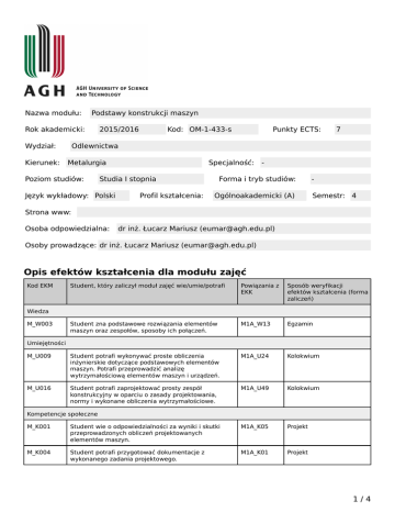 Nazwa modułu: Podstawy konstrukcji maszyn Rok akademicki: Wydział: Kierunek: 2015/2016 Kod: OM-1-433-s Punkty ECTS: 7 Odlewnictwa Metalurgia Poziom studiów: Specjalność: Studia I stopnia Język wykładowy: Polski Profil kształcenia: - Forma i tryb studiów: Ogólnoakademicki (A) Semestr: 4 Strona www: Osoba odpowiedzialna: dr inż. Łucarz Mariusz ([email protected]) Osoby prowadzące: dr inż. Łucarz Mariusz ([email protected]) Opis efektów kształcenia dla modułu zajęć Kod EKM Student, który zaliczył moduł zajęć wie/umie/potrafi Powiązania z EKK Sposób weryfikacji efektów kształcenia (forma zaliczeń) Student zna podstawowe rozwiązania elementów maszyn oraz zespołów, sposoby ich połączeń. M1A_W13 Egzamin M_U009 Student potrafi wykonywać proste obliczenia inżynierskie dotyczące podstawowych elementów maszyn. Potrafi przeprowadzić analizę wytrzymałościową elementów maszyn i urządzeń. M1A_U24 Kolokwium M_U016 Student potrafi zaprojektować prosty zespół konstrukcyjny w oparciu o zasady projektowania, normy i wykonane obliczenia wytrzymałościowe. M1A_U49 Kolokwium Wiedza M_W003 Umiejętności Kompetencje społeczne M_K001 Student wie o odpowiedzialności za wyniki i skutki przeprowadzonych obliczeń projektowanych elementów maszyn. M1A_K05 Projekt M_K004 Student potrafi przygotować dokumentacje z wykonanego zadania projektowego. M1A_K01 Projekt 1/4 Karta modułu - Podstawy konstrukcji maszyn Matryca efektów kształcenia w odniesieniu do form zajęć Konwersatori um Zajęcia seminaryjne Zajęcia praktyczne Zajęcia terenowe Zajęcia warsztatowe + - - - - - - - - - - M_U009 Student potrafi wykonywać proste obliczenia inżynierskie dotyczące podstawowych elementów maszyn. Potrafi przeprowadzić analizę wytrzymałościową elementów maszyn i urządzeń. - + - - - - - - - - - M_U016 Student potrafi zaprojektować prosty zespół konstrukcyjny w oparciu o zasady projektowania, normy i wykonane obliczenia wytrzymałościowe. - + - + - - - - - - - E-learning Ćwiczenia projektowe Student zna podstawowe rozwiązania elementów maszyn oraz zespołów, sposoby ich połączeń. Inne Ćwiczenia laboratoryjne Forma zajęć Ćwiczenia audytoryjne Student, który zaliczył moduł zajęć wie/umie/potrafi Wykład Kod EKM Wiedza M_W003 Umiejętności Kompetencje społeczne M_K001 Student wie o odpowiedzialności za wyniki i skutki przeprowadzonych obliczeń projektowanych elementów maszyn. - + - + - - - - - - - M_K004 Student potrafi przygotować dokumentacje z wykonanego zadania projektowego. - - - + - - - - - - - Treść modułu zajęć (program wykładów i pozostałych zajęć) Wykład Wiadomości wprowadzające. Wymagania stawiane częściom maszyn. Warunek odporności na obciążenia. Współczynnik bezpieczeństwa i naprężenia dopuszczalne. Wytrzymałość zmęczeniowa. Tworzywa i materiały konstrukcyjne. Dokładność wymiarowa i kształtowa części maszyn. Zasady konstruowania części maszyn stosowanych w połączeniach nierozłącznych (nitowych, spawanych, zgrzewanych, lutowanych), w połączeniach spoczynkowych rozłącznych (śrubowych, kołkowych, klinowych, wpustowych), w połączeniach ruchowych (śrubowych, sworzniowych, wielowypustowych oraz sprężystych). Zasady konstruowania i doboru części maszyn stosowanych w łożyskowaniach (czopów łożyskowych, panwi oraz łożysk tocznych). Metody i rozwiązania konstrukcyjne smarowania łożysk i innych węzłów tarcia. Zasady konstruowania i doboru części maszyn w napędach (osi i wałów). Omówienie 2/4 Karta modułu - Podstawy konstrukcji maszyn rozwiązań konstrukcyjnych przekładni mechanicznych, sprzęgieł i hamulców. Konstruowanie optymalizujące. Ćwiczenia audytoryjne Obliczenia wytrzymałościowe podstawowych elementów maszyn oraz połączeń. Zadania w zakresie projektowania maszyn w oparciu o normy i zalecenia konstrukcyjne. Ćwiczenia projektowe Sukcesywne rozwiązywanie indywidualnych zadań konstrukcyjnych z uwzględnieniem kryterium odporności na obciążenia, w obszarze połączeń spawanych, śrubowych, kształtowania osi i wałów, a także doboru łożysk. Sprawdzanie postępów i umiejętności studentów przez wykonanie samodzielnych projektów semestralnych. Sposób obliczania oceny końcowej Ocena końcowa OC z modułu wystawiana jest jako średnia ważona z uzyskanych wyników z ćwiczeń audytoryjnych ĆA 40%, projektowych P 20% oraz oceny z egzaminu E 40%. OC=0,4• ĆA+0,2• P+0,4• E Wymagania wstępne i dodatkowe Nie podano wymagań wstępnych lub dodatkowych. Zalecana literatura i pomoce naukowe 1. Osiński Z., Bajon W., Szucki T.: Podstawy konstrukcji maszyn. Państwowe Wydawnictwo Naukowe, Warszawa 1986. 2. Rutkowski A.: Części Maszyn. Wydawnictwo Szkolne i Pedagogiczne. Warszawa 1986. 3. Dąbrowski Z.: Wały maszynowe. Wydawnictwo Naukowe PWN. Warszawa 1999. 4. Porębska M., Skorupa A.: Połączenia spójnościowe. Wydawnictwo Naukowe PWN. Warszawa 1997. 5. Osiński Z.: Sprzęgła i hamulce. Wydawnictwo Naukowe PWN. Warszawa 2000. Uzupełniające: 1. Okraszewski K.: Ćwiczenia konstrukcyjne. Wydawnictwo Szkolne i Pedagogiczne. Warszawa 1999. 2. Kurmaz L.W., Karmaz O.L.: Projektowanie węzłów i części maszyn. Wydawnictwo Politechniki Świętokrzyskiej. Kielce 2006. 3. Garncarz G., Arkusik S.: Pomoce projektowe w budowie maszyn. Wydawnictwo Politechniki Śląskiej, Gliwice 1998. 4. Polskie Normy. Publikacje naukowe osób prowadzących zajęcia związane z tematyką modułu Nie podano dodatkowych publikacji Informacje dodatkowe Brak 3/4 Karta modułu - Podstawy konstrukcji maszyn Nakład pracy studenta (bilans punktów ECTS) Forma aktywności studenta Obciążenie studenta Udział w wykładach 42 godz Samodzielne studiowanie tematyki zajęć 55 godz Egzamin lub kolokwium zaliczeniowe 5 godz Udział w ćwiczeniach audytoryjnych 14 godz Przygotowanie do zajęć 15 godz Udział w ćwiczeniach projektowych 28 godz Wykonanie projektu 20 godz Do