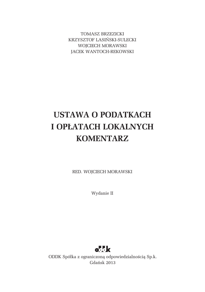 TOMASZ BRZEZICKI KRZYSZTOF LASIŃSKI-SULECKI WOJCIECH MORAWSKI JACEK WANTOCH-REKOWSKI USTAWA O PODATKACH I OPŁATACH LOKALNYCH KOMENTARZ RED. WOJCIECH MORAWSKI Wydanie II ODDK Spółka z ograniczoną odpowiedzialnością Sp.k. Gdańsk 2013 © Copyright by ODDK Spółka z ograniczoną odpowiedzialnością Sp.k. Gdańsk 2013 Projekt okładki: Artur Zdulski Korekta: Ewa Kapkowska-Niemczyk Skład: Agnieszka Pietrusa Recenzja: prof. dr hab. Bogumił Brzeziński Kopiowanie na dowolnych nośnikach, przedruk, rozpowszechnianie całości lub fragmentów bez pisemnej zgody Wydawcy – ODDK Spółka z ograniczoną odpowiedzialnością Sp.k. – jest zabronione i zagrożone karą pozbawienia wolności do lat 5. ISBN 978-83-7804-121-4 Wydawca: ODDK Spółka z ograniczoną odpowiedzialnością Spółka komandytowa (dawniej: Ośrodek Doradztwa i Doskonalenia Kadr Sp. z o.o.) 80-317 Gdańsk Oliwa, ul. Obrońców Westerplatte 32A www.oddk.pl; e-mail: [email protected]; tel./faks 58 554 29 17 Spis treści Od autorów . . . . . . . . . . . . . . . . . . . . . . . . . . . . . . . . . . . . . . . . . . . . . . . . . . . . . . . 13 ROZDZIAŁ 1 Przepisy ogólne Art. 1 [przedmiot regulacji] . . . . . . . . . . . . . . . . . . . . . . . . . . . . . . . . . . 15 Krzysztof Lasiński-Sulecki I. Zakres przedmiotowy regulacji . . . . . . . . . . . . . . . . . . . . . . . . . . . . . . . . 15 II. Nowelizacje art. 1 . . . . . . . . . . . . . . . . . . . . . . . . . . . . . . . . . . . . . . . . . . 16 Art. 1a. [definicje legalne]. . . . . . . . . . . . . . . . . . . . . . . . . . . . . . . . . . . 17 Wojciech Morawski I. Wprowadzenie . . . . . . . . . . . . . . . . . . . . . . . . . . . . . . . . . . . . . . . . . . . . 19 II. Pojęcia budynku i budowli przed 1 stycznia 2003 r. . . . . . . . . . . . . . . . 21 III. Pojęcia budynku i budowli po 1 stycznia 2003 r. – kwestia odwołania się do „przepisów prawa budowlanego” . . . . . . . . . . . . . . . . 23 IV. Pojęcie budynku po 1 stycznia 2003 r. – wprowadzenie. . . . . . . . . . . . . 34 V. Trwałość związku obiektu z gruntem . . . . . . . . . . . . . . . . . . . . . . . . . . . 35 VI. Fundamenty, przegrody budowlane i dach jako elementy konstytuujące budynek . . . . . . . . . . . . . . . . . . . . . . . . . . . . . . . . . . . . . . 47 VII. Problem kompletności definicji budynku – „reklasyfikacja” budynków na budowle w świetle orzecznictwa NSA . . . . . . . . . . . . . . . . . . . . . . . . 50 VIII. Pojęcie budowli po dniu 1 stycznia 2003 r. – wprowadzenie . . . . . . . . . 58 IX. Wyrok Trybunału Konstytucyjnego z dnia 13 września 2011 r. a wykładnia pojęcia budowli . . . . . . . . . . . . . . . . . . . . . . . . . . . . . . . . . 62 X. Problem instalacji i urządzeń . . . . . . . . . . . . . . . . . . . . . . . . . . . . . . . . . 72 XI. Urządzenia budowlane . . . . . . . . . . . . . . . . . . . . . . . . . . . . . . . . . . . . . . 78 XII. Tymczasowe obiekty budowlane . . . . . . . . . . . . . . . . . . . . . . . . . . . . . . 83 XIII. Opodatkowanie a legalność obiektu budowlanego . . . . . . . . . . . . . . . . . 88 XIV. Opinia biegłego a klasyfikacja obiektu jako budowli lub budynku . . . . . 88 XV. Znaczenie decyzji organów budowlanych dla klasyfikacji obiektu jako budowli lub budynku . . . . . . . . . . . . . . . . . . . . . . . . . . . . . . . . . . . 90 3 Spis treści XVI. Podstawowe sporne kwestie związane z zakresem przedmiotowym pojęcia budowli w rozumieniu ustawy – analiza wybranych problemów praktycznych . . . . . . . . . . . . . . . . . . . 93 XVII. Maszyny i urządzenia techniczne a podatek od nieruchomości . . . . . . 94 XVIII. Części budowlane i „niebudowlane” urządzeń technicznych . . . . . . . . . 98 XIX. Urządzenia reklamowe . . . . . . . . . . . . . . . . . . . . . . . . . . . . . . . . . . . . . 100 XX. Elektrownie wiatrowe . . . . . . . . . . . . . . . . . . . . . . . . . . . . . . . . . . . . . . 101 XXI. Stacje bazowe telefonii komórkowej umieszczone na gruncie . . . . . . . 103 XXII. Urządzenia techniczne umieszczone na istniejących budynkach . . . . . 105 XXIII. Podziemne wyrobiska górnicze . . . . . . . . . . . . . . . . . . . . . . . . . . . . . . . 111 XXIV. Elektrownie konwencjonalne . . . . . . . . . . . . . . . . . . . . . . . . . . . . . . . . 122 XXV. Budynki, budowle i grunty związane z prowadzeniem działalności gospodarczej – wprowadzenie. . . . . . . . . . . . . . . . . . . . . . . . . . . . . . . . 126 XXVI. Grunty, budynki i budowle związane z prowadzeniem działalności gospodarczej (po 1 stycznia 2003 r.) . . . . . . . . . . . . . . . . . . . . . . . . . . . 132 XXVII. Zawieszenie działalności gospodarczej przez przedsiębiorcę a związanie z działalnością gospodarczą. . . . . . . . . . . . . . . . . . . . . . . . 137 XXVIII. Wyłączenie budynków mieszkalnych oraz gruntów związanych z tymi budynkami z zakresu gruntów, budynków i budowli związanych z prowadzeniem działalności gospodarczej . . . . . . . . . . . . 138 XXIX. Grunty pod jeziorami, zbiornikami retencyjnymi i elektrowni wodnych . . . . . . . . . . . . . . . . . . . . . . . . . . . . . . . . . . . . . . 139 XXX. Grunty, budynki i budowle związane z prowadzoną działalnością gospodarczą – wyłączenie przedmiotów opodatkowania ze względów technicznych. . . . . . . . . . . . . . . . . . . . . . . . . . . . . . . . . . . . . . . . . . . . . 140 XXXI. Działalność gospodarcza . . . . . . . . . . . . . . . . . . . . . . . . . . . . . . . . . . . . 148 XXXII. Wyłączenia z zakresu działalności gospodarczej działalności rolniczej lub leśnej . . . . . . . . . . . . . . . . . . . . . . . . . . . . . . . . . . . . . . . . 152 XXXIII. Wyłączenia działalności agroturystycznej z zakresu działalności gospodarczej . . . . . . . . . . . . . . . . . . . . . . . . . . . . . . . . . . . . . . . . . . . . . 153 XXXIV. Powierzchnia użytkowa budynku lub jego części . . . . . . . . . . .