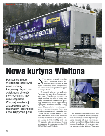 Technika Wielton Nowa kurtyna Wieltona Pod koniec lutego Wielton zaprezentował nową naczepę kurtynową. Pojazd ma zwiększoną objętość i wytrzymałość, przy mniejszej masie. W nowej konstrukcji zastosowano szereg materiałów i technologii z tzw. najwyższej półki. 48 N owa naczepa to przede wszystkim świeży i nowoczesny design. Wielton jednocześnie zapewnia, że nowy pojazd odznacza się wyższą wytrzymałością, jest bardziej szczelny, co pozytywnie wpływa na funkcjonalność. Na początek zajrzyjmy pod podwozie. Pierwsza w oko rzuca się perforowana, ażurowa rama. Zdecydowano się właśnie na taką konstrukcję, aby odciążyć nową „wieltonkę”. Jak zapewniał Mariusz Golec, pokazując komputerowy model wygenerowany w programie NASTRAN, rama tej naczepy nie ma słabych punktów, w kontekście problemów wytrzymałościowych. Sama rama została wykonana ze stali w gatunku 5700. Obrzeża boczne naczepy spawane są laserowo i dodatkowo walcowane. Te zabiegi pozwoliły na uzyskanie niskiej masy własnej naczepy, bo tylko 6160 kg, czyli o ok. 500 kg mniej niż poprzedniczka. Naczepa w standardzie oferowana jest na osiach SAF INTRADISC plusINTEGRAL. W strefach najbardziej narażonych na przenikanie wilgoci zastosowano wytrzymałe uszczelki Do budowy naczepy wykorzystano również lekkie i wytrzymałe materiały kompozytowe. Znajdziemy je w drzwiach portalowych, ścianie przedniej, odbojach przeciwrowerowych czy osłonach tylnych lamp. Zastosowanie kompozytów dodatnie wpływa na wytrzymałość nowego produktu Wieltonu. W naczepie Konstruktorzy nie zapomnieli o przeciwdeszczowych, antybryzgowych chlapaczach Pierwsza w oko rzuca się perforowana, ażurowa rama Nowe odboje antyrowerowe i praktyczna drabinka zastosowano wzmocnioną podłogę o grubości 30 mm, która pozwala przy załadunku na wjazd wózka widłowego o nacisku na oś 7200 kg. Producent wzmocnił także ścianę przednią spełniającą normę VDI. Naczepa jest bardzo szczelna, w strefach najbardziej narażonych na przenikanie wilgoci zastosowano wytrzymałe uszczelki, co skutecznie zapobiega zalewaniu ładunku. Dach od tyłu wyposażono w dodatkowy okap. Zadbano również o funkcjonalność naczepy, po- prawiając jej kubaturę załadunkową o 2 metry sześcienne (do 92 m. sześc.). Bardzo praktycznym rozwiązaniem jest możliwość ułożenia desek podczas załadunku i wyładunku na uchylnym odboju rowerowym. Także w łatwy sposób można odpiąć plandekę dachu w przedniej części i zsunąć ją do tyłu. Laska do przesuwania dachu zamontowana została w uchwytach po wewnętrznej stronie drzwi, co ochrania ją od niekorzystnych działań czynników atmosferycznych. Konstruktorzy nie zapomnieli o przeciwdeszczowych, antybryzgowych chlapaczach. Ściana przednia naczepy z kolei została wyposażona w przydatne elementy, jak skrzynki na gaśnicę, dokumenty czy uchwyt na linkę celną. Naczepa została przygotowana do profesjonalnego zabezpieczenia ładunku i spełnia restrykcyjną normę VDI. Nowe naczepy trafiają już do pierwszych klientów, a jej cena nie odbiega istotnie od ceny zakupu poprzedniczki. Zbigniew Witamborski 49