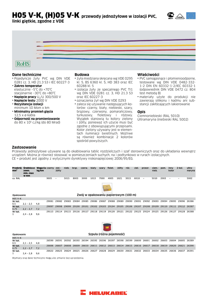 H05 V-K, (H)05 V-K przewody jednożyłowe w izolacji PVC, VDE linki giętkie, zgodne z VDE Dane techniczne ⦁P ojedyncze żyły PVC wg DIN VDE 0281 cz. 3, HD 21.3 S3 i IEC 60227-3 ⦁ Zakres temperatur elastycznie –5°C do +70°C stacjonarnie –30°C do +80°C ⦁ Napięcie pracy U0/U 300/500 V ⦁ Napięcie testu 2000 V ⦁ Rezystancja izolacji minimum 10 Mom x km ⦁ Minimalny promień gięcia 12,5 x ø kabla ⦁ Odporność na promieniowanie do 80 x 106 cJ/kg (do 80 Mrad) Budowa Właściwości ⦁ż yła miedziana skręcana wg VDE 0295 kl. 5, BS 6360 kl. 5, HD 383 oraz IEC 60288 kl. 5 ⦁ izolacja żyły ze specjalnego PVC TI1 wg DIN VDE 0281 cz. 3, HD 21.3 S3 oraz IEC 60227-3 ⦁ oznaczenia żył wg DIN VDE 0293 ⦁ zaleca się używanie następujących kolorów: czarny, biały, niebieski, szary, brązowy, czerwony, pomarańczowy, turkusowy, fioletowy i różowy. Wyjątek stanowią tu kolory zielony i żółty, ponieważ ich użycie musi być zgodne z obowiązującymi przepisami. Kolor zielony używany jest w elementach iluminacji świetlnych. Możliwe są również kombinacje 2 kolorów spośród powyższych. ⦁ PVC samogasnące i płomienioodporne, testowane wg DIN VDE 0482-3321-2 DIN EN 60332-1-2/IEC 60332-1 (odpowiednik DIN VDE 0472 cz. 804 test metodą B) ⦁ materiały użyte do produkcji nie zawierają silikonu i kadmu ani substancji zakłócających lakierowanie Opis Ciemnoniebieski (RAL 5010) Ultramaryna (niebieski RAL 5002) Zastosowanie Przewody jednożyłowe używane są do okablowania tablic rozdzielczych i szaf sterowniczych oraz do układania wewnątrz urządzeń. Można je również stosować w pomieszczeniach suchych, na i podtynkowo w rurach izolacyjnych. CE = produkt jest zgodny z wytycznymi dyrektywy niskonapięciowej 2006/95/EG. Przekrój Średnica ø Waga Cu czarny ziel.mm² zewn. kg/km żółty min.-max w mm Opakowanie nieb. brąz. czerw. biały szary fiolet. żółty Nr kat. Nr kat. Nr kat. Nr kat. Nr kat. ziel. Zwój w opakowaniu papierowym (100 m) Nr kat. Opakowanie róż. Szpula (różna pojemność) przezr. ciem.nieb. pom. inny kolor 2-kol. ultramaryna H05 V-K, (H)05 V-K przewody jednożyłowe w izolacji PVC, VDE linki giętkie, zgodne z VDE Przekrój Średnica ø Waga Cu czarny ziel.mm² zewn. kg/km żółty min.-max w mm Opakowanie Nr kat. Nr kat. Nr kat. nieb. brąz. czerw. biały szary fiolet. żółty Beczka (różna pojemność) róż. ziel. przezr. ciem.nieb. pom. inny kolor 2-kol. ultramaryna