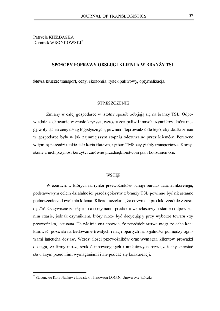 JOURNAL OF TRANSLOGISTICS 57 Patrycja KIEŁBASKA Dominik WRONKOWSKI* SPOSOBY POPRAWY OBSŁUGI KLIENTA W BRANŻY TSL Słowa klucze: transport, ceny, ekonomia, rynek paliwowy, optymalizacja. STRESZCZENIE Zmiany w całej gospodarce w istotny sposób odbijają się na branży TSL. Odpowiednie zachowanie w czasie kryzysu, wzrostu cen paliw i innych czynników, które mogą wpłynąć na ceny usług logistycznych, powinno doprowadzić do tego, aby skutki zmian w gospodarce były w jak najmniejszym stopniu odczuwalne przez klientów. Pomocne w tym są narzędzia takie jak: karta flotowa, system TMS czy giełdy transportowe. Korzystanie z nich przynosi korzyści zarówno przedsiębiorstwom jak i konsumentom. WSTĘP W czasach, w których na rynku przewoźników panuje bardzo duża konkurencja, podstawowym celem działalności przedsiębiorstw z branży TSL powinno być nieustanne podnoszenie zadowolenia klienta. Klienci oczekują, że otrzymają produkt zgodnie z zasadą 7W. Oczywiście zależy im na otrzymaniu produktu we właściwym stanie i odpowiednim czasie, jednak czynnikiem, który może być decydujący przy wyborze towaru czy przewoźnika, jest cena. To właśnie ona sprawia, że przedsiębiorstwa mogą ze sobą konkurować, pozwala na budowanie trwałych relacji opartych na lojalności pomiędzy ogniwami łańcucha dostaw. Wzrost ilości przewoźników oraz wymagań klientów prowadzi do tego, że firmy muszą szukać innowacyjnych i unikatowych rozwiązań aby sprostać stawianym przed nimi wymaganiami i nie poddać się konkurencji. * Studenckie Koło Naukowe Logistyki i Innowacji LOGIN, Uniwersytet Łódzki 58 JOURNAL OF TRANSLOGISTICS W celu obniżenia kosztów transportu należy poszukać obszarów, w których traci się duże sumy pieniędzy i podjąć próby ich minimalizacji. Jednym z takich obszarów mogą być koszty paliw. Na przestrzeni kilkunastu ostatnich lat opracowano szereg innowacyjnych metod, które pozwalają obniżyć koszty lub zużycie paliwa lub w inny sposób zoptymalizować procesy transportu. 1. SYTUACJA NA RYNKU PALIWOWYM W POLSCE I SPOSOBY MINIMALIZACJI WPŁYWU CEN PALIWA NA KOSZTY TRANSPORTU 1.1 WPŁYW CEN PALIW NA KOSZTY TRANSPORTU Wahania cen paliw to problem generujący duże koszty. Zwykli kierowcy narzekają na cenę paliw. W przypadku firm transportowych jest to jeszcze większy problem, ponieważ minimalna podwyżka powoduje duży wzrost kosztów. Ceny paliwa na rynku mają największy wpływ na koszty materiałów pędnych i eksploatacyjnych. Poziom tych cen istotnie wpływa na rentowność firmy przewozowej. Ceny materiałów pędnych i eksploatacyjnych w styczniu 2016 r. wynosiły 33% całkowitego kosztu. Koszty te zazwyczaj są największą częścią całkowitej ceny jednego wozokilometra. Rys. 1 Ceny paliwa w Polsce za ON Źródło: http://moto.money.pl/ceny-paliw/#polska,0,olej_napedowy dostęp 07.11.2016r. JOURNAL OF TRANSLOGISTICS 59 Jak widać w marcu cena za paliwo jest na bardzo dobrym poziomie, lecz w październiku można zobaczyć znaczny wzrost za czym idą większe koszty dla pracodawców. 1.2 KARTA FLOTOWA Karta flotowa, zwana również plastikowym pieniądzem, jest rewelacyjnym sposobem na rozwiązanie prawie wszystkich podstawowych problemów zakupowych, takich jak paliwo, ale również opłaty za myto, autostrady, części wymienne czy pomoc w przypadku awarii. Posiadanie takiej karty jest komfortowe dla pracownika i dla pracodawcy, który ma możliwość obserwacji drogi swojego pracownika poprzez wgląd do odcinków dróg płatnych, po których poruszał się dany kierowca. Posiadasz karty ma również możliwość lustrowania statusu zwrotu podatku VAT, może dokonywać licznych raportów i zestawień w specjalnych programach. Użytkownik może również na bieżąco obserwować wydatki w trasie, a gdy zajdzie potrzeba, za pomocą strony internetowej blokuje lub udostępnia usługi. Bezpłatne serwisy on-line pokazują punkty na trasie, w których jest najniższa cena za paliwo. Kolejną korzyścią są rabaty, wystarczy tylko współpracować z jednym operatorem. Im większa ilość zakupionego paliwa u danego operatora, tym większy rabat. 2. SPOSOBY OPTYMALIZACJI TRANSPORTU Pod pojęciem optymalizacji kryją się wszelkie dostępne metody redukcji czasu, odległości oraz kosztów transportu, a także sposoby na podnoszenie jego jakości. 2.1 MINIMALIZACJA PUSTYCH PRZEBIEGÓW Puste przebiegi to bardzo popularny przykład marnotrawstwa w branży TSL. Każdy centymetr kwadratowy wolnej powierzchni ładunkowej to zmarnowana szansa na zysk, który w dodatku generuje koszty, których nie uda się już odzyskać. Sposobem na redukcję pustych przebiegów jest wydajne planowanie transportu. Gdy odpowiednio szybko zauważy się wolne miejsce w przestrzeni ładunkowej, można poszukać ładunku drobnicowego, który ją wypełni. Z pomocą dla przedsiębiorstw logistycznych przychodzą giełdy transportowe, które pozwalają na wyszukanie frachtu pasującego do realizowanej trasy. Pozwala to uniknąć dodatkowych kosztów oraz zapewnić przedsiębiorstwu dodatkowy dochód. Powszechnie uważa się, że abonament za korzystanie z giełdy transportowej to dość kosztowna kwestia i niektórzy przedsiębiorcy rezygnują z używania tego narzędzia, jednak 60 JOURNAL OF TRANSLOGISTICS korzyści finansowe, jakie można dzięki niemu otrzymać, są zdecydowanie większe niż wysokość uiszczonej opłaty. 2.2 TRADE OFF Relacja typu trade-off (coś za coś) to dążenie do ładu pomiędzy transportem a zapasami. W logistyce idea ta związana jest z zarządzaniem procesami i zasobami. Jeśli dane działanie wykazuje korzyść systemu jako całości, to warto brnąć w to dalej. Jeśli występuje korzyść w jednej części systemu na niekorzyść drugiej części, wtedy wypadałoby zrezygnować z działania. Przykładem może być oferowanie wysokiego poziomu obsługi klienta, lecz wtedy musimy się pogodzić ze wzrostem kosztów np. transport