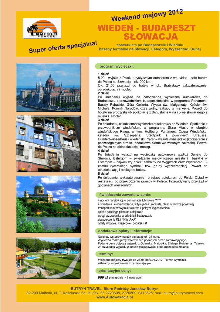 y 2012 w o j a m d Weeken WIEDEÑ - BUDAPESZT S£OWACJA spacerkiem po Budapeszcie i Wiedniu jalna! c e p s a t r e baseny termalne na S³owacji, Estegom, Wyszehrad, Dunaj f o r e Sup program wycieczki: 1 dzieñ 5.00 - wyjazd z Polski turystycznym autokarem z wc, video i cafe-barem do Patinc na S³owacjê – ok. 900 km. Ok. 21.00 przyjazd do hotelu w ok. Bratys³awy zakwaterowanie, obiadokolacja i nocleg, 2 dzieñ Po œniadaniu wyjazd na ca³odzienn¹ wycieczkê autokarow¹ do Budapesztu z przewodnikiem budapeszteñskim, w programie: Parlament, Baszty Rybackie, Góra Gellerta, Wyspa œw. Ma³gorzaty, Koœció³ œw. Micha³a, Pomnik Narodów, czas wolny, zakupy w markecie. Powrót do hotelu na uroczyst¹ obiadokolacjê z degustacj¹ wina i piwa s³owackiego z muzyk¹. Nocleg. 3 dzieñ Po œniadaniu, ca³odzienna wycieczka autokarowa do Wiednia. Spotkanie z przewodnikiem wiedeñskim, w programie: Stare Miasto w obrêbie wiedeñskiego Ringu, w tym: Hoffburg, Parlament, Opera Wiedeñska, katedra œw. Szczepana, Stadtpark z pomnikiem Straussa, Hundertwasserhaus i wiedeñski Prater – weso³e miasteczko (korzystanie z poszczególnych atrakcji dodatkowo p³atne we w³asnym zakresie). Powrót do Patinc na obiadokolacjê i nocleg. 4 dzieñ Po œniadaniu wyjazd na wycieczkê autokarow¹ wzd³u¿ Dunaju do Sturowa, Estergom – zwiedzanie malowniczego miasta i bazyliki w Estergom – najwiêkszy obiekt sakralny na Wêgrzech oraz Wyszehradu – zamku rycerskiego symbolu tzw. grupy wyszehradzkiej. Powrót na obiadokolacjê i nocleg do hotelu. 5 dzieñ Po œniadaniu, wykwaterowanie i przejazd autokarem do Polski. Obiad w restauracji po przekroczeniu granicy w Polsce. Przewidywany przyjazd w godzinach wieczornych. œwiadczenia zawarte w cenie: 4 noclegi na S³owacji w pensjonacie lub hotelu **/*** 4 œniadania i 4 obiadokolacje, w tym jedna uroczysta, obiad w drodze powrotnej transport komfortowym autokarem z pe³nym wyposa¿eniem opieka polskiego pilota na ca³ej trasie us³ugi przewodnika w Wiedniu i Budapeszcie ubezpieczenie KL i NNW „AXA” op³aty drogowe, miejscowe i podatek vat dodatkowe op³aty i informacje: Na bilety wstêpów nale¿y posiadaæ ok. 35 euro. Wycieczki realizujemy w terminach podanych przez zamawiaj¹cego. Podane ceny dotycz¹ wyjazdu z Gdañska, Malborka, Elbl¹ga, Kwidzyna i Tczewa. W przypadku wyjazdu z innych miejscowoœci cena mo¿e ulec zmianie. terminy: Weekend majowy trwa ju¿ od 28.04 do 6.05.2012. Termin wycieczki ustalamy indywidualnie z zamawiaj¹cym. orientacyjne ceny: 999 z³ przy grupie 45 osobowej BUTRYN TRAVEL Biuro Podró¿y Jaros³aw Butryn 82-200 Malbork, ul. T. Koœciuszki 5e; tel./fax. 55 2720808, 2720809, 6473525; mail: [email protected] www.Autowakacje.pl