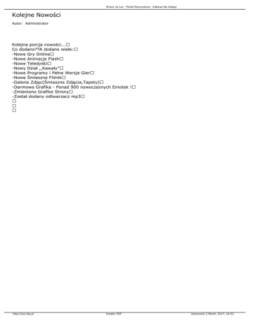 Wrzuć na Luz - Portal Rozrywkowy -Zabawa Na Całego Kolejne Nowości Autor: Administrator Kolejna porcja nowości... Co dodano??A dodano wiele: -Nowe Gry Online -Nowe Animacje Flash -Nowe Teledyski -Nowy Dział ,,Kawały" -Nowe Programy i Pełne Wersje Gier -Nowe Śmieszne Filmik -Galeria Zdjęc(Śmieszne Zdjęcia,Tapety) -Darmowa Grafika - Ponad 900 nowoczesnych Emotek ! -Zmieniono Grafike Strony -Został dodany odtwarzacz mp3 http://luz.cba.pl Kreator PDF Utworzono 2 March, 2017, 16:53