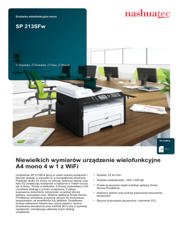 Drukarka wielofunkcyjna mono SP 213SFw Kopiarka Drukarka Faks Skaner SP 213SFw 22 str./m Niewielkich wymiarów urządzenie wielofunkcyjne A4 mono 4 w 1 z WiFi Urządzenie SP 213SFw łączy w sobie wysoką wydajność i łatwość obsługi, a wszystko to w kompaktowej obudowie. Prędkość druku 22 strony na minutę, kolorowy skaner oraz faks G3 zwiększają wydajność urządzenia w małym biurze lub w domu. Prosty w obsłudze, 4-liniowy wyświetlacz LCD umożliwia obsługę z przodu urządzenia. Funkcja kopiowania dokumentu tożsamości na jednej stronie papieru, oszczędza czas. Mobilna aplikacja Smart Device Print&Scan umożliwia wysyłanie danych do drukowania bezpośrednio ze smartfonów lub tabletów. Dodatkowo funkcje odbierania faksów bez użycia papieru, ręczne drukowanie dwustronne oraz kartridż all-in-one o wysokiej wydajności, zmniejszają całkowity koszt obsługi urządzenia. Szybkie: 22 str./min. Wysoka rozdzielczość: 1200 x 600 dpi Proste drukowanie dzięki mobilnej aplikacji Smart Device Print&Scan Kolorowy skaner oraz funkcja kopiowania dokumentu tożsamości Ręczne drukowanie dwustronne i sterownik PCL Mono Specyfikacja techniczna SP 213SFw Kompatybilność: OGÓLNE Czas nagrzewania: 27 sekund Prędkość wykonania pierwszej kopii: Prędkość wydruku ciągłego: 10 sekundy 22 stron na minutę Pamięć: 16 MB Cykl duty: 20 000 wydruków miesięcznie Drukowanie dwustronne: Tak Wymiary (szer. x gł. x wys.): 402 x 360 x 293 mm Waga: 11,1 kg Źródło zasilania: 220 - 240 V, 50/60 Hz KOPIARKA Kopiowanie wielokrotne: 300 dpi, 600 x 600 dpi Zoom: Od 25% do 400% co 1% DRUKARKA Język drukarki: Maksymalnie: 33,6 Kbps OBSŁUGIWANY PAPIER Zalecany rozmiar papieru: Pojemność wejściowa papieru: Maksymalnie: 151 arkuszy Maksymalnie: 50 arkuszy Gramatura papieru: Standardowa/e kaseta/y na papier: 60 - 105 g/m² Taca ręczna: 60 - 105 g/m² ADF: 52 - 105 g/m² EKOLOGIA Pobór mocy: Rozdzielczość drukowania: 600 x 600 dpi, 1 200 x 600 dpi PCL (80 czcionek) Interfejs: USB 2.0 Bezprzewodowa sieć LAN (IEEE 802.11b/g/n) Windows® XP Windows® Vista Windows® 7 Windows® 8 Windows® 8.1 Windows® Server 2003 Windows® Server 2003R2 Windows® Server 2008 Windows® Server 2008R2 Windows® Server 2012 Windows® Server 2012R2 A4 A5 A6 B5 B6 Pojemność wyjściowa papieru: PCL6 Czcionki: Środowiska Windows®: G3: 3 sek. Prędkość modemu: Do 99 kopii Rozdzielczość: G3 Prędkość transmisji: Maksymalnie: 400 W Tryb gotowości: 65 W Tryb uśpienia: 5 W MATERIAŁY EKSPLOATACYJNE All-in-one cartridge capacity (regular yield): All-in-one cartridge capacity (duża wydajność): Zestaw startowy: Black: 1 500 prints Czarny: 2 600 wydruków Czarny: 1 000 wydruków Prędkość kopiowania: Niemcy 14 kop./min., Belgia i Austria 9 kop./min. Metoda pomiaru wydajności ISO/IEC 19752. W celu potwierdzenia dostępności modeli, opcji i oprogramowania prosimy skontaktować się z lokalnym autoryzowanym dostawcą produktów Nashuatec. SKANER Rozdzielczość: Maksymalnie: 300 dpi Rozmiar oryginału: A4 Sterowniki standardowe: Sieciowy TWAIN, WIA FAKS Certyfikaty ISO14001, ISO9001, ISO27001 Wszystkie marki i/lub produkty są nazwami handlowymi ich właścicieli. Specyfikacja i wygląd zewnętrzny mogą ulec zmianie bez uprzedniej informacji. Kolor produktu może różnić się od przedstawionego w broszurze. Zdjęcia w broszurze nie są prawdziwymi fotografiami i w wyglądzie mogą pojawić się niewielkie różnice. www.nashuatec.pl Copyright © 2014 Ricoh Europe PLC. All rights reserved. Broszura, jej zawartość i/lub wygląd nie mogą być zmieniane, adoptowane, kopiowane w części i/lub całości ani używane w innych opracowaniach bez pisemnej zgody Ricoh Europe PLC.