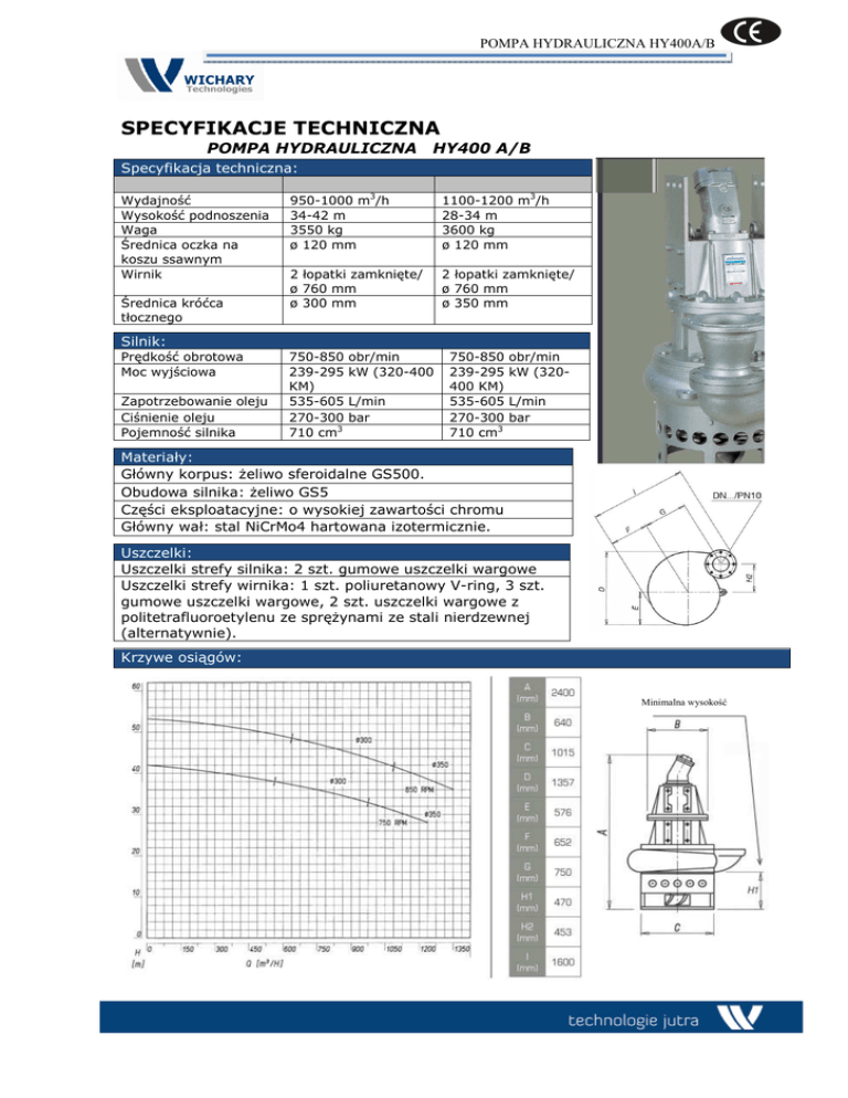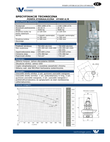 POMPA HYDRAULICZNA HY400A/B SPECYFIKACJE TECHNICZNA POMPA HYDRAULICZNA HY400 A/B Specyfikacja techniczna: Wydajność Wysokość podnoszenia Waga Średnica oczka na koszu ssawnym Wirnik Średnica króćca tłocznego 950-1000 m3/h 34-42 m 3550 kg ø 120 mm 1100-1200 m3/h 28-34 m 3600 kg ø 120 mm 2 łopatki zamknięte/ ø 760 mm ø 300 mm 2 łopatki zamknięte/ ø 760 mm ø 350 mm Silnik: Prędkość obrotowa Moc wyjściowa Zapotrzebowanie oleju Ciśnienie oleju Pojemność silnika 750-850 239-295 KM) 535-605 270-300 710 cm3 obr/min kW (320-400 L/min bar 750-850 239-295 400 KM) 535-605 270-300 710 cm3 obr/min kW (320L/min bar Materiały: Główny korpus: Ŝeliwo sferoidalne GS500. Obudowa silnika: Ŝeliwo GS5 Części eksploatacyjne: o wysokiej zawartości chromu Główny wał: stal NiCrMo4 hartowana izotermicznie. Uszczelki: Uszczelki strefy silnika: 2 szt. gumowe uszczelki wargowe Uszczelki strefy wirnika: 1 szt. poliuretanowy V-ring, 3 szt. gumowe uszczelki wargowe, 2 szt. uszczelki wargowe z politetrafluoroetylenu ze spręŜynami ze stali nierdzewnej (alternatywnie). Krzywe osiągów: Minimalna wysokość