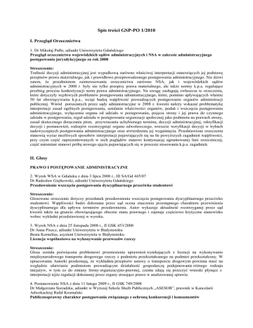 Spis treści GSP-PO 1/2010 I. Przegląd Orzecznictwa 1. Dr Mikołaj Pułło, adiunkt Uniwersytetu Gdańskiego Przegląd orzecznictwa wojewódzkich sądów administracyjnych i NSA w zakresie administracyjnego postępowania jurysdykcyjnego za rok 2008 Streszczenie: Trafność decyzji administracyjnej jest wypadkową zarówno właściwej interpretacji stanowiących jej podstawę przepisów prawa materialnego, jak i prawidłowo przeprowadzonego postępowania administracyjnego. Nie dziwi zatem, że przedmiotem zainteresowania orzecznictwa zarówno NSA, jak i wojewódzkich sądów administracyjnych w 2008 r. były nie tylko przepisy prawa materialnego, ale także normy k.p.a. regulujące przebieg procesu konkretyzacji norm prawa administracyjnego. Na uwagę zasługują zwłaszcza te orzeczenia, które dotyczyły węzłowych problemów postępowania administracyjnego, które, pomimo upływających właśnie 50 lat obowiązywania k.p.a., wciąż budzą wątpliwość prowadzących postępowanie organów administracji publicznej. Wśród poruszanych przez sądy administracyjne w 2008 r. kwestii należy wskazać problematykę interpretacji zasad ogólnych postępowania, ustalania właściwości organów, podań i wszczęcia postępowania administracyjnego, wyłączenia organu od udziału w postępowaniu, pojęcia strony i jej prawa do czynnego udziału w postępowaniu, reguł udziału w postępowaniu organizacji społecznej jako podmiotu na prawach strony, zasad skutecznego doręczania pism, przywracania uchybionego terminu, decyzji administracyjnej, rektyfikacji decyzji i postanowień, rodzajów rozstrzygnięć organu odwoławczego, wreszcie weryfikacji decyzji w trybach nadzwyczajnych postępowania administracyjnego oraz stwierdzenia jej wygaśnięcia. Przedstawione orzeczenia stanowią wyraz możliwych sposobów interpretacji pojawiających się na tle powyższych zagadnień wątpliwości, przy czym część zaprezentowanych w nich poglądów stanowi kontynuację ugruntowanej linii orzeczniczej, część natomiast stanowi próbę nowego ujęcia pojawiających się w procesie stosowania k.p.a. zagadnień. II. Glosy PRAWO I POSTĘPOWANIE ADMINISTRACYJNE 2. Wyrok WSA w Gdańsku z dnia 3 lipca 2008 r., III SA/Gd 445/07 Dr Radosław Giętkowski, adiunkt Uniwersytetu Gdańskiego Przedawnienie wszczęcia postępowania dyscyplinarnego przeciwko studentowi Streszczenie: Glosowane orzeczenie dotyczy przesłanek przedawnienia wszczęcia postępowania dyscyplinarnego przeciwko studentowi. Wątpliwości budzi dokonana przez sąd ocena znaczenia przestępnego charakteru przewinienia dyscyplinarnego dla upływu terminów przedawnienia. Autor wykazuje aktualność rozstrzyganej przez sąd kwestii także na gruncie obowiązującego obecnie stanu prawnego i zajmuje częściowo krytyczne stanowisko wobec wykładni przedstawionej w wyroku. 3. Wyrok NSA z dnia 25 listopada 2008 r., II GSK 453/2008 Dr Anna Piszcz, adiunkt Uniwersytetu w Białymstoku Beata Kornelius, asystent Uniwersytetu w Białymstoku Licencja wspólnotowa na wykonywanie przewozów rzeczy Streszczenie: Glosa została poświęcona problemowi przeniesienia uprawnień wynikających z licencji na wykonywanie międzynarodowego transportu drogowego rzeczy z podmiotu przekształcanego na podmiot przekształcony. W opracowaniu Autorki przekonują, że wykładnia przepisów ustawy o transporcie drogowym powinna mieć na względzie ułatwianie podmiotom prowadzącym działalność gospodarczą podejmowanie różnego rodzaju inicjatyw, w tym co do zmiany formy organizacyjno-prawnej, czemu zdają się przeczyć wnioski płynące z interpretacji tejże regulacji dokonanej przez organy stosujące prawo w analizowanej sprawie. 4. Postanowienie NSA z dnia 11 lutego 2009 r., II GSK 749/2008 Dr Małgorzata Sieradzka, adiunkt w Wyższej Szkole Służb Publicznych „ASESOR”, prawnik w Kancelarii Adwokackiej Rafał Kosmalski Publicznoprawny charakter postępowania związanego z ochroną konkurencji i konsumentów Streszczenie: W glosowanym postanowieniu Naczelny Sąd Administracyjny wypowiedział się co do istoty postępowania w sprawach ochrony konkurencji i konsumentów. W jego ramach wyróżnił fazę administracyjną, którą nazwał ,,przedinstacją sądową” oraz cywilną. W pierwszej fazie mamy do czynienia z postępowaniem administracyjnym, ale w zakresie wzruszenia wydanych w nim rozstrzygnięć następuje wyłączenie stosowania trybu administracyjnego oraz sądowo administracyjnego. Istotne znaczenie z punktu widzenia konsekwencji glosowanego postanowienia ma także wskazanie, iż niezależnie od fazy postępowania sprawa antymonopolowa nadal zachowuje ona swój publiczny charakter. 5. Wyrok WSA w Warszawie z dnia 21 maja 2008 r., I SA/Wa 1778/07 Radosław Skwarło, radca prawny, Wejherowo Organ wyższego stopnia w sprawie przekształcenia prawa użytkowania wieczystego w prawo własności nieruchomości Streszczenie: W komentowanym wyroku WSA w Warszawie stanął na stanowisku, że wojewoda jest organem wyższego stopnia wobec starosty orzekającego o przekształceniu prawa użytkowania wieczystego w prawo własności nieruchomości na podstawie ustawy z 29 lipca 2005 r. Wniosek ten jest błędny. Naczelny Sąd Administracyjny kilkakrotnie już orzekł, że w takich sprawach organem wyższego stopnia wobec starosty jest samorządowe kolegium odwoławcze. WSA w sposób nieuprawniony posłużył się analogią z ustawy o gospodarce nieruchomościami, choć kodeks postępowania administracyjnego jednoznacznie wskazuje samorządowe kolegium odwoławcze jako organ wyższego stopnia wobec starosty, o ile przepis szczególny nie stanowi inaczej. PRAWO I POSTĘPOWANIE CYWILNE, PRAWO HANDLOWE 6. Uchwała SN z dnia 22 maja 2009 r., III CZP 21/09 Dr Anna Sylwestrzak, adiunkt Uniwersytetu Gdańskiego Dyssymulowana umowa dożywocia Streszczenie: Ukrycie umowy dożywocia pod pozorną umową innego typu (np. pod symulowaną umową sprzedaży nieruchomości), skutkuje