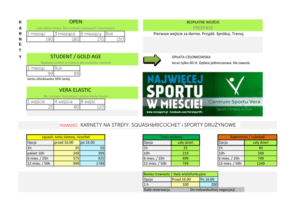 K OPEN BEZPŁATNE WEJŚCIE A R N E Cała oferta klubu. Bez limitów czasowych i ilościowych FREEPASS Pierwsze wejście za darmo. Przyjdź. Spróbuj. Trenuj. T Y STUDENT / GOLD AGE Najlepszy pakiet w mieście dla studenta i seniora OPŁATA CZŁONKOWSKA teraz tylko 60 zł. Opłata jednorazowa. Na zawsze. karta członkowska 50% taniej VERA ELASTIC Bez umowy. Korzystasz i płacisz kiedy chcesz squash, tenis ziemny, ricochet Opcja przed 16.00 po 16.00 1h 35 50 pakiet 10h 249 399 6 mies. / 25h 575 925 12 mies. / 50h 999 1749 Tenis stołowy Opcja caly dzień 1h 25 10h 219 6 mies. / 25h 499 12 mies. / 50h 749 Badminton / cubeball Opcja caly dzień 1h 40 10h 349 6 mies. / 25h 749 12 mies. / 50h 1249 Boiska trawiaste | Hala wielofunkcyjna Opcja Przed 16.00 Po 16.00 1h 100 200 Stała rezerwacja Do indywidualnej negocjacji