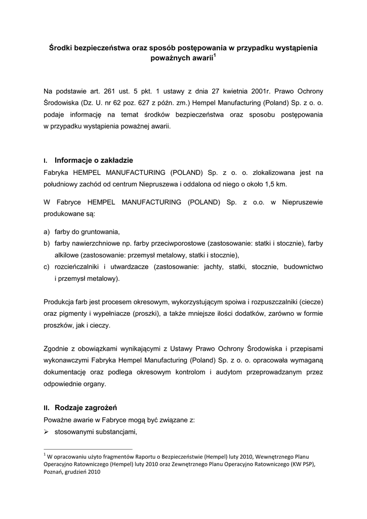 Środki bezpieczeństwa oraz sposób postępowania w przypadku wystąpienia poważnych awarii1 Na podstawie art. 261 ust. 5 pkt. 1 ustawy z dnia 27 kwietnia 2001r. Prawo Ochrony Środowiska (Dz. U. nr 62 poz. 627 z późn. zm.) Hempel Manufacturing (Poland) Sp. z o. o. podaje informację na temat środków bezpieczeństwa oraz sposobu postępowania w przypadku wystąpienia poważnej awarii. I. Informacje o zakładzie Fabryka HEMPEL MANUFACTURING (POLAND) Sp. z o. o. zlokalizowana jest na południowy zachód od centrum Niepruszewa i oddalona od niego o około 1,5 km. W Fabryce HEMPEL MANUFACTURING (POLAND) Sp. z o.o. w Niepruszewie produkowane są: a) farby do gruntowania, b) farby nawierzchniowe np. farby przeciwporostowe (zastosowanie: statki i stocznie), farby alkilowe (zastosowanie: przemysł metalowy, statki i stocznie), c) rozcieńczalniki i utwardzacze (zastosowanie: jachty, statki, stocznie, budownictwo i przemysł metalowy). Produkcja farb jest procesem okresowym, wykorzystującym spoiwa i rozpuszczalniki (ciecze) oraz pigmenty i wypełniacze (proszki), a także mniejsze ilości dodatków, zarówno w formie proszków, jak i cieczy. Zgodnie z obowiązkami wynikającymi z Ustawy Prawo Ochrony Środowiska i przepisami wykonawczymi Fabryka Hempel Manufacturing (Poland) Sp. z o. o. opracowała wymaganą dokumentację oraz podlega okresowym kontrolom i audytom przeprowadzanym przez odpowiednie organy. II. Rodzaje zagrożeń Poważne awarie w Fabryce mogą być związane z: stosowanymi substancjami, 1 W opracowaniu użyto fragmentów Raportu o Bezpieczeostwie (Hempel) luty 2010, Wewnętrznego Planu Operacyjno Ratowniczego (Hempel) luty 2010 oraz Zewnętrznego Planu Operacyjno Ratowniczego (KW PSP), Poznao, grudzieo 2010 operacjami procesowymi oraz transportem wewnątrzzakładowym, rozmieszczeniem urządzeń i obiektów w obrębie Fabryki. Produkcja farb, past i rozcieńczalników polega na komponowaniu danego wyrobu z surowców, którymi są substancje ciekłe i sproszkowane. Stosowane substancje ciekłe są w większości łatwopalne lub stwarzające zagrożenie dla środowiska. Zagrożenia powodują również substancje sproszkowane, w tym proszki metaliczne (cynku, miedzi). Zagrożenia wynikają z operacji rozładunku i magazynowania w/w surowców, ich transportu z magazynów do budynku produkcyjnego, produkcji oraz magazynowania wyrobów gotowych. Zastosowane środki organizacyjne i techniczne w Fabryce HEMPEL MANUFACTURING (POLAND) Sp. z o. o. w Niepruszewie w zakresie zapobiegania i ochrony przed skutkami poważnych awarii, gwarantujące ochronę ludzi i mienia, są wynikiem systemowego podejścia do problematyki bezpieczeństwa całej Grupie HEMPEL. Zgodnie z zobowiązaniami określonymi w polityce zarządzania bezpieczeństwem, higieną pracy i ochroną środowiska w Grupie HEMPEL, zapobieganie i ochrona przed skutkami poważnych awarii w Fabryce HEMPEL MANUFACTURING (POLAND) Sp. z o. o. w Niepruszewie są realizowane w sposób kompleksowy. III. Sposoby powiadamiania i alarmowania na wypadek wystąpienia poważnych awarii Informowanie ludności odbywa się: - stan normalnego funkcjonowania instalacji Przekazanie podstawowych informacji o Fabryce, objaśnienie rodzaju prowadzonej działalności, potwierdzenia, że Fabryka podlega regulacjom prawnym, przedstawienie ogólnych informacji o charakterze zagrożenia poważną awarią przemysłową - stan awarii przemysłowej Przekazanie informacji w przypadku wystąpienia awarii, zasad zachowania ludności oraz działań, jakie ludność powinna podjąć w przypadku wystąpienia poważnej awarii Powiadamianie ludności o rodzaju alarmu oraz jego odwołaniu może być realizowane za pomocą syren, rozgłoszeniowych. lokalnych rozgłośni radiowych, ośrodków TVP oraz urządzeń Ogólne procedury zachowania się w przypadku usłyszenia alarmu Alarm o klęskach żywiołowych i zagrożeniu środowiska Po usłyszeniu sygnału alarmu o klęskach żywiołowych i zagrożeniu środowiska: 1. Nie zbliżaj się do rejonu katastrofy 2. Przebywając na terenie otwartym - opuść zagrożony teren - postępuj zgodnie z poleceniami zawartymi w komunikatach radiowych, telewizyjnych lub przekazywanych przez ruchome środki nagłaśniające 3. Przebywając w domu, biurze, sklepie itp. - włącz odbiornik radiowy lub telewizyjny na częstotliwości stacji lokalnej - wysłuchaj nadanych komunikatów i zasad postępowania w zaistniałej sytuacji - bezwzględnie wykonuj przekazane polecenia Alarm o skażeniach Po usłyszeniu alarmu o skażeniach 1. Przebywając na terenie otwartym - zwróć uwagę na kierunek wiatru - opuść zagrożony teren prostopadle do kierunku wiatru 2. Przebywając w pomieszczeniach - włącz odbiornik radiowy lub telewizyjny na pasmo lokalnej stacji i stosuj się ściśle do poleceń wydanych przez władze lokalne lub służby ratownicze - uszczelnij otwory okienne i wentylacyjne oraz drzwi mokrym papierem, tkaniną lub oklej taśmą - chroń drogi oddechowe. Wykonaj filtr ochronny z dostępnych materiałów (zwilżona w wodzie lub roztworze sody oczyszczonej chusteczka, tampon, ręcznik, szalik itp.) Pamiętaj Najczęstszą przyczyną uwolnienia niebezpiecznych substancji chemicznych są: - awarie w obiektach przemysłowych - rozszczelnienia rurociągów przemysłowych - wypadki cystern kolejowych oraz samochodowych Zapobiegawczo zadbaj, by w twoim domu zawsze znajdowały się przedmioty niezbędne dla ciebie, twoich bliskich i podopiecznych w przypadku wystąpienia zdarzenia niebezpiecznego: - radioodbiornik zasilany bateriami - latarki - zapasowe baterie - sprzęt ochrony dróg oddechowych - apteczka pierwszej pomocy - gaśnica W przypadku ostrzeżenia o możliwości wystąpienia zagrożenia dodatkowo: - żywność na okres 3- 5 dni - woda w ilości 5 litrów na osobę na okres 3- 5 dni - środki higieny - odzież i rzeczy do spania Jak powinieneś zachować się w sytuacji zagrożenia? Działaj szybko, bez paniki Cały czas słu